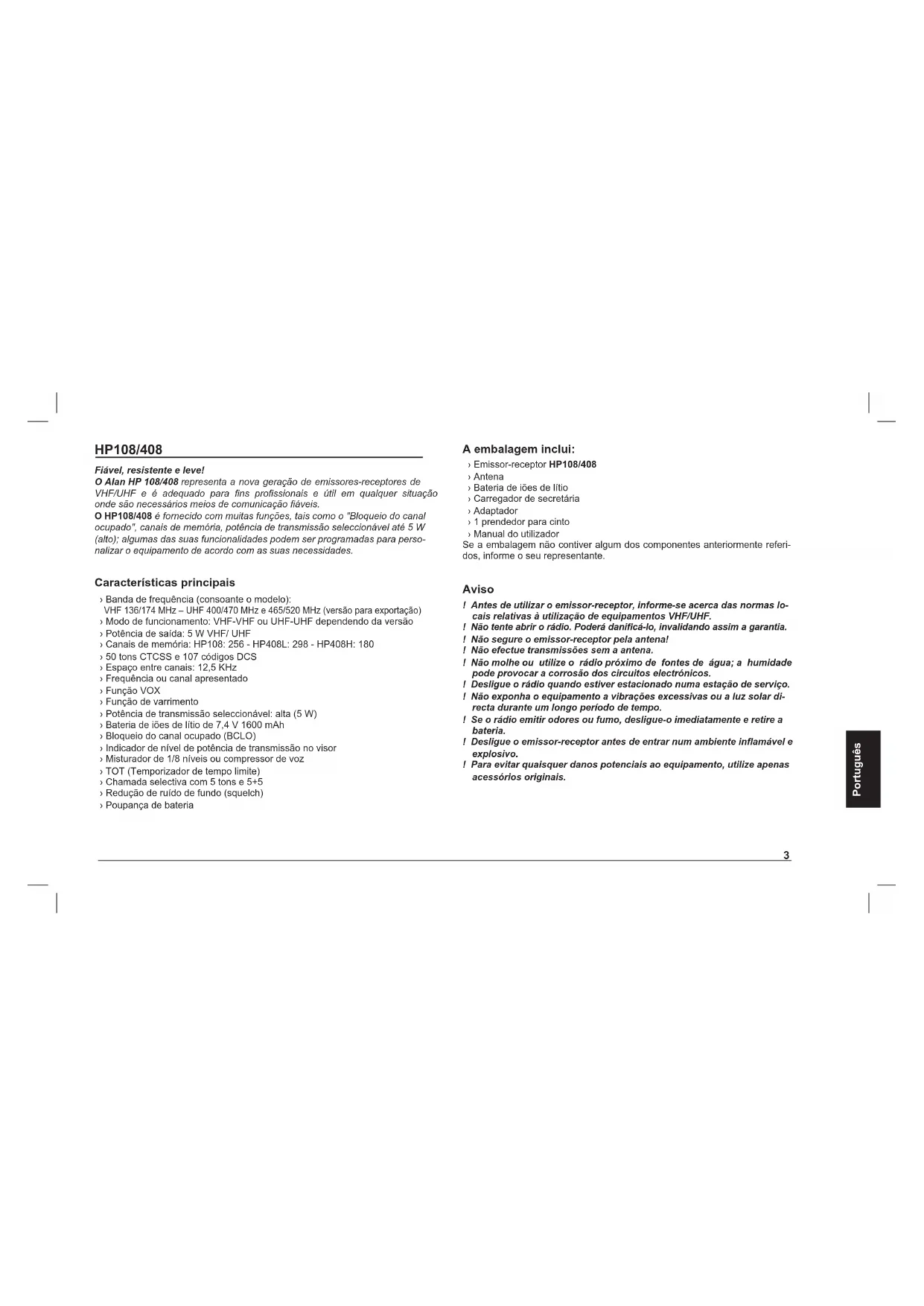 HP108/408 Fiável, resistente e leve! O Alan HP 108/408 representa a nova geração de emissores-receptores de VHF/UHF e é adequado para ns prossionais e útil em qualquer situação onde são necessários meios de comunicação áveis. O HP108/408 é fornecido com muitas funções, tais como o "Bloqueio do canal ocupado", canais de memória, potência de transmissão seleccionável até 5 W (alto); algumas das suas funcionalidades podem ser programadas para perso- nalizar o equipamento de acordo com as suas necessidades. Características principais › Banda de frequência (consoante o modelo): VHF 136/174 MHz – UHF 400/470 MHz e 465/520 MHz (versão para exportação) › Modo de funcionamento: VHF-VHF ou UHF-UHF dependendo da versão › Potência de saída: 5 W VHF/ UHF › Canais de memória: HP108: 256 - HP408L: 298 - HP408H: 180 › 50 tons CTCSS e 107 códigos DCS › Espaço entre canais: 12,5 KHz › Frequência ou canal apresentado › Função VOX › Função de varrimento › Potência de transmissão seleccionável: alta (5 W) › Bateria de iões de lítio de 7,4 V 1600 mAh › Bloqueio do canal ocupado (BCLO) › Indicador de nível de potência de transmissão no visor › Misturador de 1/8 níveis ou compressor de voz › TOT (Temporizador de tempo limite) › Chamada selectiva com 5 tons e 5+5 › Redução de ruído de fundo (squelch) › Poupança de bateria A embalagem inclui: › Emissor-receptor HP108/408 › Antena › Bateria de iões de lítio › Carregador de secretária › Adaptador › 1 prendedor para cinto › Manual do utilizador Se a embalagem não contiver algum dos componentes anteriormente referi- dos, informe o seu representante. Aviso ! Antes de utilizar o emissor-receptor, informe-se acerca das normas lo- cais relativas à utilização de equipamentos VHF/UHF. ! Não tente abrir o rádio. Poderá danicá-lo, invalidando assim a garantia. ! Não segure o emissor-receptor pela antena! ! Não efectue transmissões sem a antena. ! Não molhe ou utilize o rádio próximo de fontes de água; a humidade pode provocar a corrosão dos circuitos electrónicos. ! Desligue o rádio quando estiver estacionado numa estação de serviço. ! Não exponha o equipamento a vibrações excessivas ou a luz solar di- recta durante um longo período de tempo. ! Se o rádio emitir odores ou fumo, desligue-o imediatamente e retire a bateria. ! Desligue o emissor-receptor antes de entrar num ambiente inamável e explosivo. ! Para evitar quaisquer danos potenciais ao equipamento, utilize apenas acessórios originais.Português