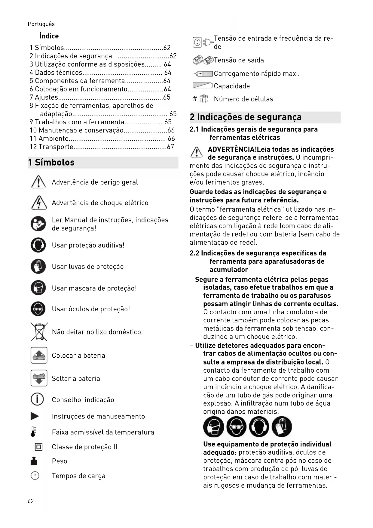 - 12 Transporte 1 Símbolos Advertência de perigo geral Advertência de choque elétrico Ler Manual de instruções, indicações de segurança! Usar proteção auditiva! Usar luvas de proteção! Usar máscara de proteção! Usar óculos de proteção! Não deitar no lixo doméstico. Colocar a bateria Soltar a bateria Conselho, indicação Instruções de manuseamento Faixa admissível da temperatura Classe de proteção II Peso Tempos de carga Tensão de entrada e frequência da re p. 67