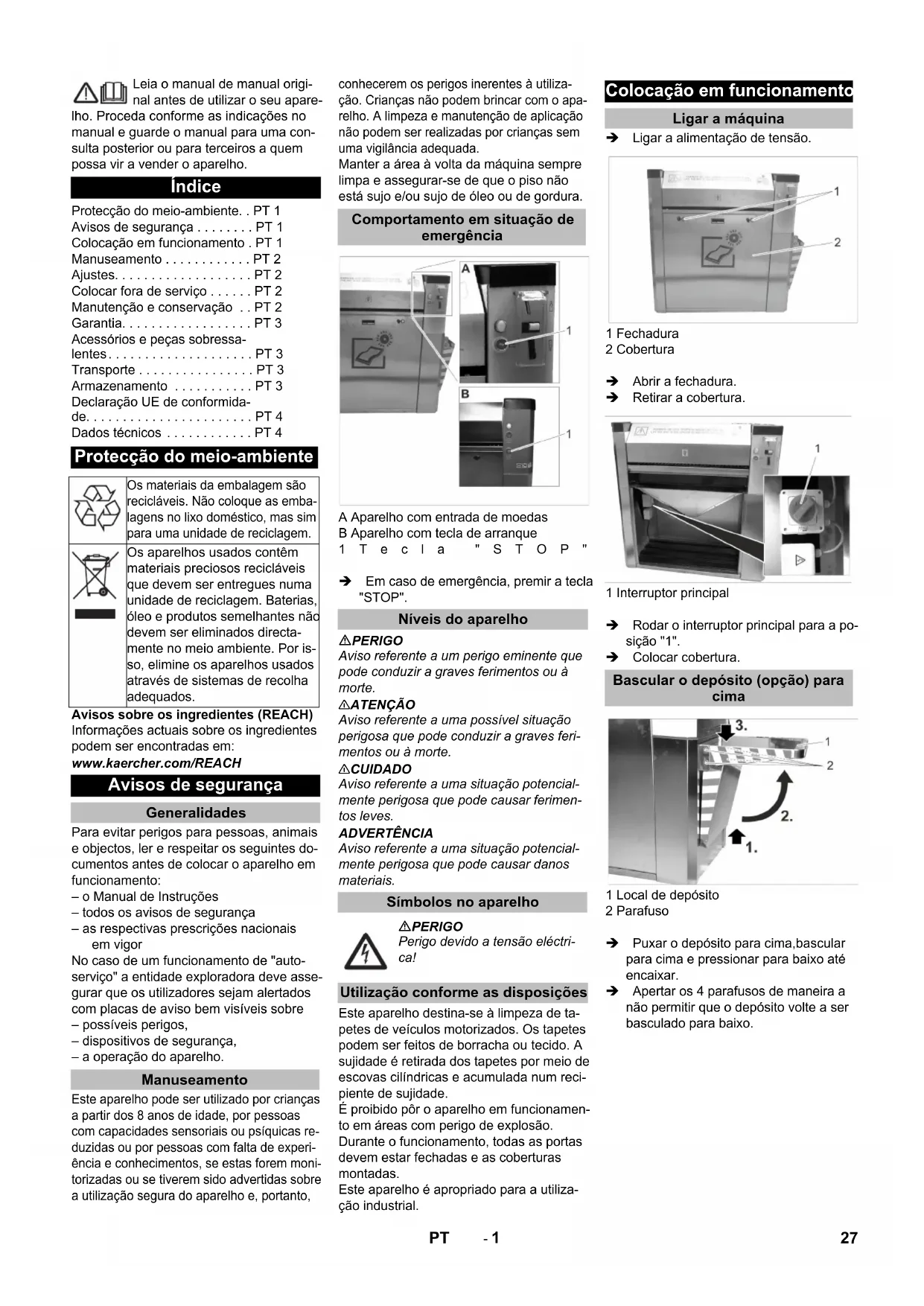 dB(A) 63 Dimensiones Longitud mm 1092 Anchura mm 531 Altura mm 1094 Peso kg 70 26 ES- 1 Leia o manual de manual origi- nal antes de utilizar o seu apare- lho. Proceda conforme as indicações no manual e guarde o manual para uma con- sulta posterior ou para terceiros a quem possa vir a vender o aparelho. Avisos sobre os ingredientes (REACH) Informações actuais sobre os ingredientes podem ser encontradas em: www.kaercher.com/REACH Para evitar perigos para pessoas, animais e objectos, ler e respeitar os seguintes do- cumentos antes de colocar o aparelho em funcionamento: – o Manual de Instruções – todos os avisos de segurança – as respectivas prescrições nacionais em vigor No caso de um funcionamento de "auto- serviço" a entidade exploradora deve asse- gurar que os utilizadores sejam alertados com placas de aviso bem visíveis sobre – possíveis perigos, – dispositivos de segurança, – a operação do aparelho. Este aparelho pode ser utilizado por crianças a partir dos 8 anos de idade, por pessoas com capacidades sensoriais ou psíquicas re- duzidas ou por pessoas com falta de experi- ência e conhecimentos, se estas forem moni- torizadas ou se tiverem sido advertidas sobre a utilização segura do aparelho e, portanto, conhecerem os perigos inerentes à utiliza- ção. Crianças não podem brincar com o apa- relho. A limpeza e manutenção de aplicação não podem ser realizadas por crianças sem uma vigilância adequada. Manter a área à volta da máquina sempre limpa e assegurar-se de que o piso não está sujo e/ou sujo de óleo ou de gordura. A Aparelho com entrada de moedas B Aparelho com tecla de arranque 1Tecla "STOP" Em caso de emergência, premir a tecla "STOP". PERIGO Aviso referente a um perigo eminente que pode conduzir a graves ferimentos ou à morte. 몇 ATENÇÃO Aviso referente a uma possível situação perigosa que pode conduzir a graves feri- mentos ou à morte. 몇 CUIDADO Aviso referente a uma situação potencial- mente perigosa que pode causar ferimen- tos leves. ADVERTÊNCIA Aviso referente a uma situação potencial- mente perigosa que pode causar danos materiais. Este aparelho destina-se à limpeza de ta- petes de veículos motorizados. Os tapetes podem ser feitos de borracha ou tecido. A sujidade é retirada dos tapetes por meio de escovas cilíndricas e acumulada num reci- piente de sujidade. É proibido pôr o aparelho em funcionamen- to em áreas com perigo de explosão. Durante o funcionamento, todas as portas devem estar fechadas e as coberturas montadas. Este aparelho é apropriado para a utiliza- ção industrial. Ligar a alimentação de tensão. 1 Fechadura 2 Cobertura Abrir a fechadura. Retirar a cobertura. 1 Interruptor principal Rodar o interruptor principal para a po- sição "1". Colocar cobertura. 1 Local de depósito 2 Parafuso Puxar o depósito para cima,bascular para cima e pressionar para baixo até encaixar. Apertar os 4 parafusos de maneira a não permitir que o depósito volte a ser basculado para baixo. Índice Protecção do meio-ambiente. . PT 1 Avisos de segurança . . . . . . . . PT 1 Colocação em funcionamento . PT 1 Manuseamento . . . . . . . . . . . . PT 2 Ajustes. . . . . . . . . . . . . . . . . . . PT 2 Colocar fora de serviço . . . . . . PT 2 Manutenção e conservação . . PT 2 Garantia. . . . . . . . . . . . . . . . . . PT 3 Acessórios e peças sobressa- lentes. . . . . . . . . . . . . . . . . . . . PT 3 Transporte . . . . . . . . . . . . . . . . PT 3 Armazenamento . . . . . . . . . . . PT 3 Declaração UE de conformida- de. . . . . . . . . . . . . . . . . . . . . . . PT 4 Dados técnicos . . . . . . . . . . . . PT 4 Protecção do meio-ambiente Os materiais da embalagem são recicláveis. Não coloque as emba- lagens no lixo doméstico, mas sim para uma unidade de reciclagem. Os aparelhos usados contêm materiais preciosos recicláveis que devem ser entregues numa unidade de reciclagem. Baterias, óleo e produtos semelhantes não devem ser eliminados directa- mente no meio ambiente. Por is- so, elimine os aparelhos usados através de sistemas de recolha adequados. Avisos de segurança Generalidades Manuseamento Comportamento em situação de emergência Níveis do aparelho Símbolos no aparelho PERIGO Perigo devido a tensão eléctri- ca! Utilização conforme as disposições Colocação em funcionamento Ligar a máquina Bascular o depósito (opção) para cima 27PT- 2 A Aparelho com entrada de moedas B Aparelho com tecla de arranque 1 Entrada de moedas 2 Lâmpada de controlo 3 Devolução das moedas 4 Tecla de arranque 5 Entrada dos tapetes 6 Saída dos tapetes Aviso: Se largar o tapete, este atravessa o apare- lho e é empurrado para a saída de tapetes. Aviso: O tempo de funcionamento ajustável é vá- lido para a inserção das seguintes moedas: – 50 cêntimos – 50 pence (britânicos) – 1 franco suíço – 1 zloty polaco – 5 coroas norueguesas Retirar a tampa (ver "Manutenção e conservação / Trabalhos de manuten- ção / Retirar tampa"). 1 Tecla "PRG" 2LED 3 3LED 1 4Tecla "P1" 5 Comando Premir a tecla "PRG" e manter premida até que o LED 3 se acenda. O modo de funcionamento Ajuste está activado. Aviso: O modo de funcionamento Ajuste é termi- nado se durante 10 segundos não for pre- mida qualquer tecla. O ajuste inicia-se com um tempo de funcio- namento de 0 segundos. O tempo de funcionamento máximo é de 10 minutos. Caso este ajuste seja atingido, o LED 1 pisca rapidamente. Premir brevemente a tecla "P1". O LED 1 pisca rapidamente e o tempo de funcionamento é aumentado 5 se- gundos.