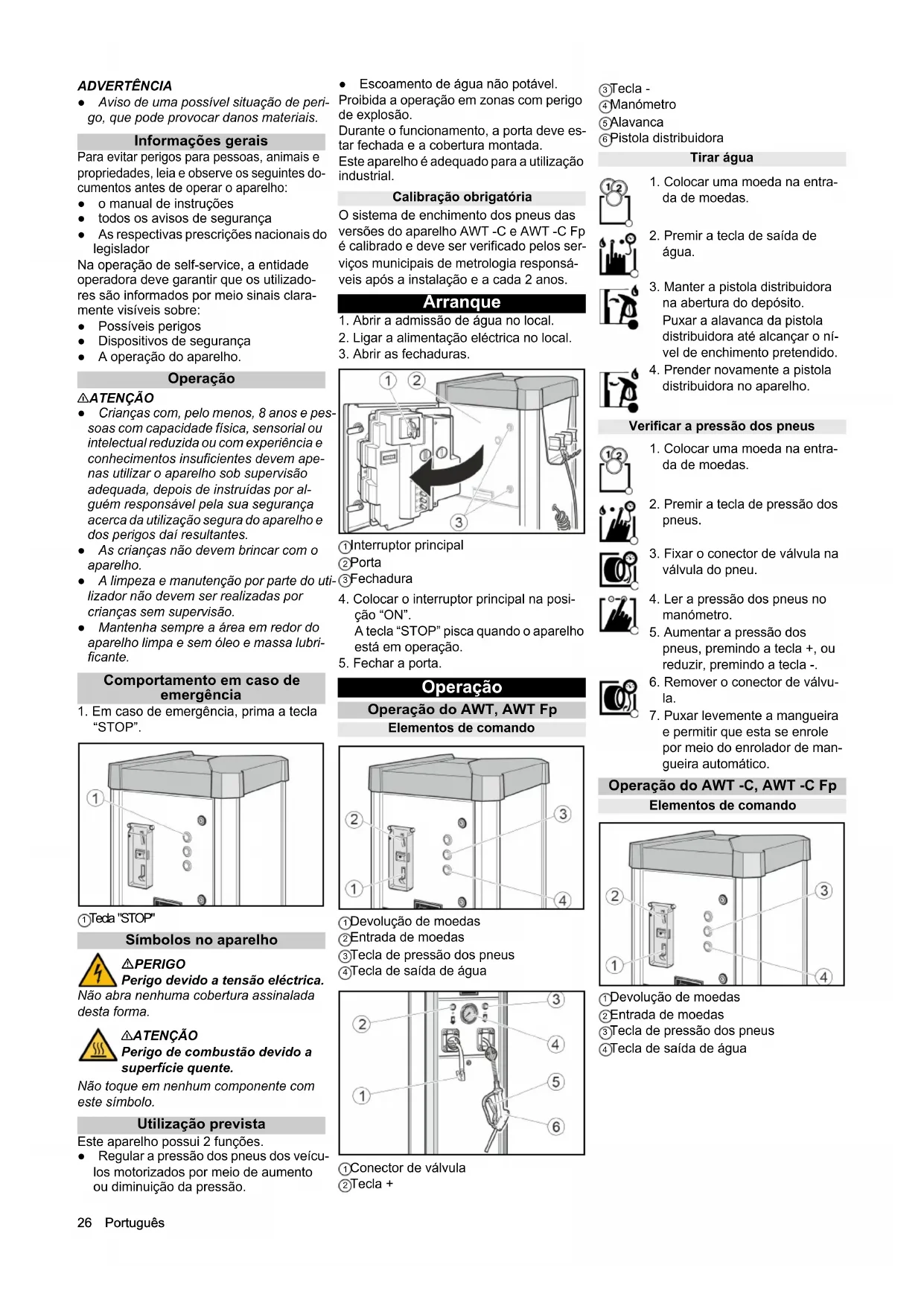 Operação Operação do AWT, AWT Fp Elementos de comando 1 Devolução de moedas 2 Entrada de moedas 3 Tecla de pressão dos pneus 4 Tecla de saída de água 1 Conector de válvula 2 Tecla + 3 Tecla - 4 Manómetro 5 Alavanca 6 Pistola distribuidora Tirar água Verificar a pressão dos pneus Operação do AWT -C, AWT -C Fp Elementos de comando 1 Devolução de moedas 2 Entrada de moedas 3 Tecla de pressão dos pneus 4 Tecla de saída de água