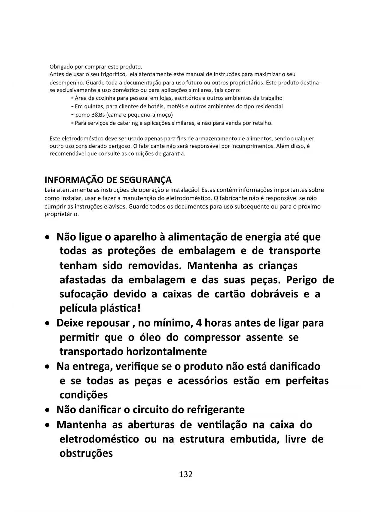 Leia atentamente as instruções de operação e instalação! Estas contêm informações importantes sobre como instalar, usar e fazer a manutenção do eletrodoméstico. O fabricante não é responsável se não cumprir as instruções e avisos. Guarde todos os documentos para uso subsequente ou para o próximo proprietário. Não ligue o aparelho à alimentação de energia até que todas as proteções de embalagem e de transporte tenham sido removidas. Mantenha as crianças afastadas da embalagem e das suas peças. Perigo de sufocação devido a caixas de cartão dobráveis e a película plástica! Deixe repousar , no mínimo, 4 horas antes de ligar para permitir que o óleo do compressor assente se transportado horizontalmente Na entrega, verifique se o produto não está danificado e se todas as peças e acessórios estão em perfeitas condições Não danificar o circuito do refrigerante Mantenha as aberturas de ventilação na caixa do eletrodoméstico ou na estrutura embutida, livre de obstruções133