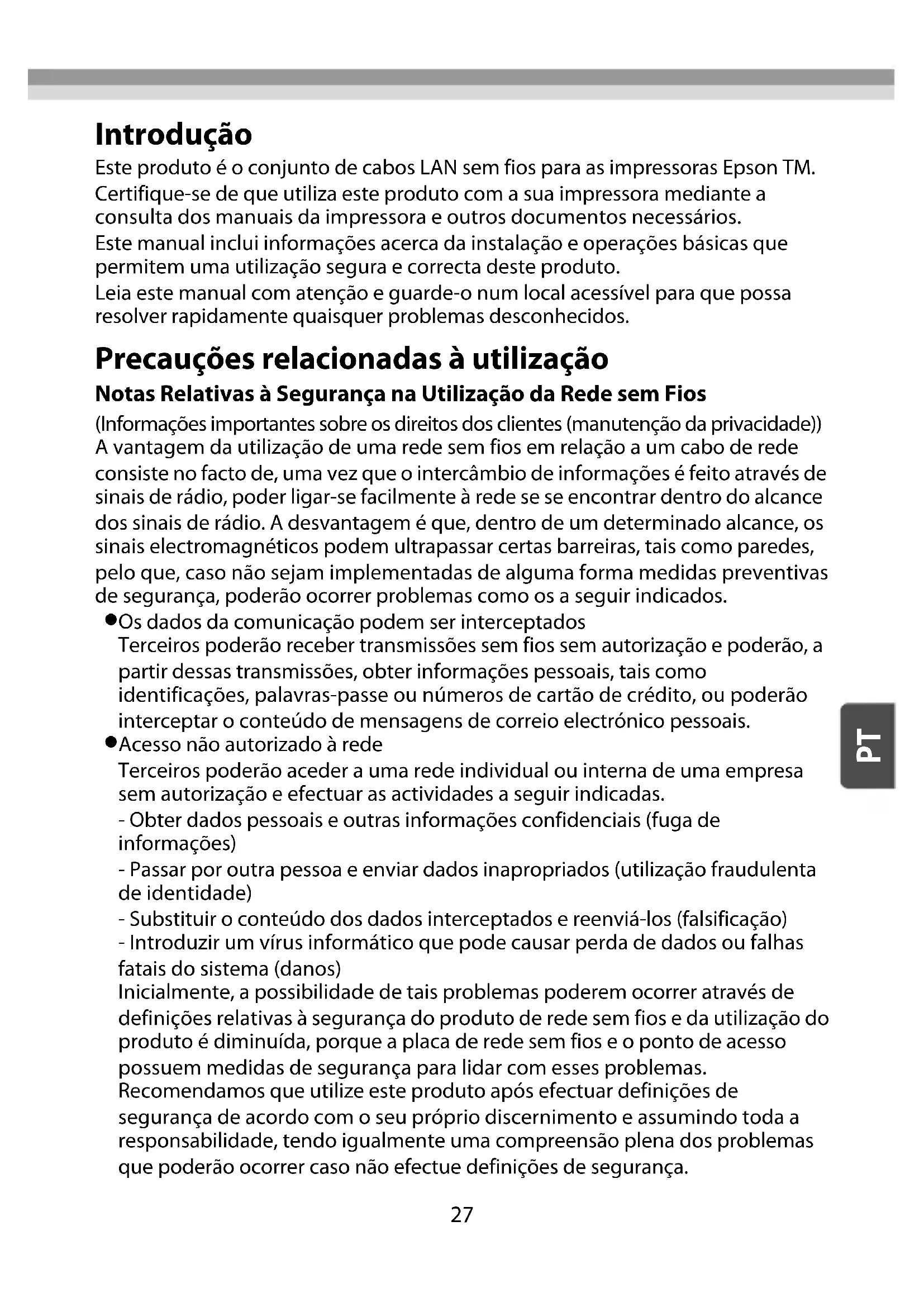Port uguê s Introdução Este produto é o conjunto de cabos LAN sem fios para as impressoras Epson TM. Certifique-se de que utiliza este produto com a sua impressora mediante a consulta dos manuais da impressora e outros documentos necessários. Este manual inclui informações acerca da instalação e operações básicas que permitem uma utilização segura e correcta deste produto. Leia este manual com atenção e guarde-o num local acessível para que possa resolver rapidamente quaisquer problemas desconhecidos. Precauções relacionadas à utilização Notas Relativas à Segurança na Utilização da Rede sem Fios (Informações importantes sobre os direitos dos clientes (manutenção da privacidade)) A vantagem da utilização de uma rede sem fios em relação a um cabo de rede consiste no facto de, uma vez que o intercâmbio de informações é feito através de sinais de rádio, poder ligar-se facilmente à rede se se encontrar dentro do alcance dos sinais de rádio. A desvantagem é que, dentro de um determinado alcance, os sinais electromagnéticos podem ultrapassar certas barreiras, tais como paredes, pelo que, caso não sejam implementadas de alguma forma medidas preventivas de segurança, poderão ocorrer problemas como os a seguir indicados.