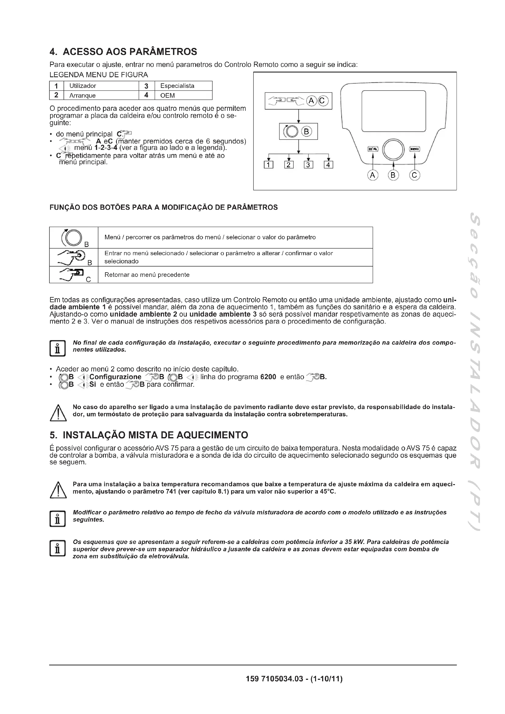 Utilizando o controlo remoto entrar no menú 2, como descrito no capítulo 4, e efetuar os seguintes ajustes: MENÚ LINHA DO PROGRAMAVALOR A AJUSTAR DESCRIÇÃOCONFIGURAÇÃO5715 Ligado Habilitação do circuito de aquecimento 2 Termostato ambiente CAqC2Habilitação termóstato para o circuito 2 (contacto 1-2 régua bornes M1)6020 Circuito AqC 1 Habilitação da zona de baixa temperatura6024 Termostato limitad CAqC Entrada EX21 habilitada como proteção da zona de baixa temperatura6046 Bloqueio geração calor Entrada H2 habilitada como proteção da zona de baixa temperaturaCIRCUITO AQC 1742 ---Habilitação da temperatura de ida modulante (zona de baixa temperatura) 834 Pré-denido 180 s Tempo de fecho da válvula misturadora A unidade ambiente é capaz de controlar diretamente a zona de baixa temperatura em função da temperatura ambiente desejada no local.Se, rodando o seletor B, se visualiza no ecrã a temperatura de ida da caldeira em vez da temperatura ambiente, signica que o parâmetro 742 não foi ajustado corretamente.161 7105034.03 - (1-10/11) S e c ç ã o I N S TA L A D O R ( P T )