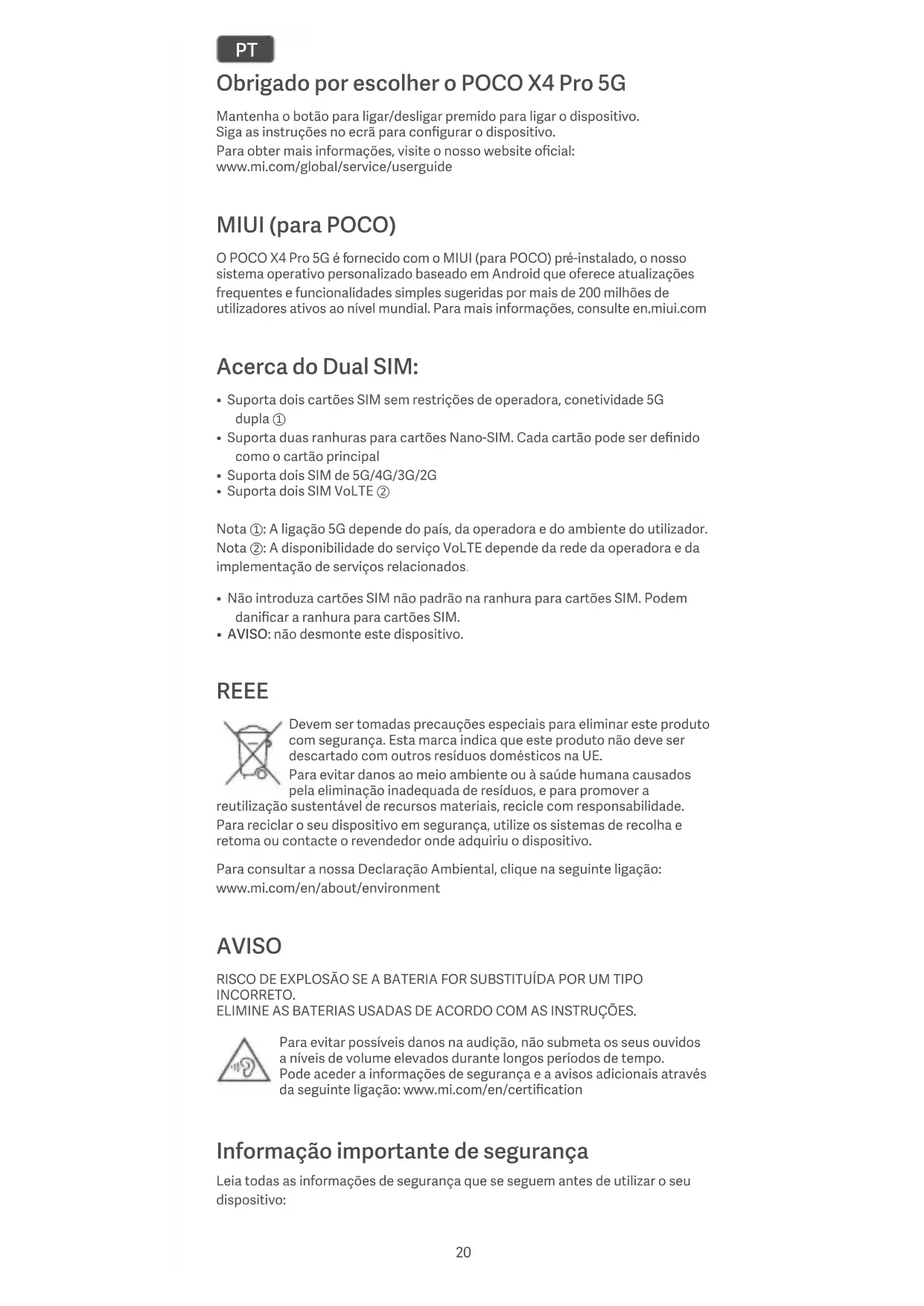 - AVISO: não desmonte este dispositivo. REEE Devem ser tomadas precauções especiais para eliminar este produto com segurança. Esta marca indica que este produto não deve ser descartado com outros resíduos domésticos na UE. Para evitar danos ao meio ambiente ou à saúde humana causados pela eliminação inadequada de resíduos, e para promover a reutilização sustentável de recursos materiais, recicle com responsabilidade. Para reciclar o seu dispositivo em segurança, utilize os sistemas de recolha e retoma ou contacte o revendedor onde adquiriu o dispositivo. Para consultar a nossa Declaração Ambiental, clique na seguinte ligação: www.mi.com/en/about/environment AVISO RISCO DE EXPLOSÃO SE A BATERIA FOR SUBSTITUÍDA POR UM TIPO INCORRETO. ELIMINE AS BATERIAS USADAS DE ACORDO COM AS INSTRUÇÕES. Para evitar possíveis danos na audição, não submeta os seus ouvidos a níveis de volume elevados durante longos períodos de tempo. Pode aceder a informações de segurança e a avisos adicionais através da seguinte ligação: www.mi.com/en/certification Informação importante de segurança Leia todas as informações de segurança que se seguem antes de utilizar o seu dispositivo: 20• Utilizar cabos, transformadores ou baterias não autorizados pode provocar incêndios, explosões ou outros riscos.
