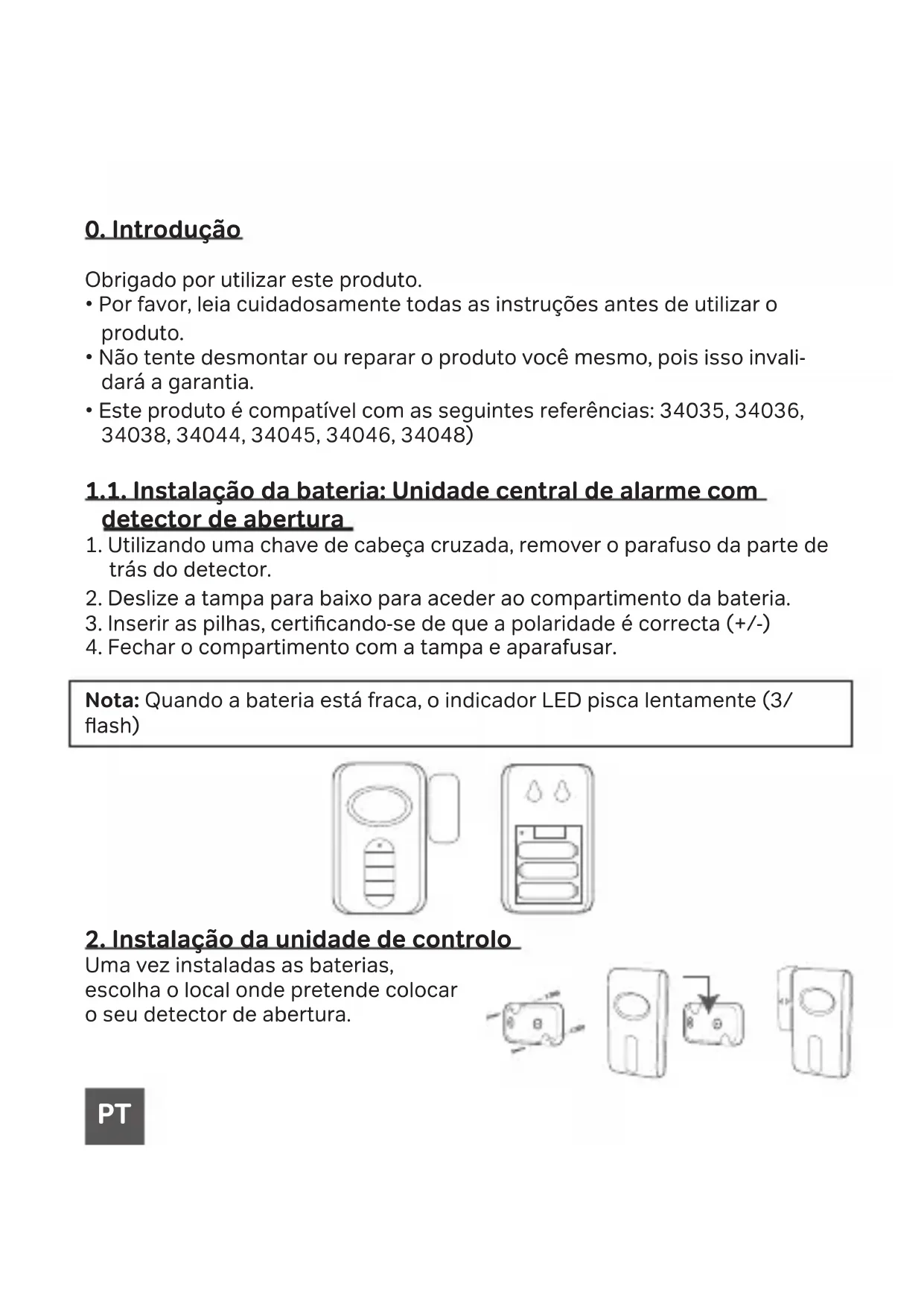 - Este produto é compatível com as seguintes referências: 34035, 34036, 34038, 34044, 34045, 34046, 34048) 1.1. Instalação da bateria: Unidade central de alarme com detector de abertura