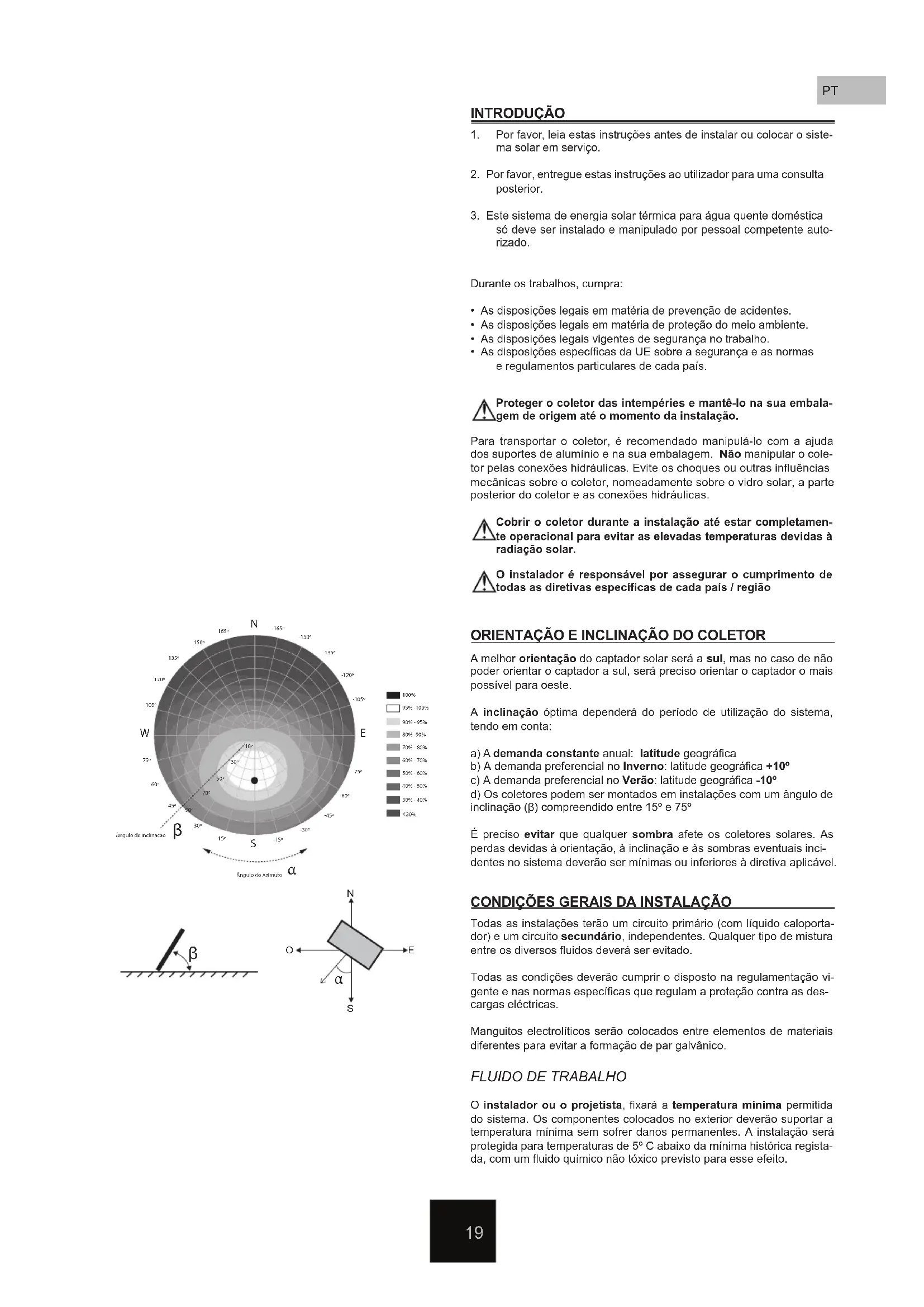 - As disposições especícas da UE sobre a segurança e as normas e regulamentos particulares de cada país. Proteger o coletor das intempéries e mantê-lo na sua embala- gem de origem até o momento da instalação. Cobrir o coletor durante a instalação até estar completamen- te operacional para evitar as elevadas temperaturas devidas à radiação solar. O instalador é responsável por assegurar o cumprimento de todas as diretivas especícas de cada país / região Para transportar o coletor, é recomendado manipulá-lo com a ajuda dos suportes de alumínio e na sua embalagem. Não manipular o cole- tor pelas conexões hidráulicas. Evite os choques ou outras inuências mecânicas sobre o coletor, nomeadamente sobre o vidro solar, a parte posterior do coletor e as conexões hidráulicas. A melhor orientação do captador solar será a sul, mas no caso de não poder orientar o captador a sul, será preciso orientar o captador o mais possível para oeste. A inclinação óptima dependerá do período de utilização do sistema, tendo em conta: a) A demanda constante anual: latitude geográca b) A demanda preferencial no Inverno: latitude geográca +10º c) A demanda preferencial no Verão: latitude geográca -10º d) Os coletores podem ser montados em instalações com um ângulo de inclinação (β) compreendido entre 15º e 75º É preciso evitar que qualquer sombra afete os coletores solares. As perdas devidas à orientação, à inclinação e às sombras eventuais inci- dentes no sistema deverão ser mínimas ou inferiores à diretiva aplicável. Todas as instalações terão um circuito primário (com líquido caloporta- dor) e um circuito secundário, independentes. Qualquer tipo de mistura entre os diversos uidos deverá ser evitado. Todas as condições deverão cumprir o disposto na regulamentação vi- gente e nas normas especícas que regulam a proteção contra as des- cargas eléctricas. Manguitos electrolíticos serão colocados entre elementos de materiais diferentes para evitar a formação de par galvânico.