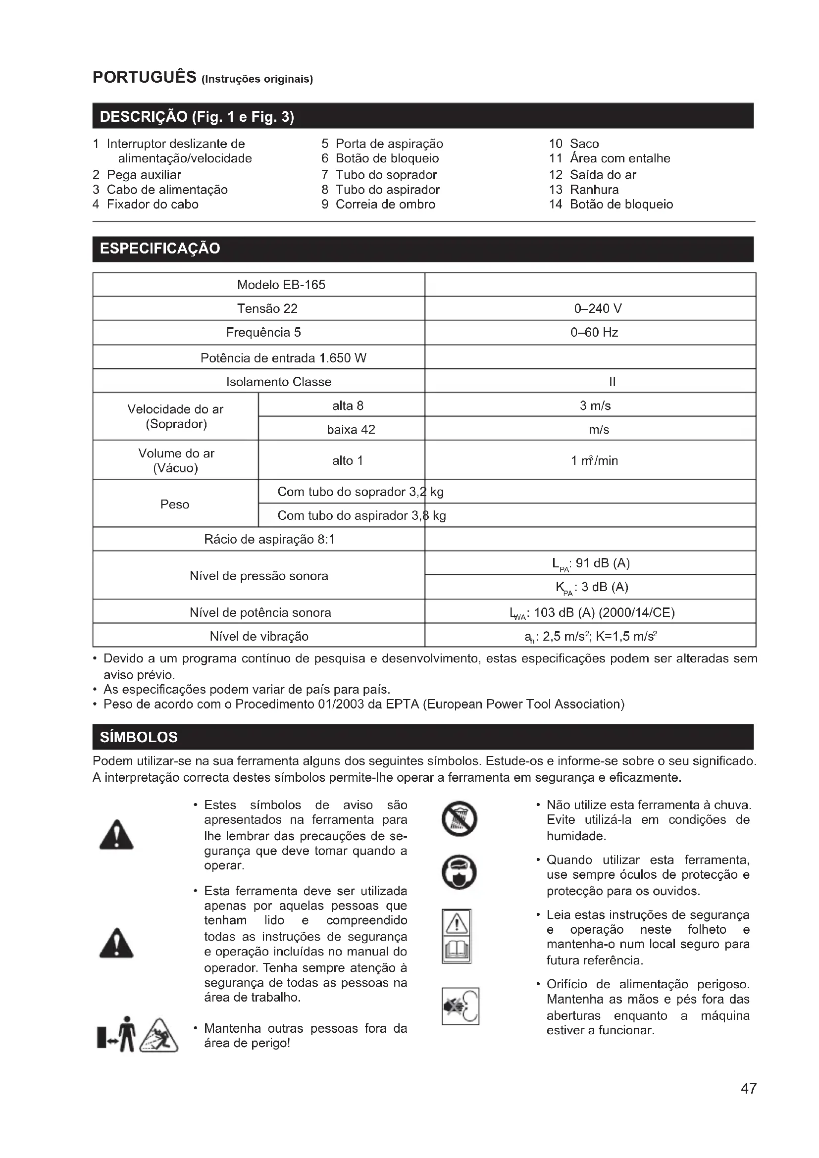 ças sem supervisão. Leia cuidadosamente todas as instruções de segu- rança e operação antes de utilizar este produto. Tome particular atenção a todas as secções deste manual do utilizador com símbolos de advertência e avisos. A inobservância das advertências e instruções pode re- sultar em choque eléctrico, queimadura e/ou ferimento grave. Esta ferramenta serve para sopragem e aspiração. Nunca utilize a ferramenta sem ser para o m previsto, como por exemplo para encher balões. A ferramenta deve ser ligada apenas a uma fonte de alimentação da mesma tensão conforme indicada na placa sinalética e pode apenas ser operada em CA monofásica. A ferramenta possui isolamento duplo e pode, portanto, ser também utilizada a partir de toma- das sem o terra.