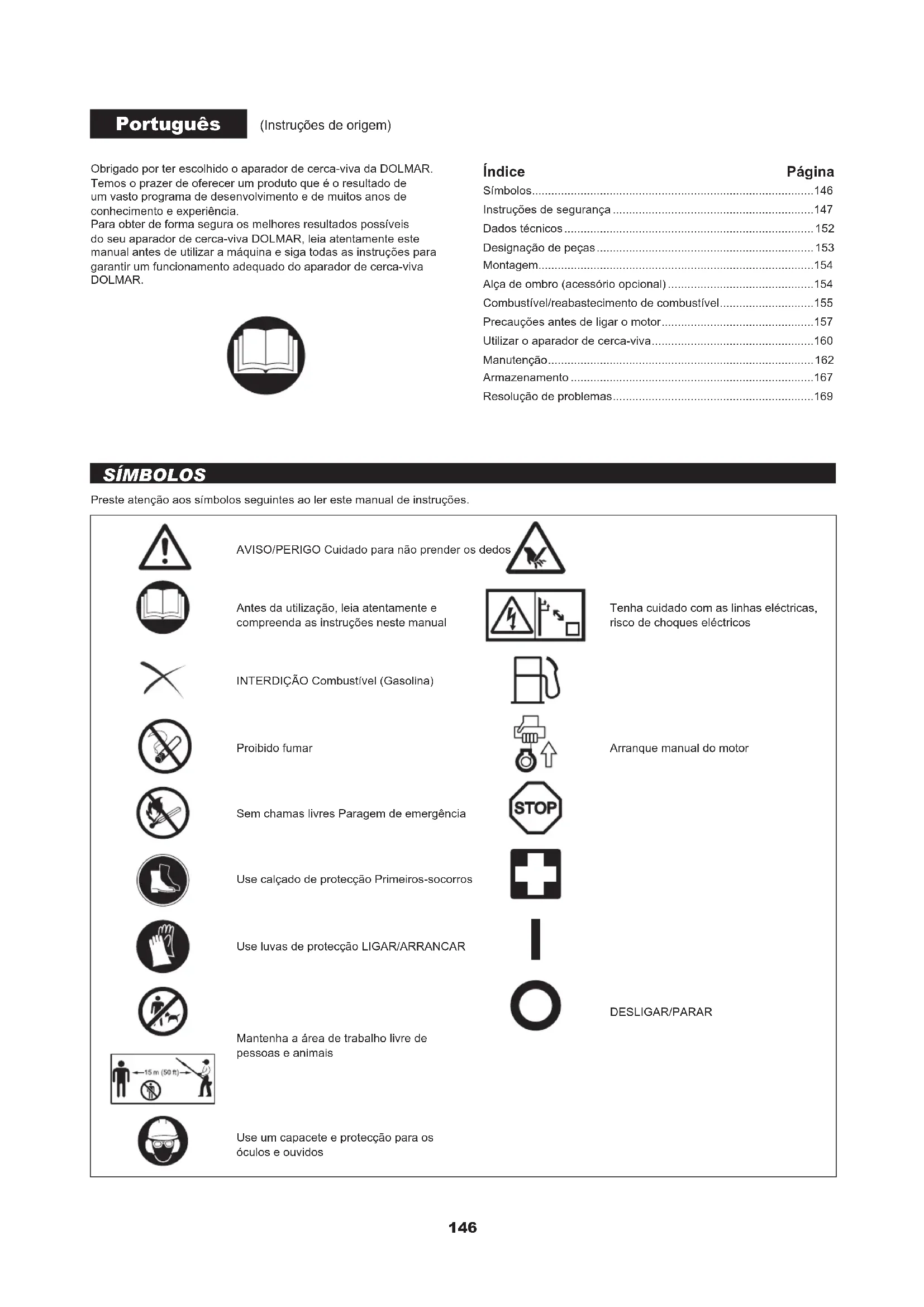 - Conector desconectado Acóplelo rmemente Anomalía del sistema eléctrico Solicite que se realice la inspección y mantenimiento. Cuando el motor no se ponga en marcha tras la operación de calentamiento: Si no hay ninguna anomalía en los elementos comprobados, abra la mariposa de gases 1/3 y ponga en marcha el motor. LOCALIZACIÓN Y SOLUCIÓN DE AVERÍAS146 Obrigado por ter escolhido o aparador de cerca-viva da DOLMAR. Temos o prazer de oferecer um produto que é o resultado de um vasto programa de desenvolvimento e de muitos anos de conhecimento e experiência. Para obter de forma segura os melhores resultados possíveis do seu aparador de cerca-viva DOLMAR, leia atentamente este manual antes de utilizar a máquina e siga todas as instruções para garantir um funcionamento adequado do aparador de cerca-viva DOLMAR. Português (Instruções de origem) Índice Página Símbolos p. 146