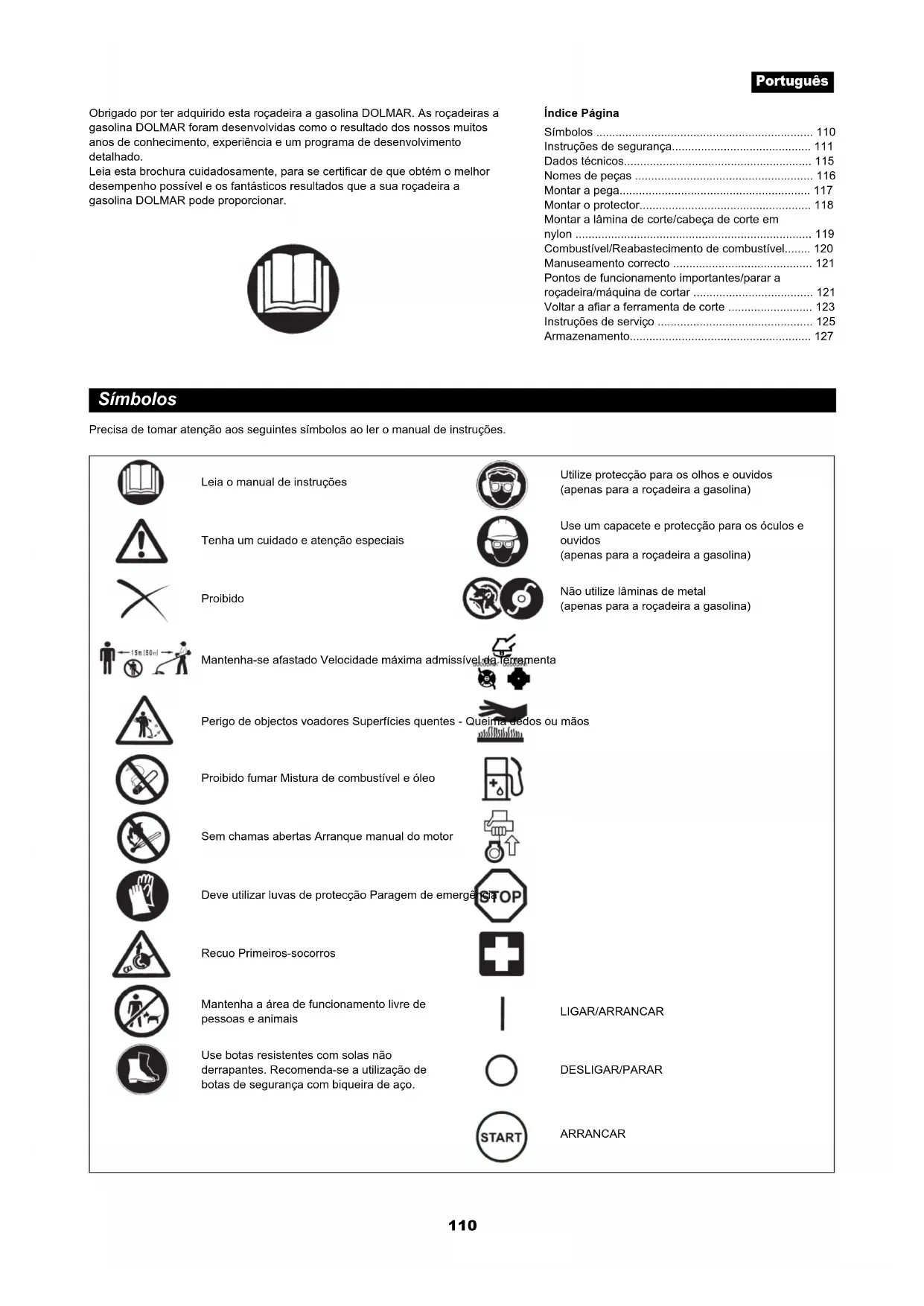 - Substituição da ferramenta113 – Nunca reabasteça num espaço fechado como dentro de uma sala. Isso poderá causar uma explosão devido à acumulação de vapor de combustível ao nível do chão. – Transporte e armazene o combustível apenas em recipientes aprovados. Certifique-se de que o combustível armazenado não é acessível a crianças. Método de funcionamento – Utilize apenas a roçadeira a gasolina com boas condições de iluminação e visibilidade. Durante a época de Inverno, tenha cuidado com áreas escorregadias ou molhadas tais como áreas cobertas pela neve (risco de escorregar). Certifique-se sempre de que tem um apoio seguro. – Nunca corte acima da altura dos ombros. – Nunca esteja em cima de uma escada enquanto usa a roçadeira a gasolina. – Nunca suba a árvores para utilizar a roçadeira a gasolina. – Nunca trabalhe em superfícies instáveis. – Remova areia, pedras, pregos etc encontrados na área de trabalho. Objectos estranhos podem danificar a ferramenta de corte e causar recuos perigosos. – Antes de começar a cortar, certifique-se de que a ferramenta de corte atingiu a velocidade de funcionamento completa. – Se relva ou ramos ficarem presos entre a ferramenta de corte e o resguardo, desligue sempre o motor antes de limpar. Caso contrário, uma rotação acidental da lâmina pode causar ferimentos graves. – Descanse para evitar a perda de controlo causada pela fadiga. É aconselhável descansar 10 a 20 minutos por cada hora. Recuo (impulso da lâmina) – Ao operar a roçadeira a gasolina poderão ocorrer recuos não controlados. – Os recuos ocorrem frequentemente ao tentar cortar com a secção 12 a 2 horas da lâmina. – Nunca aplique a secção 12 a 2 horas da lâmina da roçadeira a gasolina. – Nunca aplique esta secção da lâmina da roçadeira a gasolina a objectos sólidos tais como arbustos ou árvores etc que tenham um diâmetro maior do que 3 cm. Isso poderá fazer com que a roçadeira a gasolina se desvie com uma grande quantidade de força, o que é extremamente perigoso e pode causar ferimentos. Prevenção de recuos Para evitar recuos, lembre-se do seguinte: – Utilizar a secção 12 a 2 horas da lâmina é muito perigoso, especialmente ao utilizar ferramentas de corte de metal. – As operações de corte utilizando a secção 11 a 12 horas e a secção 2 a 5 horas da lâmina devem ser efectuadas apenas por técnicos especializados e experientes e a seu próprio risco. A secção de corte óptima para corte fácil com quase nenhum recuo está na secção 8 a 11 horas da lâmina. Ferramentas de corte – Utilize uma ferramenta de corte para o trabalho a efectuar. As cabeças de corte em nylon (cabeças das roçadeiras) são adequadas para cortar relva. As lâminas metálicas são adequadas para cortar ervas daninhas, relvas altas, arbustos, matagal, moita e vegetação semelhante. Nunca utilize outras lâminas incluindo correntes rotativas multi-peças e manguais. Caso contrário, podem resultar ferimentos. – Ao utilizar lâminas metálicas, evite “recuos” e prepare-se sempre para um recuo acidental. Consulte a secção “Recuo” e “Prevenção de recuos”. Instruções de manutenção – Solicite o nosso centro de assistência autorizado para efectuar a manutenção do equipamento, utilizando sempre peças sobresselentes genuínas. A reparação ou manutenção incorrectas podem encurtar a vida útil do equipamento e aumentar o risco de acidentes. – Verifique sempre o estado da roçadeira, especialmente os dispositivos de protecção da roçadeira e alça para o ombro, antes de iniciar o trabalho. Deve também prestar especial atenção às lâminas de corte, que devem estar devidamente afiadas. – Desligue o motor e remova o conector da vela de ignição ao substituir ou afiar as ferramentas de corte, e também ao limpar a roçadeira ou ferramenta de corte. Precaução: Recuo Diagrama Diagrama114 Nunca alise ou solde ferramentas de corte danificadas. – Opere a roçadeira a gasolina com o mínimo de ruído e contaminação possível. Em particular, verifique se o carburador está devidamente instalado. – Limpe a roçadeira a gasolina em intervalos regulares e certifique-se de que todos os parafusos estão bem apertados. – Nunca opere ou guarde a roçadeira a gasolina nas proximidades de chamas ardentes. – Guarde sempre a roçadeira a gasolina em salas fechadas e com um depósito de combustível esvaziado. – Ao limpar, efectuar a manutenção e armazenar o equipamento, instale sempre a tampa na lâmina de corte. Observe as instruções de prevenção de acidentes relevantes emitidas pelas associações comerciais relevantes e companhias de seguros. Não efectue quaisquer modificações na roçadeira a gasolina porque ao fazê-lo estará a comprometer a sua segurança. O desempenho do trabalho de manutenção ou reparação pelo utilizador é limitado às actividades descritas no manual de instruções. O resto do trabalho deverá ser efectuado por um Agente de Serviço Autorizado. Utilize apenas partes sobresselentes genuínas e acessórios lançados e fornecidos pela DOLMAR. Utilizar acessórios e ferramentas não aprovados provocará um risco maior de acidentes. A DOLMAR não aceitará qualquer responsabilização por acidentes ou danos provocados pela utilização de ferramentas de corte não aprovadas, dispositivos de fixação de ferramentas de corte ou acessórios. Primeiros-socorros Em caso de acidente, certifique-se de que uma caixa de primeiros socorros está disponível nas proximidades das operações de corte. Substitua imediatamente qualquer item retirado da caixa de primeiros socorros. Ao pedir ajuda, forneça a seguinte informação: – Local do acidente – O que aconteceu – Número de pessoas feridas – Tipo de ferimentos – O seu nome Vibração – As pessoas com má circulação que sejam expostas a vibrações excessivas podem sofrer ferimentos nos vasos sanguín