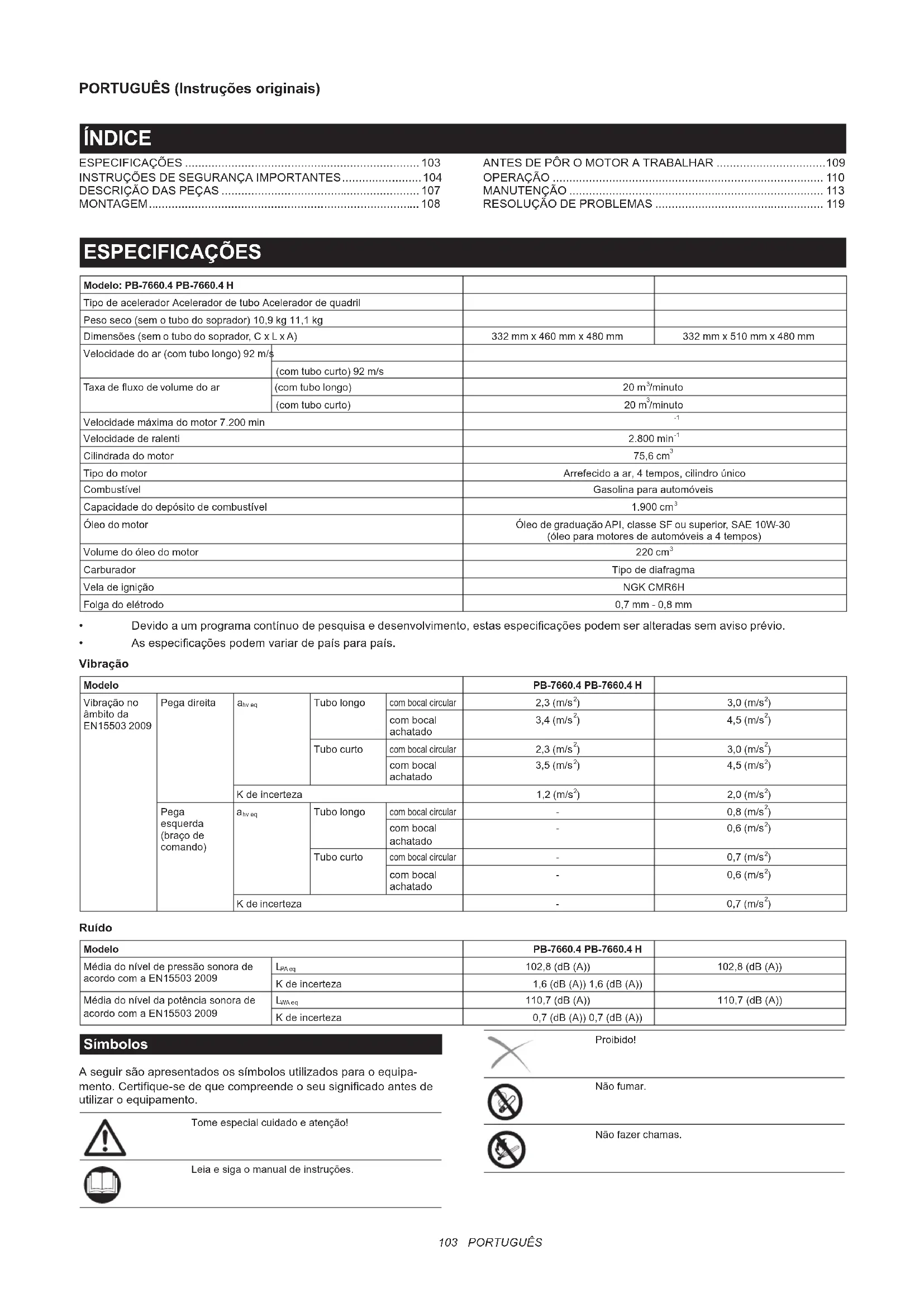 - As especicações podem variar de país para país. Vibração Modelo PB-7660.4 PB-7660.4 H Vibração no âmbito da EN15503 2009 Pega direita a hv eq Tubo longo com bocal circular 2,3 (m/s