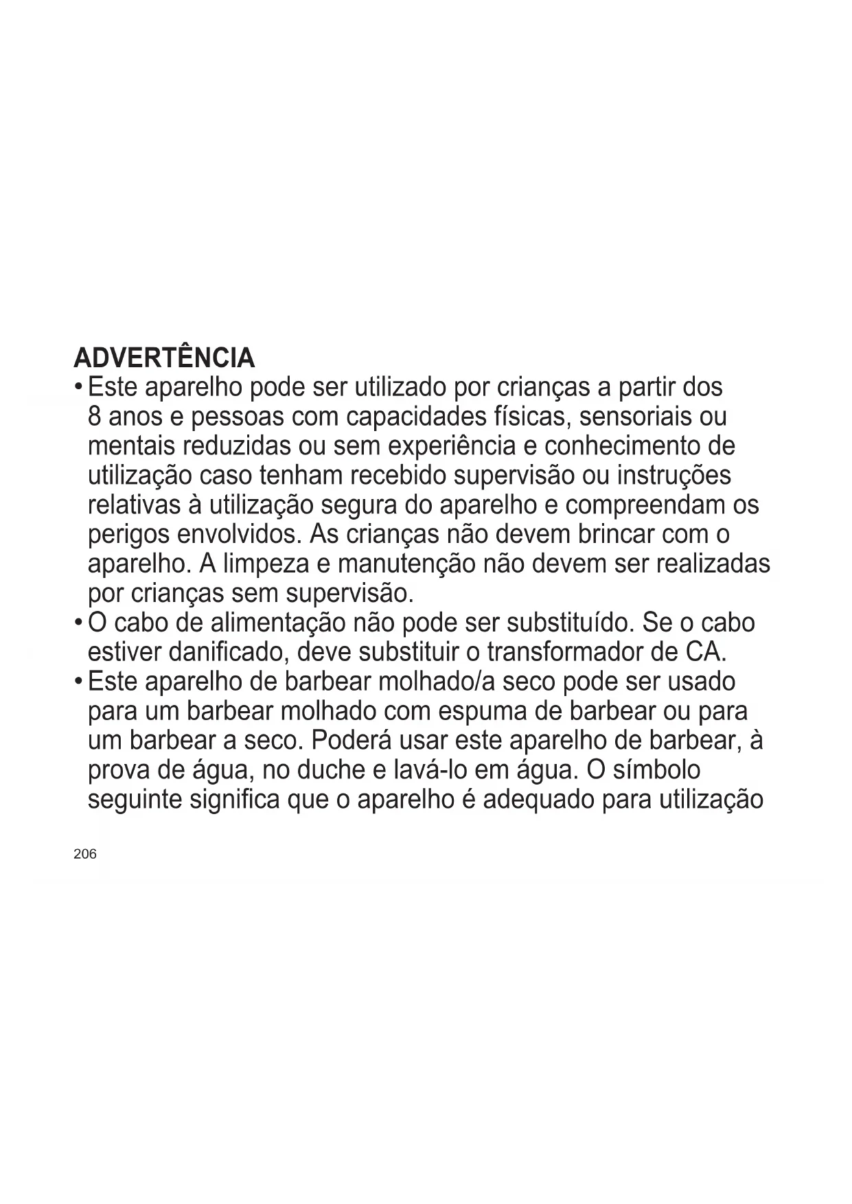 Este aparelho de barbear molhado/a seco pode ser usado para um barbear molhado com espuma de barbear ou para um barbear a seco. Poderá usar este aparelho de barbear, à prova de água, no duche e lavá‑lo em água. O símbolo seguinte signica que o aparelho é adequado para utilização207 TR RO H SK CZ PL FIN S N P DK E NL I F D GB no banho ou no duche.