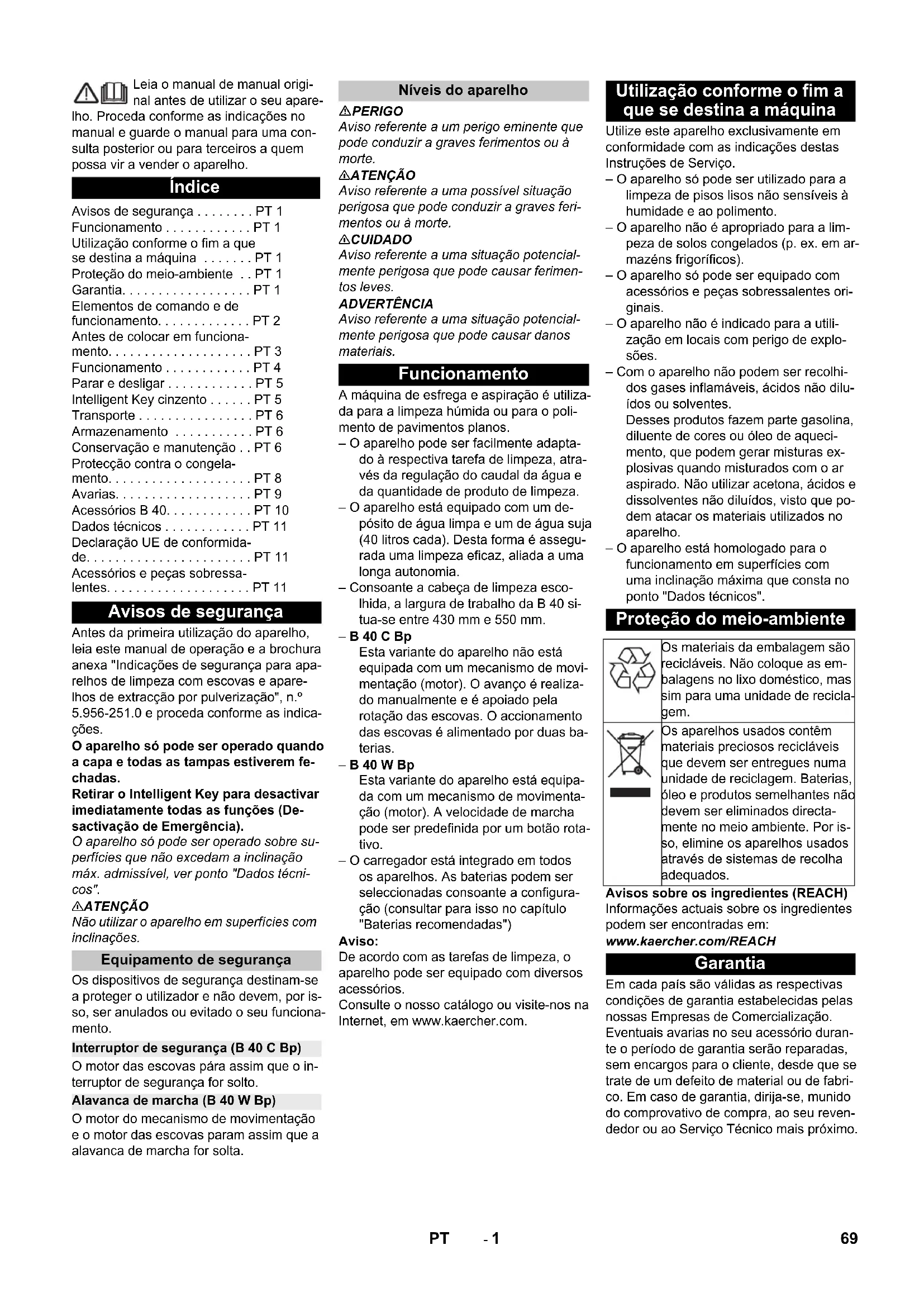 Chairman of the Board of Management Director Regulatory Affairs & Certification Accesorios y piezas de repuesto 68 ES- 1 Leia o manual de manual origi- nal antes de utilizar o seu apare- lho. Proceda conforme as indicações no manual e guarde o manual para uma con- sulta posterior ou para terceiros a quem possa vir a vender o aparelho. Antes da primeira utilização do aparelho, leia este manual de operação e a brochura anexa "Indicações de segurança para apa- relhos de limpeza com escovas e apare- lhos de extracção por pulverização", n.º 5.956-251.0 e proceda conforme as indica- ções. O aparelho só pode ser operado quando a capa e todas as tampas estiverem fe- chadas. Retirar o Intelligent Key para desactivar imediatamente todas as funções (De- sactivação de Emergência). O aparelho só pode ser operado sobre su- perfícies que não excedam a inclinação máx. admissível, ver ponto "Dados técni- cos". 몇 ATENÇÃO Não utilizar o aparelho em superfícies com inclinações. Os dispositivos de segurança destinam-se a proteger o utilizador e não devem, por is- so, ser anulados ou evitado o seu funciona- mento. O motor das escovas pára assim que o in- terruptor de segurança for solto. O motor do mecanismo de movimentação e o motor das escovas param assim que a alavanca de marcha for solta. PERIGO Aviso referente a um perigo eminente que pode conduzir a graves ferimentos ou à morte. 몇 ATENÇÃO Aviso referente a uma possível situação perigosa que pode conduzir a graves feri- mentos ou à morte. 몇 CUIDADO Aviso referente a uma situação potencial- mente perigosa que pode causar ferimen- tos leves. ADVERTÊNCIA Aviso referente a uma situação potencial- mente perigosa que pode causar danos materiais. A máquina de esfrega e aspiração é utiliza- da para a limpeza húmida ou para o poli- mento de pavimentos planos. – O aparelho pode ser facilmente adapta- do à respectiva tarefa de limpeza, atra- vés da regulação do caudal da água e da quantidade de produto de limpeza. – O aparelho está equipado com um de- pósito de água limpa e um de água suja (40 litros cada). Desta forma é assegu- rada uma limpeza eficaz, aliada a uma longa autonomia. – Consoante a cabeça de limpeza esco- lhida, a largura de trabalho da B 40 si- tua-se entre 430 mm e 550 mm. – B 40 C Bp Esta variante do aparelho não está equipada com um mecanismo de movi- mentação (motor). O avanço é realiza- do manualmente e é apoiado pela rotação das escovas. O accionamento das escovas é alimentado por duas ba- terias. – B 40 W Bp Esta variante do aparelho está equipa- da com um mecanismo de movimenta- ção (motor). A velocidade de marcha pode ser predefinida por um botão rota- tivo. – O carregador está integrado em todos os aparelhos. As baterias podem ser seleccionadas consoante a configura- ção (consultar para isso no capítulo "Baterias recomendadas") Aviso: De acordo com as tarefas de limpeza, o aparelho pode ser equipado com diversos acessórios. Consulte o nosso catálogo ou visite-nos na Internet, em www.kaercher.com. Utilize este aparelho exclusivamente em conformidade com as indicações destas Instruções de Serviço. – O aparelho só pode ser utilizado para a limpeza de pisos lisos não sensíveis à humidade e ao polimento. – O aparelho não é apropriado para a lim- peza de solos congelados (p. ex. em ar- mazéns frigoríficos). – O aparelho só pode ser equipado com acessórios e peças sobressalentes ori- ginais. – O aparelho não é indicado para a utili- zação em locais com perigo de explo- sões. – Com o aparelho não podem ser recolhi- dos gases inflamáveis, ácidos não dilu- ídos ou solventes. Desses produtos fazem parte gasolina, diluente de cores ou óleo de aqueci- mento, que podem gerar misturas ex- plosivas quando misturados com o ar aspirado. Não utilizar acetona, ácidos e dissolventes não diluídos, visto que po- dem atacar os materiais utilizados no aparelho. – O aparelho está homologado para o funcionamento em superfícies com uma inclinação máxima que consta no ponto "Dados técnicos". Avisos sobre os ingredientes (REACH) Informações actuais sobre os ingredientes podem ser encontradas em: www.kaercher.com/REACH Em cada país são válidas as respectivas condições de garantia estabelecidas pelas nossas Empresas de Comercialização. Eventuais avarias no seu acessório duran- te o período de garantia serão reparadas, sem encargos para o cliente, desde que se trate de um defeito de material ou de fabri- co. Em caso de garantia, dirija-se, munido do comprovativo de compra, ao seu reven- dedor ou ao Serviço Técnico mais próximo. Índice Avisos de segurança . . . . . . . . PT 1 Funcionamento . . . . . . . . . . . . PT 1 Utilização conforme o fim a que se destina a máquina . . . . . . . PT 1 Proteção do meio-ambiente . . PT 1 Garantia. . . . . . . . . . . . . . . . . . PT 1 Elementos de comando e de funcionamento. . . . . . . . . . . . . PT 2 Antes de colocar em funciona- mento. . . . . . . . . . . . . . . . . . . . PT 3 Funcionamento . . . . . . . . . . . . PT 4 Parar e desligar . . . . . . . . . . . . PT 5 Intelligent Key cinzento . . . . . . PT 5 Transporte . . . . . . . . . . . . . . . . PT 6 Armazenamento . . . . . . . . . . . PT 6 Conservação e manutenção . . PT 6 Protecção contra o congela- mento. . . . . . . . . . . . . . . . . . . . PT 8 Avarias. . . . . . . . . . . . . . . . . . . PT 9 Acessórios B 40. . . . . . . . . . . . PT 10 Dados técnicos . . . . . . . . . . . . PT 11 Declaração UE de conformida- de. . . . . . . . . . . . . . . . . . . . . . . PT 11 Acessórios e peças sobressa- lentes. . . . . . . . . . . . . . . . . . . . PT 11 Avisos de segurança Equipamento de segurança Interruptor de segurança (B 40 C Bp) Alavanca de marcha (B 40 W Bp) Níveis do aparelho Funcionamento Utilização conforme o fim a que se destina a máquina Proteção do meio-ambiente Os materiais d