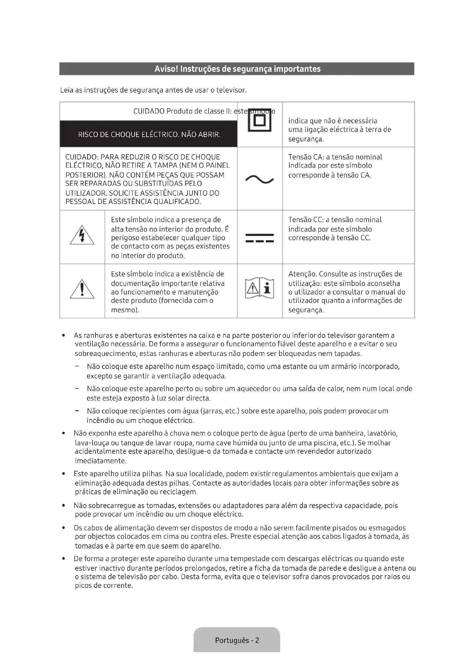 - DD+ is supported for up to 5.1 channels.Português - 2 Aviso! Instruções de segurança importantes Leia as instruções de segurança antes de usar o televisor. CUIDADO Produto de classe II: este símbolo indica que não é necessária uma ligação eléctrica à terra de segurança. RISCO DE CHOQUE ELÉCTRICO. NÃO ABRIR. CUIDADO: PARA REDUZIR O RISCO DE CHOQUE ELÉCTRICO, NÃO RETIRE A TAMPA (NEM O PAINEL POSTERIOR). NÃO CONTÉM PEÇAS QUE POSSAM