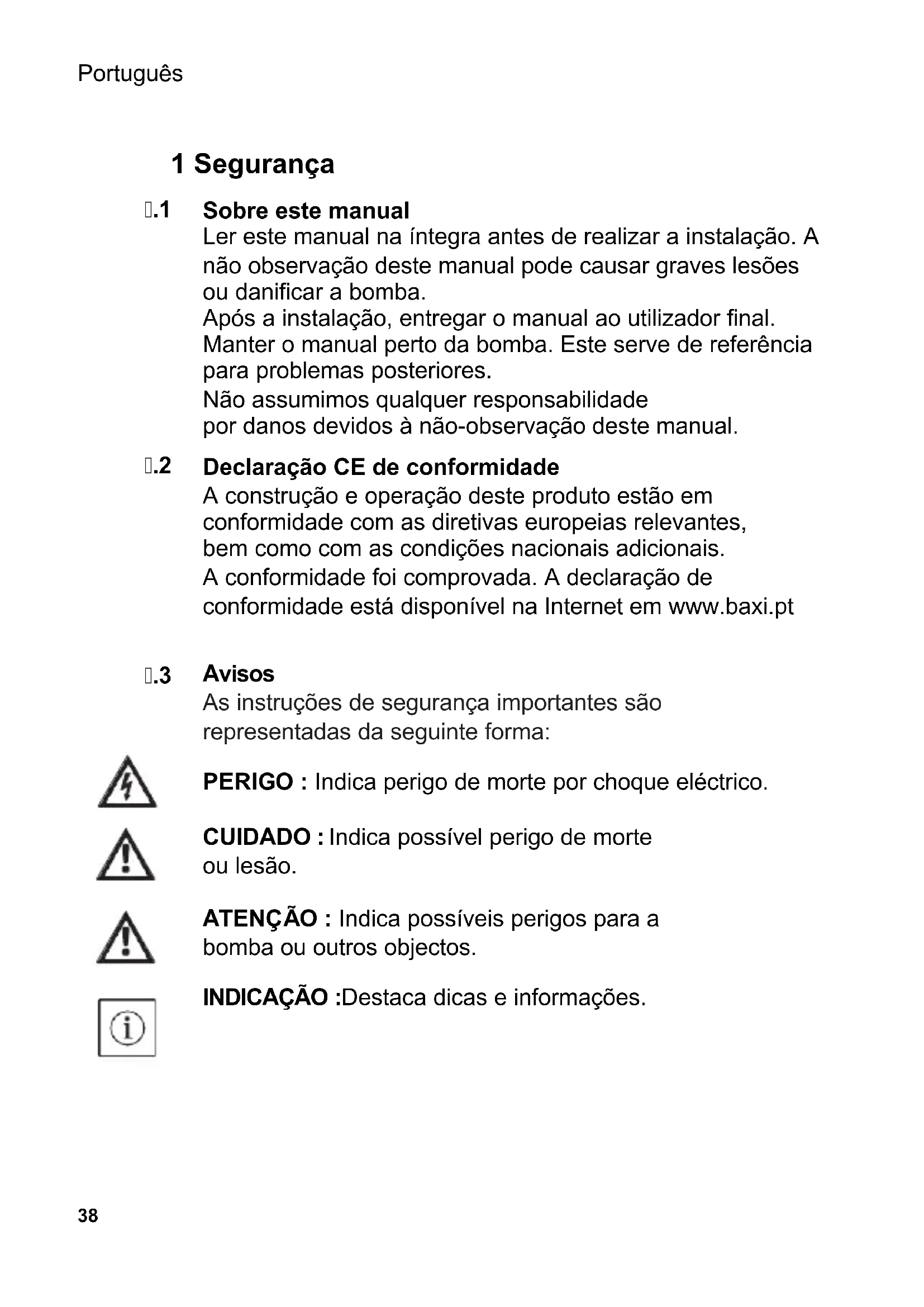 Avisos As instruções de segurança importantes são representadas da seguinte forma: PERIGO : Indica perigo de morte por choque eléctrico. CUIDADO : Indica possível perigo de morte ou lesão. ATENÇÃO : Indica possíveis perigos para a bomba ou outros objectos. INDICAÇÃO :Destaca dicas e informações.