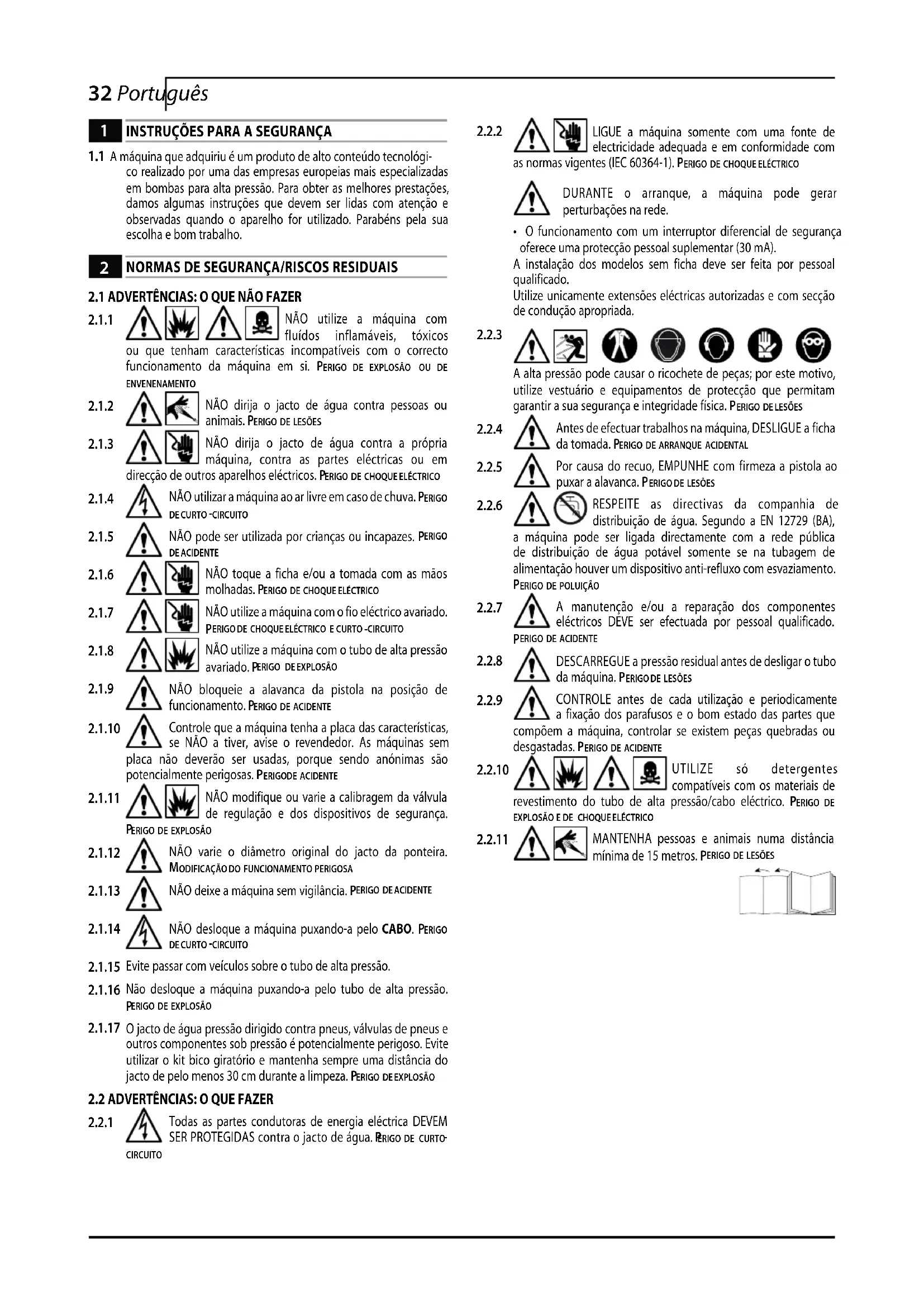 CHOQUE ELÉCTRICODURANTE o arranque, a máquina pode gerar perturbações na rede.• O funcionamento com um interruptor diferencial de segurança oferece uma protecção pessoal suplementar (30 mA).A instalação dos modelos sem ficha deve ser feita por pessoal qualificado.Utilize unicamente extensões eléctricas autorizadas e com secção de condução apropriada. A alta pressão pode causar o ricochete de peças; por este motivo, utilize vestuário e equipamentos de protecção que permitam garantir a sua segurança e integridade física. PERIGO