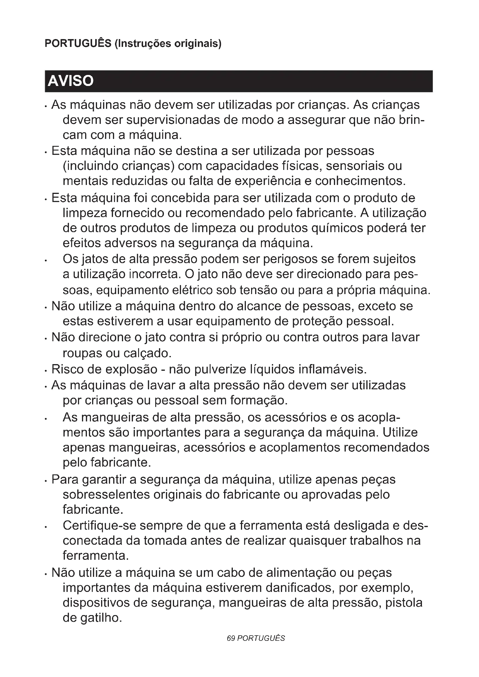 de alta pressão, desligue-a imediatamente e remova a cha da tomada principal. Contacte o seu distribuidor local ou centro de assistência. GUARDE ESTAS INSTRUÇÕES. AVISO: NÃO permita que o conforto ou a familiari- dade com o produto (adquirido com o uso repetido) substi- tua a adesão estrita às regras de segurança da ferramenta. A MÁ INTERPRETAÇÃO ou o não seguimento das regras de segurança estabelecidas neste manual de instruções pode causar danos pessoais graves.