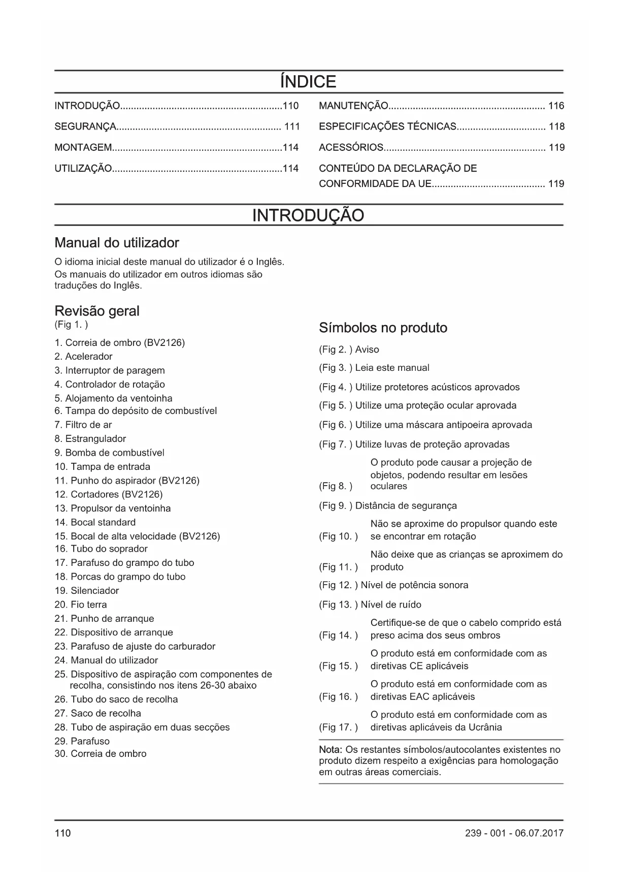 Símbolos no produto (Fig 2. ) Aviso (Fig 3. ) Leia este manual (Fig 4. ) Utilize protetores acústicos aprovados (Fig 5. ) Utilize uma proteção ocular aprovada (Fig 6. ) Utilize uma máscara antipoeira aprovada (Fig 7. ) Utilize luvas de proteção aprovadas (Fig 8. ) O produto pode causar a projeção de objetos, podendo resultar em lesões oculares (Fig 9. ) Distância de segurança (Fig 10. ) Não se aproxime do propulsor quando este se encontrar em rotação (Fig 11. ) Não deixe que as crianças se aproximem do produto (Fig 12. ) Nível de potência sonora (Fig 13. ) Nível de ruído (Fig 14. ) Certifique-se de que o cabelo comprido está preso acima dos seus ombros (Fig 15. ) O produto está em conformidade com as diretivas CE aplicáveis (Fig 16. ) O produto está em conformidade com as diretivas EAC aplicáveis (Fig 17. ) O produto está em conformidade com as diretivas aplicáveis da Ucrânia Nota: Os restantes símbolos/autocolantes existentes no produto dizem respeito a exigências para homologação em outras áreas comerciais.