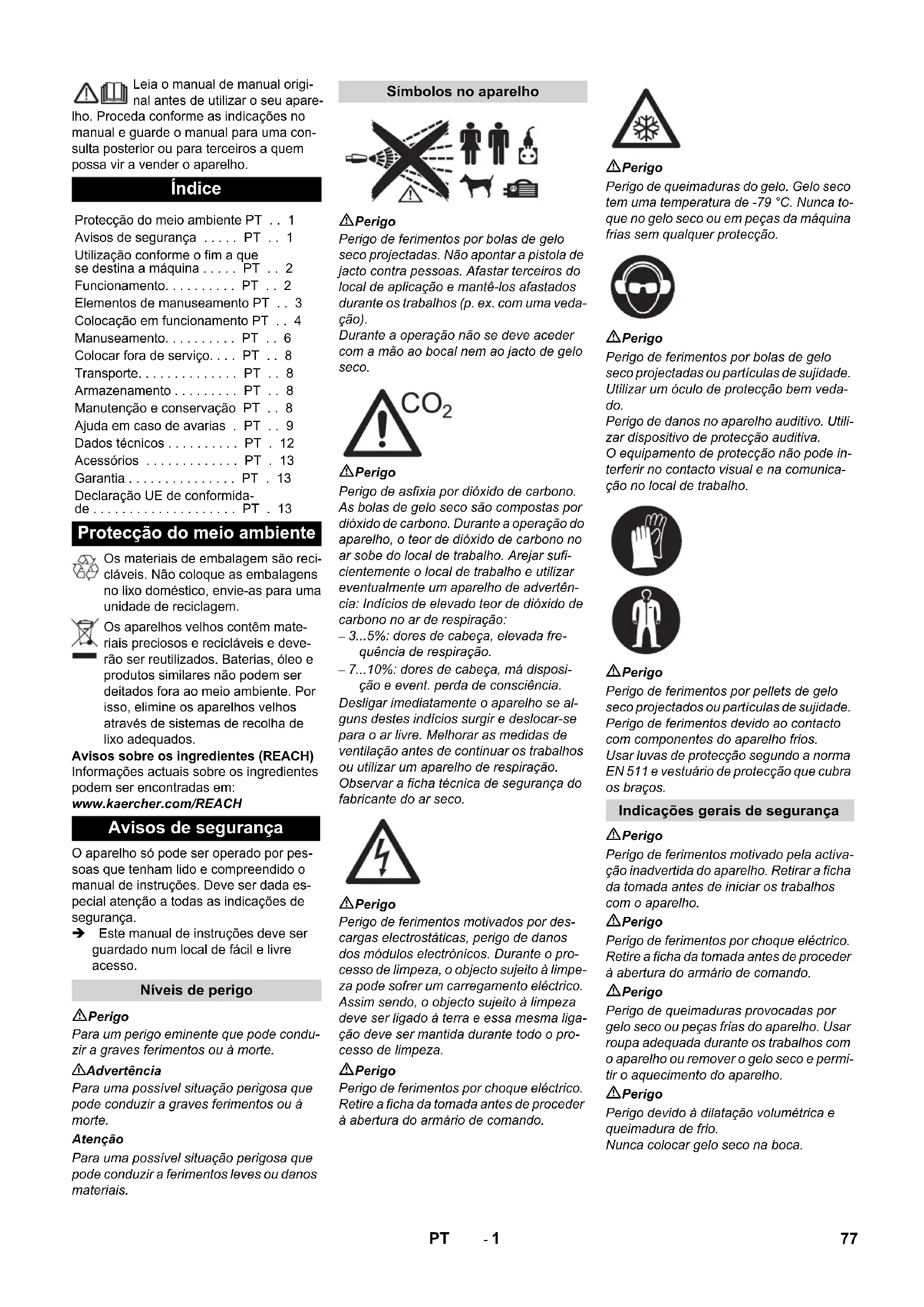 Nº de pieza: 4.130-417.0 Mango Nº de pieza: 6.321-206.0 Scrambler Nº. de pieza: 4.110-015.0 Iluminación de trabajo Nº de pieza: 2.815-422.0 Manguera protectora para la lanza dosifi- cadora, plástico, 100 m Nº de pieza: 6.667-214.0 En todos los países rigen las condiciones de garantía establecidas por nuestra em- presa distribuidora. Las averías del aparato serán subsanadas gratuitamente dentro del periodo de garantía, siempre que se deban a defectos de material o de fabrica- ción. En un caso de garantía, le rogamos que se dirija con el comprobante de com- pra al distribuidor donde adquirió el aparato o al servicio al cliente autorizado más próximo a su domicilio. Por la presente declaramos que la máqui- na designada a continuación cumple, tanto en lo que respecta a su diseño y tipo cons- tructivo como a la versión puesta a la venta por nosotros, las normas básicas de segu- ridad y sobre la salud que figuran en las di- rectivas comunitarias correspondientes. La presente declaración perderá su validez en caso de que se realicen modificaciones en la máquina sin nuestro consentimiento ex- plícito. Los abajo firmantes actúan en nombre y con la autorización de la junta directiva. Responsable de documentación: S. Reiser Alfred Kärcher SE & Co. KG Alfred-Kärcher-Straße 28-40 71364 Winnenden (Germany) Tel.: +49 7195 14-0 Fax: +49 7195 14-2212 Winnenden, 2021/02/01 Accesorios ropa protectora Dispositivo de chorro Garantía Declaración UE de conformi- dad Producto: Dispositivo de chorro de hie- rro seco Modelo: 1.574-xxx Directivas comunitarias aplicables 2011/65/EU 2006/42/CE (+2009/127/CE) 2014/30/UE 2009/125/EG + 2009/1781 Normas armonizadas aplicadas EN 55014–1: 2017 + A11: 2020 EN 55014–2: 2015 EN 60204–1 EN 61000–3–2: 2014 EN 61000–3–3: 2013 EN IEC 63000: 2018 EN 62233: 2008 Normas nacionales aplicadas GS-STE-13 (conforme) Chairman of the Board of Management Director Regulatory Affairs & Certification 76 ES- 1 Leia o manual de manual origi- nal antes de utilizar o seu apare- lho. Proceda conforme as indicações no manual e guarde o manual para uma con- sulta posterior ou para terceiros a quem possa vir a vender o aparelho. Os materiais de embalagem são reci- cláveis. Não coloque as embalagens no lixo doméstico, envie-as para uma unidade de reciclagem. Os aparelhos velhos contêm mate- riais preciosos e recicláveis e deve- rão ser reutilizados. Baterias, óleo e produtos similares não podem ser deitados fora ao meio ambiente. Por isso, elimine os aparelhos velhos através de sistemas de recolha de lixo adequados. Avisos sobre os ingredientes (REACH) Informações actuais sobre os ingredientes podem ser encontradas em: www.kaercher.com/REACH O aparelho só pode ser operado por pes- soas que tenham lido e compreendido o manual de instruções. Deve ser dada es- pecial atenção a todas as indicações de segurança. Este manual de instruções deve ser guardado num local de fácil e livre acesso. Perigo Para um perigo eminente que pode condu- zir a graves ferimentos ou à morte. 몇 Advertência Para uma possível situação perigosa que pode conduzir a graves ferimentos ou à morte. Atenção Para uma possível situação perigosa que pode conduzir a ferimentos leves ou danos materiais. Perigo Perigo de ferimentos por bolas de gelo seco projectadas. Não apontar a pistola de jacto contra pessoas. Afastar terceiros do local de aplicação e mantê-los afastados durante os trabalhos (p. ex. com uma veda- ção). Durante a operação não se deve aceder com a mão ao bocal nem ao jacto de gelo seco. Perigo Perigo de asfixia por dióxido de carbono. As bolas de gelo seco são compostas por dióxido de carbono. Durante a operação do aparelho, o teor de dióxido de carbono no ar sobe do local de trabalho. Arejar sufi- cientemente o local de trabalho e utilizar eventualmente um aparelho de advertên- cia: Indícios de elevado teor de dióxido de carbono no ar de respiração: – 3...5%: dores de cabeça, elevada fre- quência de respiração. – 7...10%: dores de cabeça, má disposi- ção e event. perda de consciência. Desligar imediatamente o aparelho se al- guns destes indícios surgir e deslocar-se para o ar livre. Melhorar as medidas de ventilação antes de continuar os trabalhos ou utilizar um aparelho de respiração. Observar a ficha técnica de segurança do fabricante do ar seco. Perigo Perigo de ferimentos motivados por des- cargas electrostáticas, perigo de danos dos módulos electrónicos. Durante o pro- cesso de limpeza, o objecto sujeito à limpe- za pode sofrer um carregamento eléctrico. Assim sendo, o objecto sujeito à limpeza deve ser ligado à terra e essa mesma liga- ção deve ser mantida durante todo o pro- cesso de limpeza. Perigo Perigo de ferimentos por choque eléctrico. Retire a ficha da tomada antes de proceder à abertura do armário de comando. Perigo Perigo de queimaduras do gelo. Gelo seco tem uma temperatura de -79 °C. Nunca to- que no gelo seco ou em peças da máquina frias sem qualquer protecção. Perigo Perigo de ferimentos por bolas de gelo seco projectadas ou partículas de sujidade. Utilizar um óculo de protecção bem veda- do. Perigo de danos no aparelho auditivo. Utili- zar dispositivo de protecção auditiva. O equipamento de protecção não pode in- terferir no contacto visual e na comunica- ção no local de trabalho. Perigo Perigo de ferimentos por pellets de gelo seco projectados ou partículas de sujidade. Perigo de ferimentos devido ao contacto com componentes do aparelho frios. Usar luvas de protecção segundo a norma EN 511 e vestuário de protecção que cubra os braços. Perigo Perigo de ferimentos motivado pela activa- ção inadvertida do aparelho. Retirar a ficha da tomada antes de iniciar os trabalhos com o aparelho. Perigo Perigo de ferimentos por choque eléctrico. Retire a ficha da tomada antes de proceder à abertura do armário de comando. Perigo Perigo de queimaduras pr