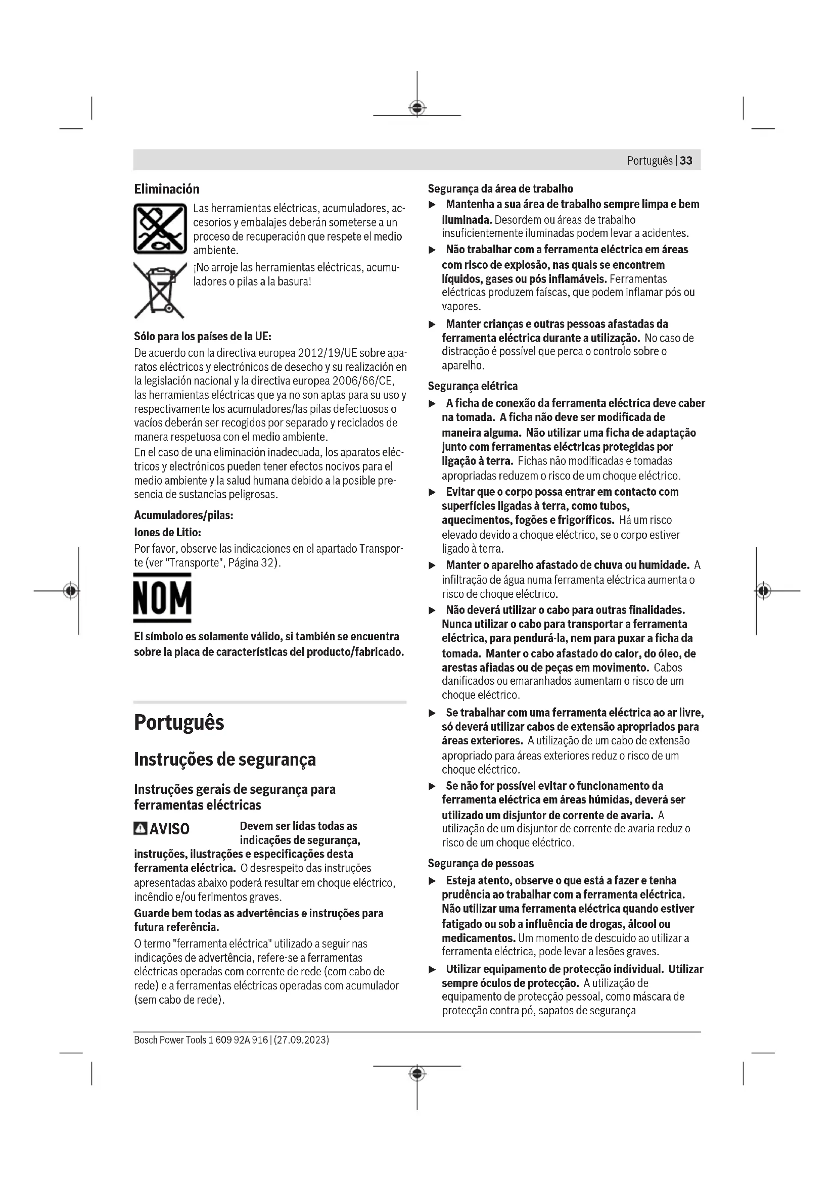 Regule el anillo de ajuste de la preselección del par de giro(3) al par de giro deseado. Ponga el anillo de ajuste de la preselección del modo de operación(4) en la posición del símbolo "Tala- drado/Atornillado MÁX" para obtener el máxi- mo par de giro. Atornillar y taladrar Para enroscar tornillos grandes y para taladrar, coloque el anillo de ajuste de la preselección del modo de operación (4) en el símbolo "Tala- drado/Atornillado MÁX". Taladrar con percusión Para taladrar con percusión en mampostería, coloque el anillo de ajuste de la preselección del modo de operación (4) en el símbolo de "Taladrado con percusión". Retención automática del husillo (Auto-Lock) Cuando el interruptor de conexión/desconexión (10) no es- tá presionado, el husillo de taladrar y así el portaútiles (1) está bloqueado. Esto permite enroscar tornillos a mano también con el acu- mulador (7) descargado o emplear la herramienta eléctrica como destornillador. Protección contra sobrecarga térmica La herramienta eléctrica no puede sobrecargarse si se reali- za un uso apropiado y conforme a lo descrito. Si se carga en exceso la herramienta o la temperatura del acumulador se sale del margen permitido, el sistema electrónico desconec- ta la herramienta eléctrica, hasta que ésta se encuentre de nuevo en el margen óptimo de temperatura de servicio. Instrucciones de trabajo u Solamente aplique la herramienta eléctrica desconec- tada contra la tuerca o tornillo. Los útiles en rotación pueden resbalar. Tras un trabajo prolongado con pequeño número de revolu- ciones, debería dejar funcionar herramienta eléctrica duran- te aprox. 3 minuto con máximo número de revoluciones en vacío para el enfriamiento. Mantenimiento y servicio Mantenimiento y limpieza u Desmonte el acumulador antes de manipular la herra- mienta eléctrica (p. ej. en el mantenimiento, cambio de útil, etc.) así como al transportarla y guardarla. En caso contrario podría accidentarse al accionar fortuita- mente el interruptor de conexión/desconexión. u Mantenga limpia la herramienta eléctrica y las rejillas de refrigeración para trabajar con eficacia y seguri- dad. Servicio técnico y atención al cliente El servicio técnico le asesorará en las consultas que pueda Ud. tener sobre la reparación y mantenimiento de su produc- to, así como sobre piezas de recambio. Las representacio- nes gráficas tridimensionales e informaciones de repuestos se encuentran también bajo: www.bosch-pt.com El equipo asesor de aplicaciones de Bosch le ayuda gustosa- mente en caso de preguntas sobre nuestros productos y sus accesorios. Para cualquier consulta o pedido de piezas de repuesto es imprescindible indicar el nº de artículo de 10dígitos que fi- gura en la placa de características del producto. España Robert Bosch España S.L.U. Departamento de ventas Herramientas Eléctricas C/Hermanos García Noblejas, 19 28037 Madrid Para efectuar su pedido online de recambios o pedir la reco- gida para la reparación de su máquina, entre en la página www.herramientasbosch.net. Tel. Asesoramiento al cliente: 902 531 553 Fax: 902 531554 Direcciones de servicio adicionales se encuentran bajo: www.bosch-pt.com/serviceaddresses Transporte Los acumuladores de iones de litio recomendados están su- jetos a los requerimientos de la ley de mercancías peligro- sas. Los acumuladores pueden ser transportados por carre- tera por el usuario sin más imposiciones. En el envío por terceros (p.ej., transporte aéreo o por agen- cia de transportes) deberán considerarse las exigencias es- peciales en cuanto a su embalaje e identificación. En este ca- so deberá recurrirse a los servicios de un experto en mercan- cías peligrosas al preparar la pieza para su envío. Únicamente envíe acumuladores si su carcasa no está daña- da. Si los contactos no van protegidos cúbralos con cinta adhesiva y embale el acumulador de manera que éste no se pueda mover dentro del embalaje. Observe también las prescripciones adicionales que pudieran existir al respecto en su país. 1 609 92A 916 | (27.09.2023) Bosch Power ToolsPortuguês | 33 Eliminación Las herramientas eléctricas, acumuladores, ac- cesorios y embalajes deberán someterse a un proceso de recuperación que respete el medio ambiente. ¡No arroje las herramientas eléctricas, acumu- ladores o pilas a la basura! Sólo para los países de laUE: De acuerdo con la directiva europea 2012/19/UE sobre apa- ratos eléctricos y electrónicos de desecho y su realización en la legislación nacional y la directiva europea 2006/66/CE, las herramientas eléctricas que ya no son aptas para su uso y respectivamente los acumuladores/las pilas defectuosos o vacíos deberán ser recogidos por separado y reciclados de manera respetuosa con el medio ambiente. En el caso de una eliminación inadecuada, los aparatos eléc- tricos y electrónicos pueden tener efectos nocivos para el medio ambiente y la salud humana debido a la posible pre- sencia de sustancias peligrosas. Acumuladores/pilas: Iones de Litio: Por favor, observe las indicaciones en el apartado Transpor- te (ver "Transporte", Página32). El símbolo es solamente válido, si también se encuentra sobre la placa de características del producto/fabricado. Português Instruções de segurança Instruções gerais de segurança para ferramentas eléctricas AVISO Devem ser lidas todas as indicações de segurança, instruções, ilustrações e especificações desta ferramenta eléctrica. O desrespeito das instruções apresentadas abaixo poderá resultar em choque eléctrico, incêndio e/ou ferimentos graves. Guarde bem todas as advertências e instruções para futura referência. O termo "ferramenta eléctrica" utilizado a seguir nas indicações de advertência, refere‑se a ferramentas eléctricas operadas com corrente de rede (com cabo de rede) e a ferramentas eléctricas operadas com acumulador (sem cabo de rede). Segurança da área de trabalho u Ma