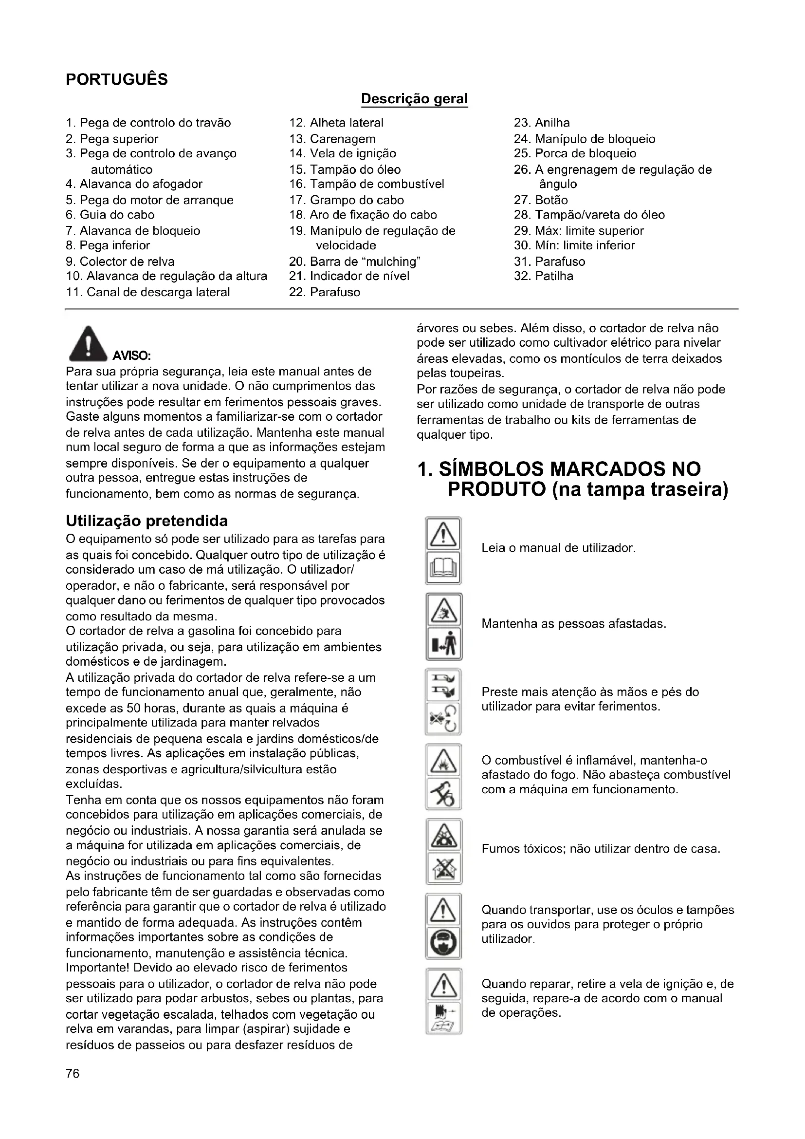 Leia o manual de utilizador. Mantenha as pessoas afastadas. Preste mais atenção às mãos e pés do utilizador para evitar ferimentos. O combustível é inflamável, mantenha-o afastado do fogo. Não abasteça combustível com a máquina em funcionamento. Fumos tóxicos; não utilizar dentro de casa. Quando transportar, use os óculos e tampões para os ouvidos para proteger o próprio utilizador. Quando reparar, retire a vela de ignição e, de seguida, repare-a de acordo com o manual de operações.77