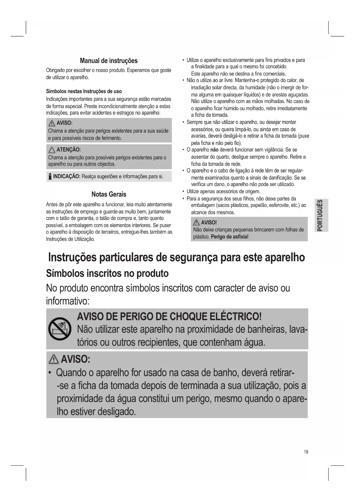 - Para a segurança dos seus lhos, não deixe partes da embalagem (sacos plásticos, papelão, esferovite, etc.) ao alcance dos mesmos. AVISO! Não deixe crianças pequenas brincarem com folhas de plástico. Perigo de asxia! Instruções particulares de segurança para este aparelho Símbolos inscritos no produto No produto encontra símbolos inscritos com caracter de aviso ou informativo: AVISO DE PERIGO DE CHOQUE ELÉCTRICO! Não utilizar este aparelho na proximidade de banheiras, lava- tórios ou outros recipientes, que contenham água. AVISO: