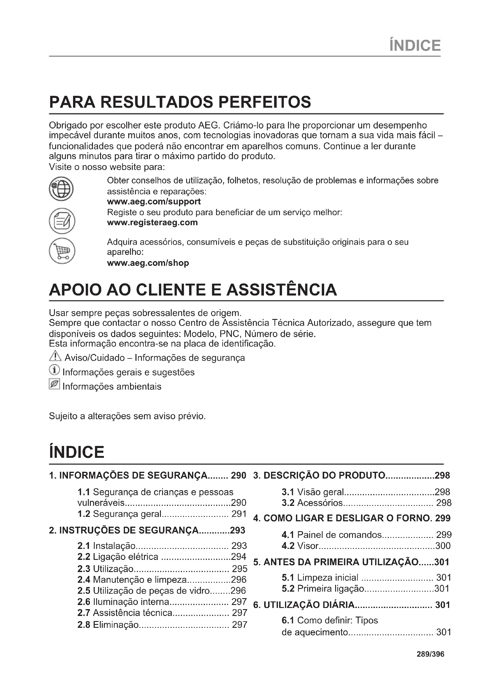 Obrigado por escolher este produto AEG. Criámo-lo para lhe proporcionar um desempenho impecável durante muitos anos, com tecnologias inovadoras que tornam a sua vida mais fácil – funcionalidades que poderá não encontrar em aparelhos comuns. Continue a ler durante alguns minutos para tirar o máximo partido do produto. Visite o nosso website para: Obter conselhos de utilização, folhetos, resolução de problemas e informações sobre assistência e reparações: www.aeg.com/support Registe o seu produto para beneficiar de um serviço melhor: www.registeraeg.com Adquira acessórios, consumíveis e peças de substituição originais para o seu aparelho: www.aeg.com/shop
