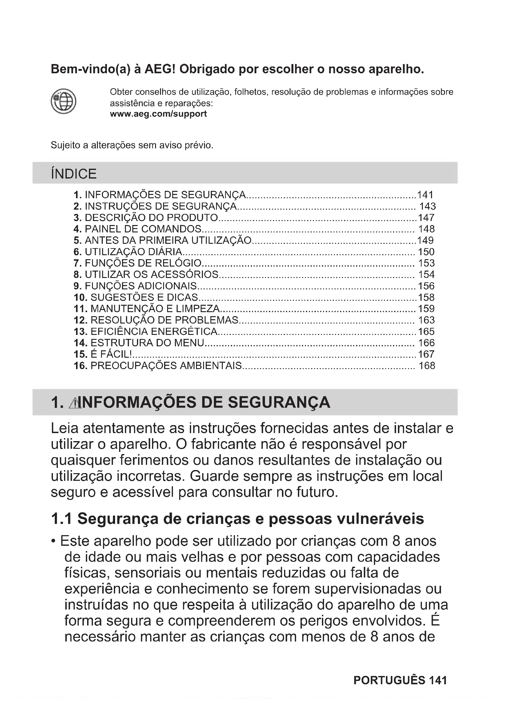 - Este aparelho pode ser utilizado por crianças com 8 anos de idade ou mais velhas e por pessoas com capacidades físicas, sensoriais ou mentais reduzidas ou falta de experiência e conhecimento se forem supervisionadas ou instruídas no que respeita à utilização do aparelho de uma forma segura e compreenderem os perigos envolvidos. É necessário manter as crianças com menos de 8 anos de PORTUGUÊS 141idade e pessoas com incapacidades muito extensas e complexas afastadas do aparelho, a menos que sejam constantemente vigiadas.
