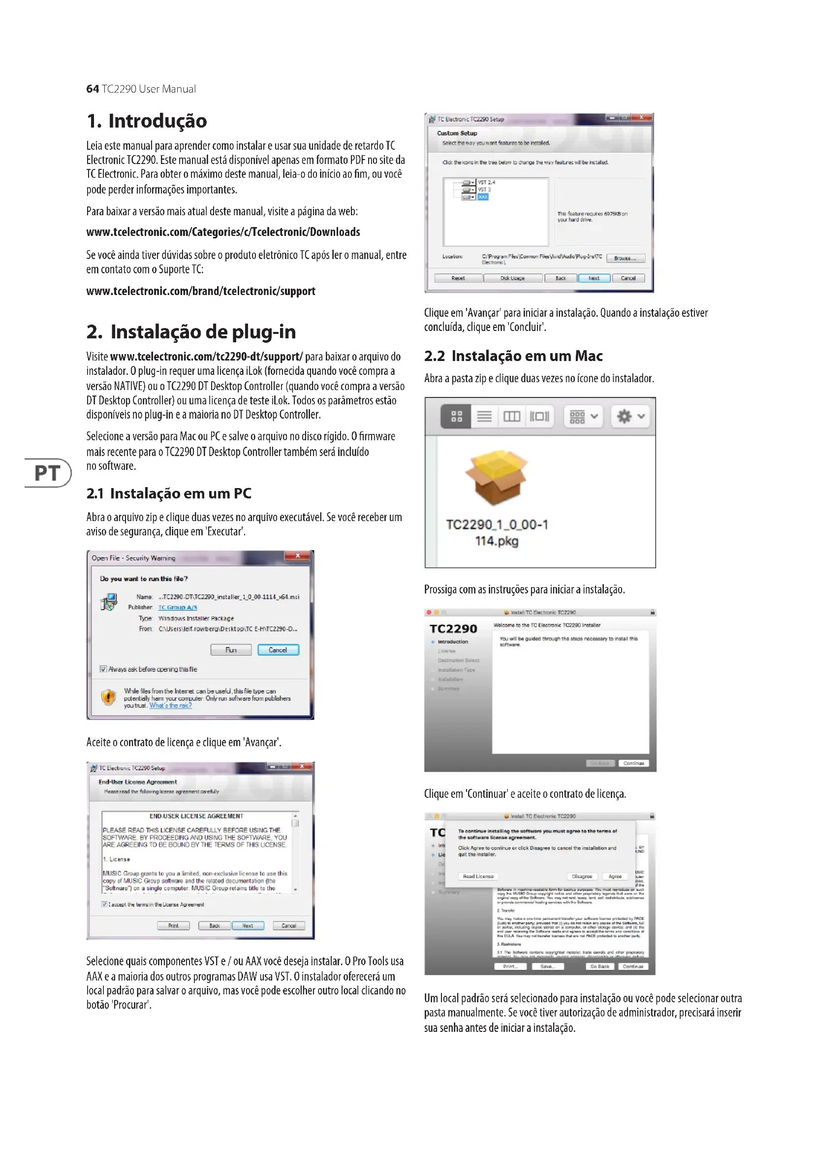Visite www.tcelectronic.com/tc2290-dt/support/ para baixar o arquivo do instalador. O plug-in requer uma licença iLok (fornecida quando você compra a versão NATIVE) ou o TC2290 DT Desktop Controller (quando você compra a versão DT Desktop Controller) ou uma licença de teste iLok. Todos os parâmetros estão disponíveis no plug-in e a maioria no DT Desktop Controller. Selecione a versão para Mac ou PC e salve o arquivo no disco rígido. O rmware mais recente para o TC2290 DT Desktop Controller também será incluído no software.