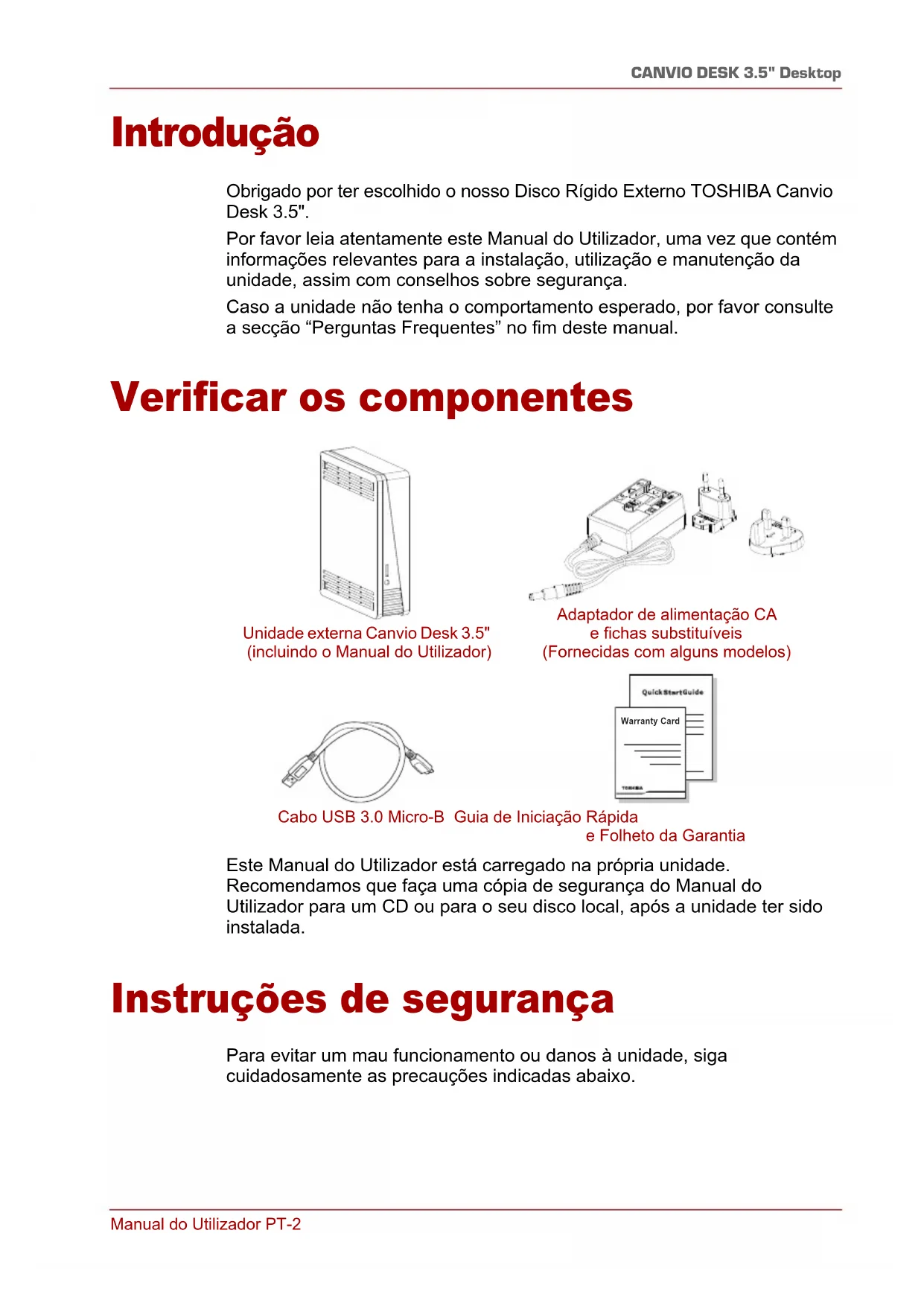 Limpeza da caixa Antes de limpar a unidade, certifique-se de que esta está fisicamente desligada do computador. Sugerimos que utilize produtos de limpeza normais para a limpar certificando-se que quaisquer resíduos do líquido de limpeza são bem removidos. Informações adicionais Para outras operações normais tais como alterar o nome da unidade, fazer um backup de dados ou gerir ficheiros, sugerimos que leia o manual de utilização do sistema operativo do seu computador. Sugerimos também que consulte o manual de utilização do seu sistema operativo para executar tarefas de manutenção tais como desfragmentar e optimizar a operação do disco. Sugerimos também que instale um software antivírus para proteger os seus dados contra danos provocados por vírus ou programas “troianos”.Manual do Utilizador PT-7 CANVIO DESK 3.5" Desktop Perguntas frequentes P: Tenho de formatar a minha unidade depois de a instalar? R: A unidade já foi formatada pelo fabricante com o sistema de ficheiros NTFS. Não é necessária qualquer outra operação de formatação quando utilizada com um PC com MS Windows. Para que seja totalmente compatível com os sistemas operativos Apple Mac, a unidade deve ser reformatada com o sistema de ficheiros HFS+. Veja as necessárias instruções no manual do utilizador do seu Mac. P: Tenho de utilizar controladores USB para o Windows Vista, Windows 7, 8, 8.1? R: Não, já estão disponíveis com os seu sistema operativo. P: Posso fazer o arranque do meu sistema a partir da unidade? R: Não, porque o Windows não suporta o arranque a partir de discosrígidos externos. P: Porque é que a unidade não necessita de um ventilador? R: As unidades foram concebidas para terem uma dissipação de calor óptima e por isso não necessitam de um ventilador. Isso faz com que a sua operação seja praticamente silenciosa. P: Porque razão a capacidade do meu disco (conforme mostrada no Windows) é inferior à capacidade anunciada do disco? R: Esta diferença pode ser explicada pelos diferentes métodos utilizados para calcular a capacidade. Os fabricantes de discos rígidos fazem o cálculo utilizando o sistema decimal, enquanto que os sistema operativos utilizam o sistema binário. Exemplo decimal: 1GB = 1.000MB = 1.000.000KB = 1.000.000.000 bytes Exemplo binário: 1GB = 1.024MB = 1.048.576KB = 1.073.741.824 bytes Como resultado, um disco com 120GB (decimal) é mostrado no Windows como tendo 112GB (binário). P: Posso utilizar o meu disco rígido para copiar um sistema operativo de um computador para outro? R: Não, deve seguir as instruções do fornecedor do sistema operativo para fazer a instalação. Uma cópia simples não funciona. A formatação de um disco rígido elimina todos os dados que nele estejam gravados. Aconselhamos que faça uma cópia de segurança antes de continuar com o processo de formatação. NOTAManual do Utilizador PT-8 CANVIO DESK 3.5" Desktop P: A Toshiba disponibiliza serviços de recuperação e dados? R: Sim, a Toshiba disponibiliza um Serviço de Recuperação de Dados para unidades externas. Por favor veja no nosso website www.toshiba-europe.com/services mais informações sobre este serviço. Resolução de problemas O meu computador não reconhece o disco rígido. ■ Verifique se todas as ligações estão correctas e bem firmes. ■ Se utilizar um cartão add-on, certifique-se de que está a funcionar correctamente e actualize o software/firmware. Existe perigo se a unidade estiver quente durante a operação? R: Isso é normal e não apresenta por isso qualquer perigo. A unidade apresenta uma mensagem de erro “Device cannot start.” R: Existem duas razões possíveis. Ou se trata de um problema de alimentação e deve verificar as ligações, ou a unidade tem uma avaria e necessita de manutenção. Não consigo ver a minha unidade no “Meu Computador”, mas aparece no Gestor de Dispositivos. R: Siga estas instruções: