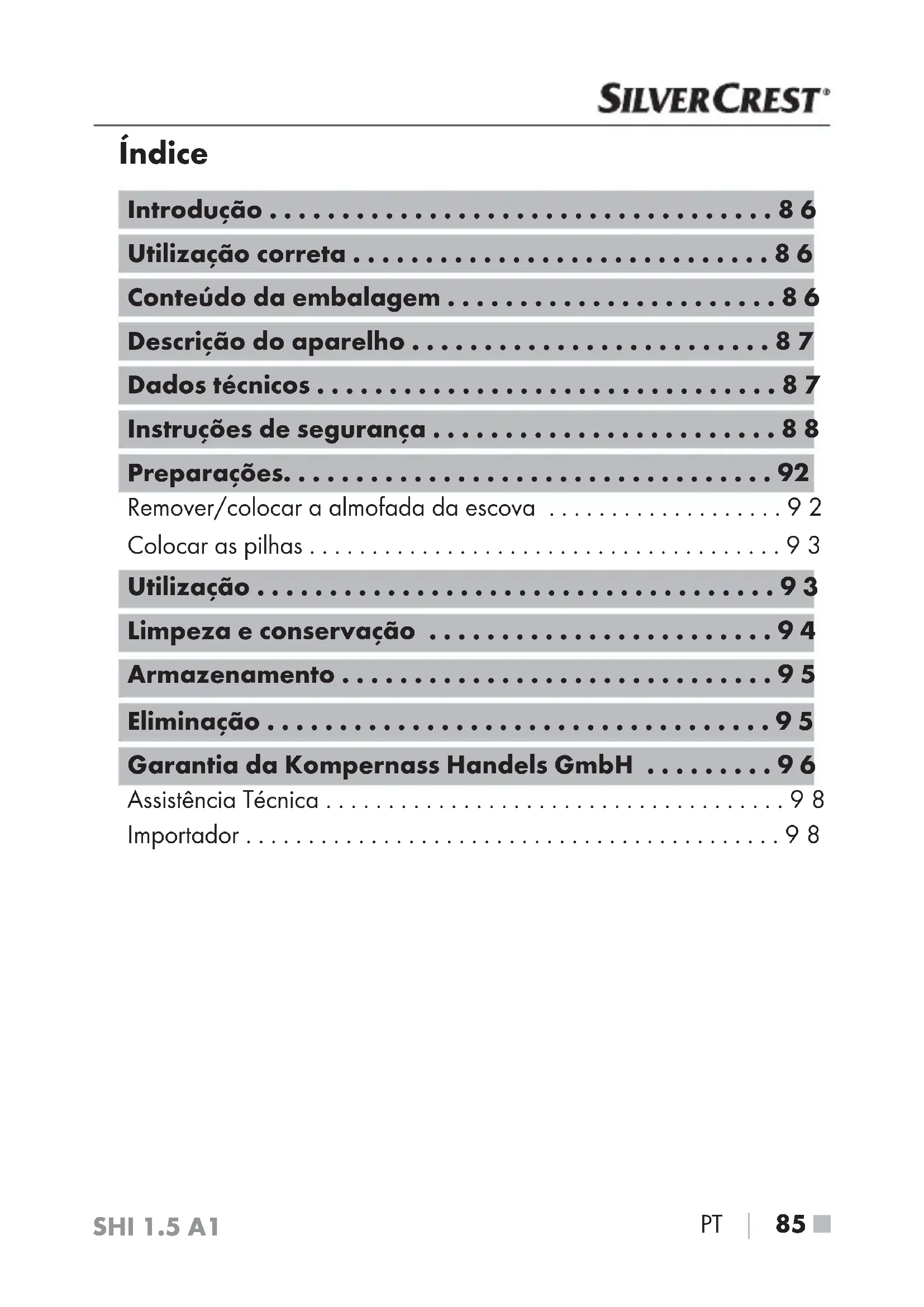 - ALEMANIA www.kompernass.comSHI 1.5 A1 PT │ 85 ■ Índice Introdução p. 86