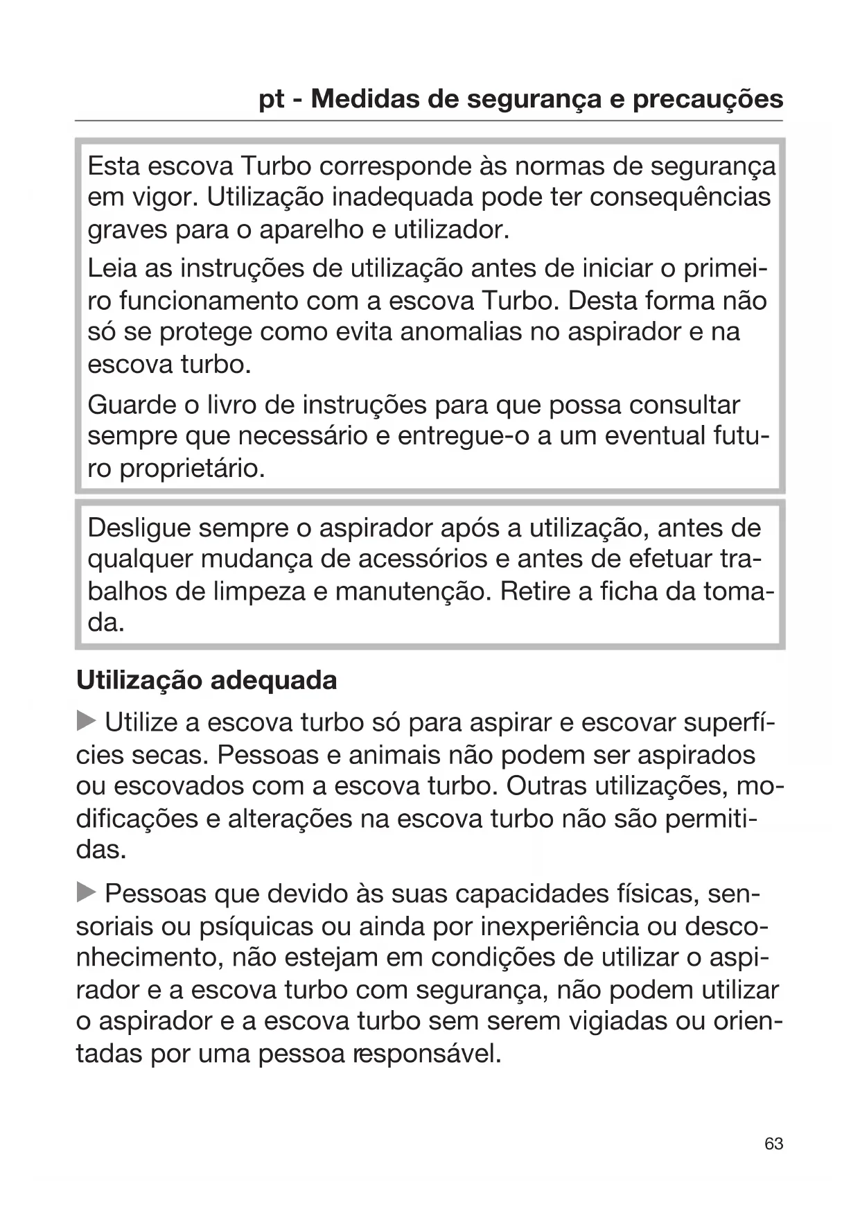 Esta escova Turbo corresponde às normas de segurança em vigor. Utilização inadequada pode ter consequências graves para o aparelho e utilizador. Leia as instruções de utilização antes de iniciar o primei- ro funcionamento com a escova Turbo. Desta forma não só se protege como evita anomalias no aspirador e na escova turbo. Guarde o livro de instruções para que possa consultar sempre que necessário e entregue-o a um eventual futu- ro proprietário. Desligue sempre o aspirador após a utilização, antes de qualquer mudança de acessórios e antes de efetuar tra- balhos de limpeza e manutenção. Retire a ficha da toma- da. Utilização adequada Utilize a escova turbo só para aspirar e escovar superfí- cies secas. Pessoas e animais não podem ser aspirados ou escovados com a escova turbo. Outras utilizações, mo- dificações e alterações na escova turbo não são permiti- das. Pessoas que devido às suas capacidades físicas, sen- soriais ou psíquicas ou ainda por inexperiência ou desco- nhecimento, não estejam em condições de utilizar o aspi- rador e a escova turbo com segurança, não podem utilizar o aspirador e a escova turbo sem serem vigiadas ou orien- tadas por uma pessoa r esponsável.pt - Medidas de segurança e precauções
