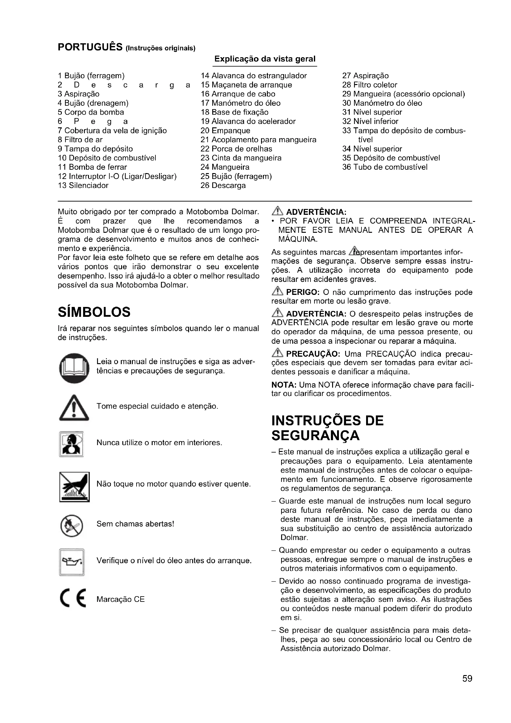 SEGURANÇA – Este manual de instruções explica a utilização geral e precauções para o equipamento. Leia atentamente este manual de instruções antes de colocar o equipa- mento em funcionamento. E observe rigorosamente os regulamentos de segurança. – Guarde este manual de instruções num local seguro para futura referência. No caso de perda ou dano deste manual de instruções, peça imediatamente a sua substituição ao centro de assistência autorizado Dolmar. – Quando emprestar ou ceder o equipamento a outras pessoas, entregue sempre o manual de instruções e outros materiais informativos com o equipamento. – Devido ao nosso continuado programa de investiga- ção e desenvolvimento, as especificações do produto estão sujeitas a alteração sem aviso. As ilustrações ou conteúdos neste manual podem diferir do produto em si. – Se precisar de qualquer assistência para mais deta- lhes, peça ao seu concessionário local ou Centro de Assistência autorizado Dolmar. Leia o manual de instruções e siga as adver- tências e precauções de segurança. Tome especial cuidado e atenção. Nunca utilize o motor em interiores. Não toque no motor quando estiver quente. Sem chamas abertas! Verifique o nível do óleo antes do arranque. Marcação CE60 Utilização prevista da máquina Este equipamento serve apenas para rega e água de irri- gação. Este equipamento é usado apenas para bombear água limpa. PERIGO: