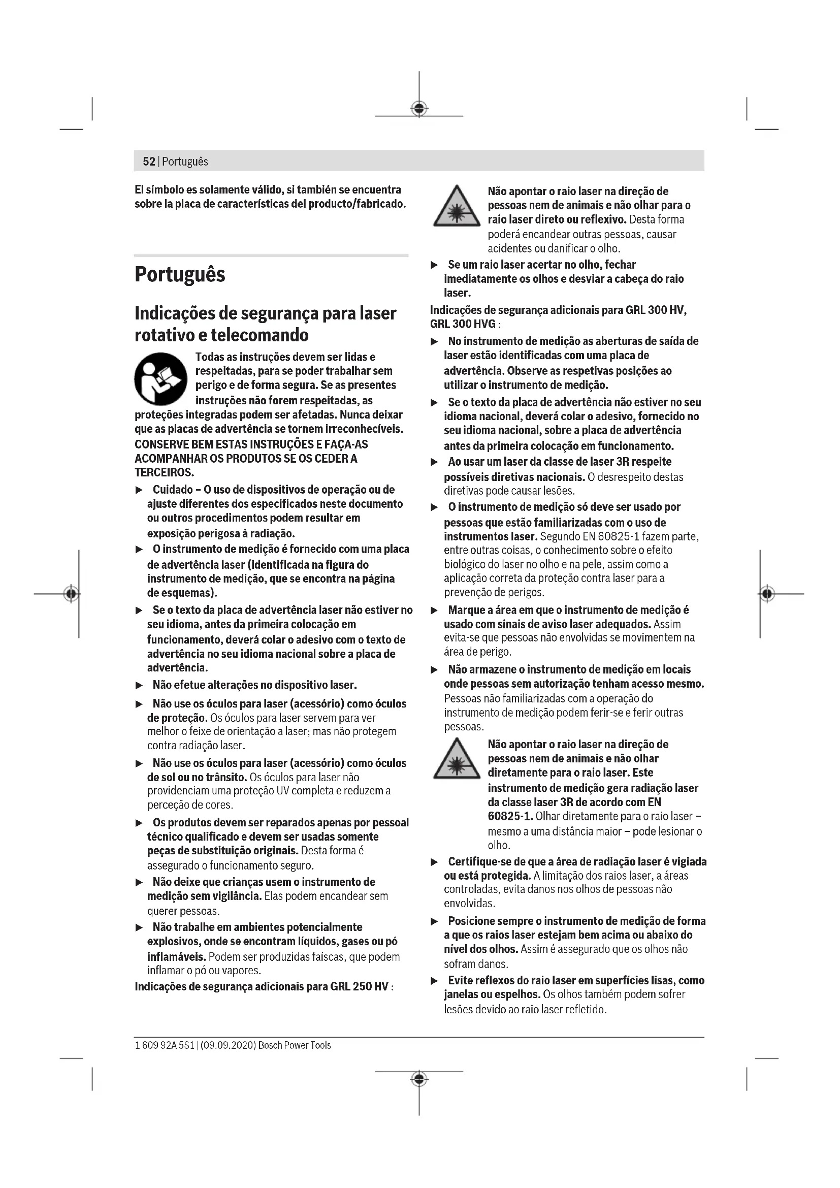 Margen de autonivelación sobrepasado 2×/s ○ ● Advertencia de impacto activada ● Advertencia de impacto disparada 2×/s ○ 2×/s Tensión de pila/acumulador para ≤2h de fun- cionamiento 2×/s Pilas/acumuladores agotados ○ ○ ● ●:Servicio permanente 2×/s: frecuencia de intermitencia (p. ej. dos veces en un segundo) ○:Función detenida Mantenimiento y servicio Mantenimiento y limpieza Mantenga siempre limpios el aparato de medición, el carga- dor y el mando a distancia. No sumerja el aparato de medición, el cargador ni el mando a distancia en el agua o en otros líquidos. Limpiar el aparato con un paño húmedo y suave. No utilice ningún detergente o disolvente. Limpie con regularidad el instrumento de medición, espe- cialmente las superficies de la abertura de salida del láser y evite que queden pelusas. Servicio técnico y atención al cliente El servicio técnico le asesorará en las consultas que pueda Ud. tener sobre la reparación y mantenimiento de su produc- to, así como sobre piezas de recambio. Las representacio- nes gráficas tridimensionales e informaciones de repuestos se encuentran también bajo: www.bosch-pt.com El equipo asesor de aplicaciones de Bosch le ayuda gustosa- mente en caso de preguntas sobre nuestros productos y sus accesorios. Para cualquier consulta o pedido de piezas de repuesto es imprescindible indicar el nº de artículo de 10dígitos que fi- gura en la placa de características del producto. España Robert Bosch España S.L.U. Departamento de ventas Herramientas Eléctricas C/Hermanos García Noblejas, 19 28037 Madrid Para efectuar su pedido online de recambios o pedir la reco- gida para la reparación de su máquina, entre en la página www.herramientasbosch.net. Tel. Asesoramiento al cliente: 902 531 553 Fax: 902 531554 México Robert Bosch S. de R.L. de C.V. Calle Robert Bosch No. 405 C.P. 50071 Zona Industrial, Toluca - Estado de México Tel.: (52) 55 528430-62 Tel.: 800 6271286 www.bosch-herramientas.com.mx Direcciones de servicio adicionales se encuentran bajo: www.bosch-pt.com/serviceaddresses Eliminación Los aparatos eléctricos, acumuladores/pilas, ac- cesorios y embalaje deben reciclarse de forma respetuosa con el medio ambiente. ¡No elimine los aparatos eléctricos ni acumulado- res/pilas con la basura doméstica! Sólo para los países de laUE: De acuerdo con las directivas europeas 2012/19/UE y 2006/66/CE, los aparatos eléctricos que ya no son aptos para su uso y los acumuladores y pilas defectuosos o vacíos deberán ser recogidos por separado y reciclados de manera respetuosa con el medio ambiente. Bosch Power Tools 1 609 92A 5S1 | (09.09.2020)52 | Português El símbolo es solamente válido, si también se encuentra sobre la placa de características del producto/fabricado. Português Indicações de segurança para laser rotativo e telecomando Todas as instruções devem ser lidas e respeitadas, para se poder trabalhar sem perigo e de forma segura. Se as presentes instruções não forem respeitadas, as proteções integradas podem ser afetadas. Nunca deixar que as placas de advertência se tornem irreconhecíveis. CONSERVE BEM ESTAS INSTRUÇÕES E FAÇA-AS ACOMPANHAR OS PRODUTOS SE OS CEDER A TERCEIROS. u Cuidado – O uso de dispositivos de operação ou de ajuste diferentes dos especificados neste documento ou outros procedimentos podem resultar em exposição perigosa à radiação. u O instrumento de medição é fornecido com uma placa de advertência laser (identificada na figura do instrumento de medição, que se encontra na página de esquemas). u Se o texto da placa de advertência laser não estiver no seu idioma, antes da primeira colocação em funcionamento, deverá colar o adesivo com o texto de advertência no seu idioma nacional sobre a placa de advertência. u Não efetue alterações no dispositivo laser. u Não use os óculos para laser (acessório) como óculos de proteção. Os óculos para laser servem para ver melhor o feixe de orientação a laser; mas não protegem contra radiação laser. u Não use os óculos para laser (acessório) como óculos de sol ou no trânsito. Os óculos para laser não providenciam uma proteção UV completa e reduzem a perceção de cores. u Os produtos devem ser reparados apenas por pessoal técnico qualificado e devem ser usadas somente peças de substituição originais. Desta forma é assegurado o funcionamento seguro. u Não deixe que crianças usem o instrumento de medição sem vigilância. Elas podem encandear sem querer pessoas. u Não trabalhe em ambientes potencialmente explosivos, onde se encontram líquidos, gases ou pó inflamáveis. Podem ser produzidas faíscas, que podem inflamar o pó ou vapores. Indicações de segurança adicionais para GRL250HV : Não apontar o raio laser na direção de pessoas nem de animais e não olhar para o raio laser direto ou reflexivo. Desta forma poderá encandear outras pessoas, causar acidentes ou danificar o olho. u Se um raio laser acertar no olho, fechar imediatamente os olhos e desviar a cabeça do raio laser. Indicações de segurança adicionais para GRL300HV, GRL300HVG : u No instrumento de medição as aberturas de saída de laser estão identificadas com uma placa de advertência. Observe as respetivas posições ao utilizar o instrumento de medição. u Se o texto da placa de advertência não estiver no seu idioma nacional, deverá colar o adesivo, fornecido no seu idioma nacional, sobre a placa de advertência antes da primeira colocação em funcionamento. u Ao usar um laser da classe de laser 3R respeite possíveis diretivas nacionais. O desrespeito destas diretivas pode causar lesões. u O instrumento de medição só deve ser usado por pessoas que estão familiarizadas com o uso de instrumentos laser. Segundo EN 60825-1 fazem parte, entre outras coisas, o conhecimento sobre o efeito biológico do laser no olho e na pele, assim como a aplicação correta da proteção contra laser para a pre