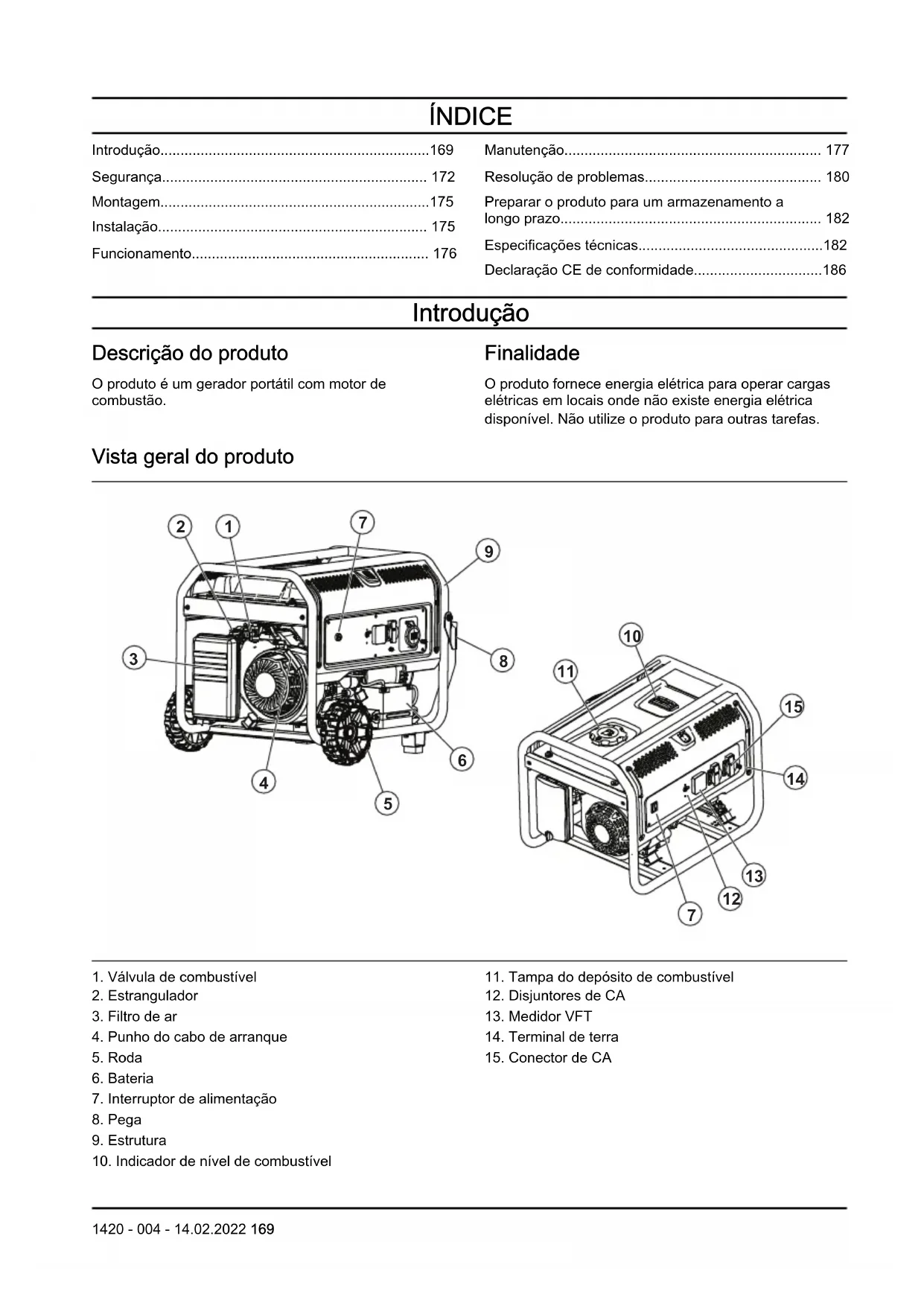 - Declaração CE de conformidade Introdução Descrição do produto O produto é um gerador portátil com motor de combustão. Finalidade O produto fornece energia elétrica para operar cargas elétricas em locais onde não existe energia elétrica disponível. Não utilize o produto para outras tarefas. Vista geral do produto p. 186