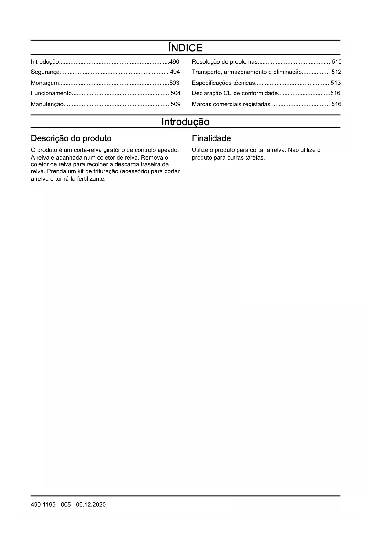- Marcas comerciais registadas Introdução Descrição do produto O produto é um corta-relva giratório de controlo apeado. A relva é apanhada num coletor de relva. Remova o coletor de relva para recolher a descarga traseira da relva. Prenda um kit de trituração (acessório) para cortar a relva e torná-la fertilizante. Finalidade Utilize o produto para cortar a relva. Não utilize o produto para outras tarefas. 490 1199 - 005 - 09.12.2020Vista geral do produto p. 516