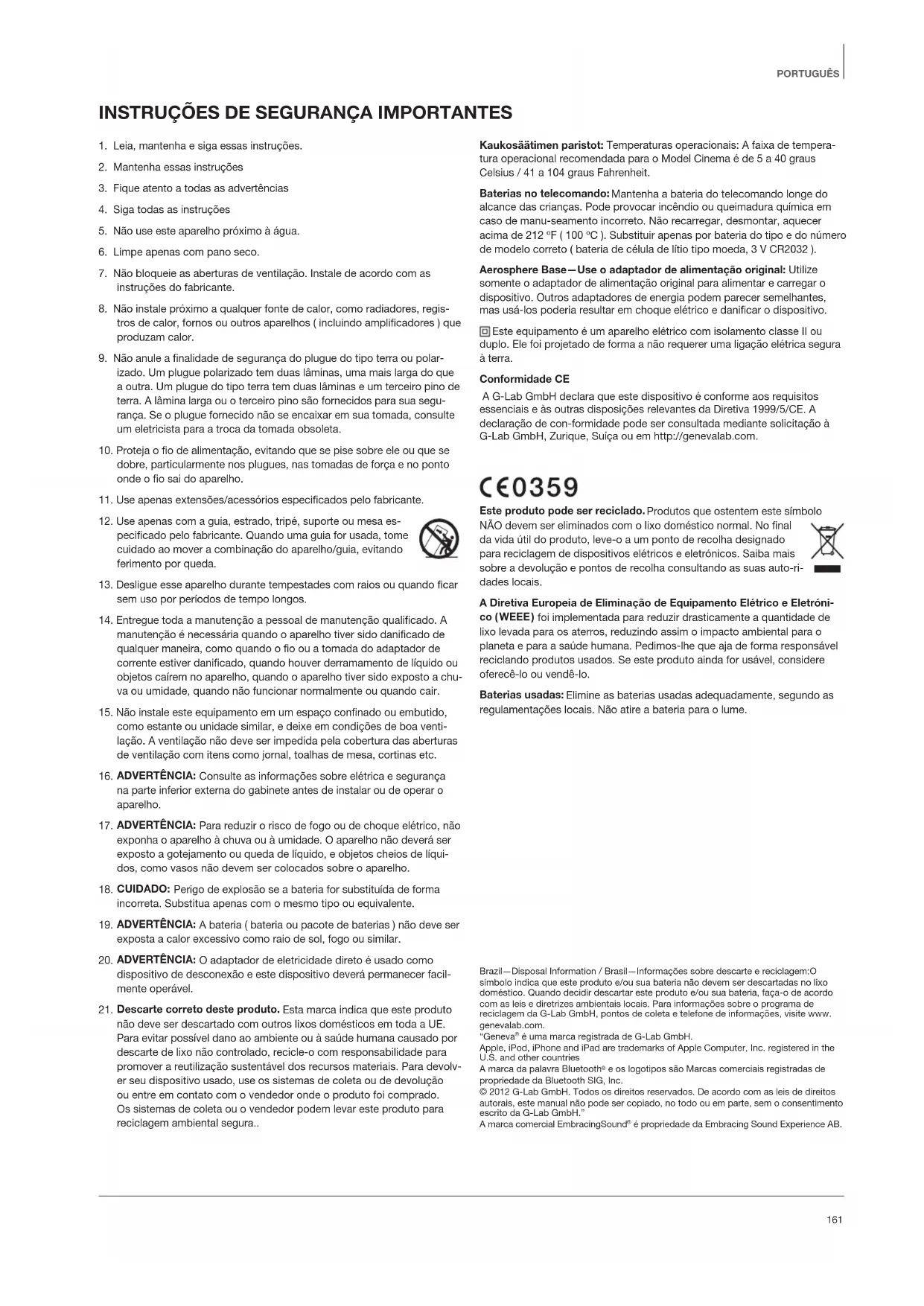 Descarte correto deste produto. Esta marca indica que este produto não deve ser descartado com outros lixos domésticos em toda a UE. Para evitar possível dano ao ambiente ou à saúde humana causado por descarte de lixo não controlado, recicle-o com responsabilidade para promover a reutilização sustentável dos recursos materiais. Para devolv- er seu dispositivo usado, use os sistemas de coleta ou de devolução ou entre em contato com o vendedor onde o produto foi comprado. Os sistemas de coleta ou o vendedor podem levar este produto para reciclagem ambiental segura.. Kaukosäätimen paristot: Temperaturas operacionais: A faixa de tempera- tura operacional recomendada para o Model Cinema é de 5 a 40 graus Celsius / 41 a 104 graus Fahrenheit. Baterias no telecomando: Mantenha a bateria do telecomando longe do alcance das crianças. Pode provocar incêndio ou queimadura química em caso de manu-seamento incorreto. Não recarregar, desmontar, aquecer acima de 212 ºF ( 100 ºC ). Substituir apenas por bateria do tipo e do número de modelo correto ( bateria de célula de lítio tipo moeda, 3 V CR2032 ). Aerosphere Base—Use o adaptador de alimentação original: Utilize somente o adaptador de alimentação original para alimentar e carregar o dispositivo. Outros adaptadores de energia podem parecer semelhantes, mas usá-los poderia resultar em choque elétrico e danificar o dispositivo. Este equipamento é um aparelho elétrico com isolamento classe II ou duplo. Ele foi projetado de forma a não requerer uma ligação elétrica segura à terra. Conformidade CE A G-Lab GmbH declara que este dispositivo é conforme aos requisitos essenciais e às outras disposições relevantes da Diretiva 1999/5/CE. A declaração de con-formidade pode ser consultada mediante solicitação à G-Lab GmbH, Zurique, Suíça ou em http://genevalab.com. Este produto pode ser reciclado. Produtos que ostentem este símbolo NÃO devem ser eliminados com o lixo doméstico normal. No final da vida útil do produto, leve-o a um ponto de recolha designado para reciclagem de dispositivos elétricos e eletrónicos. Saiba mais sobre a devolução e pontos de recolha consultando as suas auto-ri- dades locais. A Diretiva Europeia de Eliminação de Equipamento Elétrico e Eletróni- co ( WEEE ) foi implementada para reduzir drasticamente a quantidade de lixo levada para os aterros, reduzindo assim o impacto ambiental para o planeta e para a saúde humana. Pedimos-lhe que aja de forma responsável reciclando produtos usados. Se este produto ainda for usável, considere oferecê-lo ou vendê-lo. Baterias usadas: Elimine as baterias usadas adequadamente, segundo as regulamentações locais. Não atire a bateria para o lume. Brazil—Disposal Information / Brasil—Informações sobre descarte e reciclagem:O símbolo indica que este produto e/ou sua bateria não devem ser descartadas no lixo doméstico. Quando decidir descartar este produto e/ou sua bateria, faça-o de acordo com as leis e diretrizes ambientais locais. Para informações sobre o programa de reciclagem da G-Lab GmbH, pontos de coleta e telefone de informações, visite www. genevalab.com. “Geneva