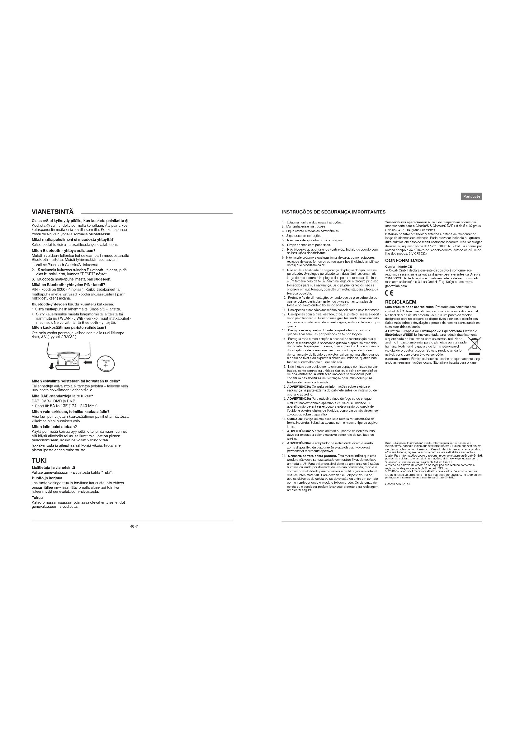 - Band III: 5A to 13F (174 - 240 MHz). Miten voin tarkistaa, toimiiko kaukosäädin? Aina kun painat jotain kaukosäätimen painiketta, näytössä vilkahtaa pieni punainen valo. Miten laite puhdistetaan? Käytä pehmeää kuivaa pyyhettä, ettei pinta naarmuunnu. Älä käytä alkoholia tai muita liuottimia kotelon pinnan puhdistamiseen, koska ne voivat vahingoittaa lakkakerrosta ja aiheuttaa sähköisiä vikoja. Irrota laite pistotulpasta ennen puhdistusta. TUKI Lisätietoja ja vianetsintä Valitse genevalab.com - sivustosta kohta ”Tuki”. Huolto ja korjaus Jos tuote vahingoittuu ja tarvitsee korjausta, ota yhteys omaan jälleenmyyjääsi. Etsi omalla alueellasi toimiva jälleenmyyjä genevalab.com - sivustosta. Takuu Katso omassa maassasi voimassa olevat erityiset ehdot genevalab.com - sivustosta. VIANETSINTÄ 1. Leia, mantenha e siga essas instruções.2. Mantenha essas instruções3. Fique atento a todas as advertências4. Siga todas as instruções5. Não use este aparelho próximo à água.6. Limpe apenas com pano seco.7. Não bloqueie as aberturas de ventilação. Instale de acordo com as instruções do fabricante.8. Não instale próximo a qualquer fonte de calor, como radiadores, registros de calor, fornos ou outros aparelhos (incluindo amplica-dores) que produzam calor.9. Não anule a nalidade de segurança do plugue do tipo terra ou polarizado. Um plugue polarizado tem duas lâminas, uma mais larga do que a outra. Um plugue do tipo terra tem duas lâminas e um terceiro pino de terra. A lâmina larga ou o terceiro pino são fornecidos para sua segurança. Se o plugue fornecido não se encaixar em sua tomada, consulte um eletricista para a troca da tomada obsoleta.10. Proteja o o de alimentação, evitando que se pise sobre ele ou que se dobre, particularmente nos plugues, nas tomadas de força e no ponto onde o o sai do aparelho.11. Use apenas extensões/acessórios especicados pelo fabricante.12. Use apenas com a guia, estrado, tripé, suporte ou mesa especi-cado pelo fabricante. Quando uma guia for usada, tome cuidado ao mover a combinação do aparelho/guia, evitando ferimento por queda. 13. Desligue esse aparelho durante tempestades com raios ou quando car sem uso por períodos de tempo longos.14. Entregue toda a manutenção a pessoal de manutenção quali-cado. A manutenção é necessária quando o aparelho tiver sido danicado de qualquer maneira, como quando o o ou a tomada do adaptador de corrente estiver danicado, quando houver derramamento de líquido ou objetos caírem no aparelho, quando o aparelho tiver sido exposto a chuva ou umidade, quando não funcionar normalmente ou quando cair.15. Não instale este equipamento em um espaço connado ou em-butido, como estante ou unidade similar, e deixe em condições de boa ventilação. A ventilação não deve ser impedida pela cobertura das aberturas de ventilação com itens como jornal, toalhas de mesa, cortinas etc.16. ADVERTÊNCIA: Consulte as informações sobre elétrica e segurança na parte externa do gabinete antes de instalar ou de operar o aparelho.17. ADVERTÊNCIA: Para reduzir o risco de fogo ou de choque elétrico, não exponha o aparelho à chuva ou à umidade. O aparelho não deverá ser exposto a gotejamento ou queda de líquido, e objetos cheios de líquidos, como vasos não devem ser colocados sobre o aparelho.18. CUIDADO: Perigo de explosão se a bateria for substituída de forma incorreta. Substitua apenas com o mesmo tipo ou equiva-lente.19. ADVERTÊNCIA: A bateria (bateria ou pacote de baterias) não deve ser exposta a calor excessivo como raio de sol, fogo ou similar.20. ADVERTÊNCIA: O adaptador de eletricidade direto é usado como dispositivo de desconexão e este dispositivo deverá permanecer facilmente operável.21. Descarte correto deste produto. Esta marca indica que este produto não deve ser descartado com outros lixos domésticos em toda a UE. Para evitar possível dano ao ambiente ou à saúde humana causado por descarte de lixo não controlado, recicle-o com responsabilidade para promover a reutilização sustentável dos recursos materiais. Para devolver seu dispositivo usado, use os sistemas de coleta ou de devolução ou entre em contato com o vendedor onde o produto foi comprado. Os sistemas de coleta ou o vendedor podem levar este produto para reciclagem ambiental segura.Temperaturas operacionais: A faixa de temperatura operacional recomendada para o Classic/S & Classic/S DAB+ é de 5 a 40 graus Celsius / 41 a 104 graus Fahrenheit.Baterias no telecomando: Mantenha a bateria do telecomando longe do alcance das crianças. Pode provocar incêndio ou queima-dura química em caso de manu-seamento incorreto. Não recarregar, desmontar, aquecer acima de 212 ºF (100 ºC). Substituir apenas por bateria do tipo e do número de modelo correto (bateria de célula de lítio tipo moeda, 3 V CR2032). CONFORMIDADE Conformidade CE A G-Lab GmbH declara que este dispositivo é conforme aos requisitos essenciais e às outras disposições relevantes da Diretiva 2014/53/CE. A declaração de con-formidade pode ser consultada mediante solicitação à G-Lab GmbH, Zug, Suíça ou em http://genevalab.com. RECICLAGEM. Este produto pode ser reciclado. Produtos que ostentem este símbolo NÃO devem ser eliminados com o lixo doméstico normal. No nal da vida útil do produto, leve-o a um ponto de recolha designado para reciclagem de dispositivos elétricos e eletrónicos. Saiba mais sobre a devolução e pontos de recolha consultando as suas auto-ridades locais. A Diretiva Europeia de Eliminação de Equipamento Elétrico e Eletrónico ( WEEE ) foi implementada para reduzir drasticamente a quantidade de lixo levada para os aterros, reduzindo assim o impacto ambiental para o planeta e para a saúde humana. Pedimos-lhe que aja de forma responsável reciclando produtos usados. Se este produto ainda for usável, considere oferecê-lo ou vendê-lo.Baterias usadas: Elimine as baterias usadas adequadamente, s