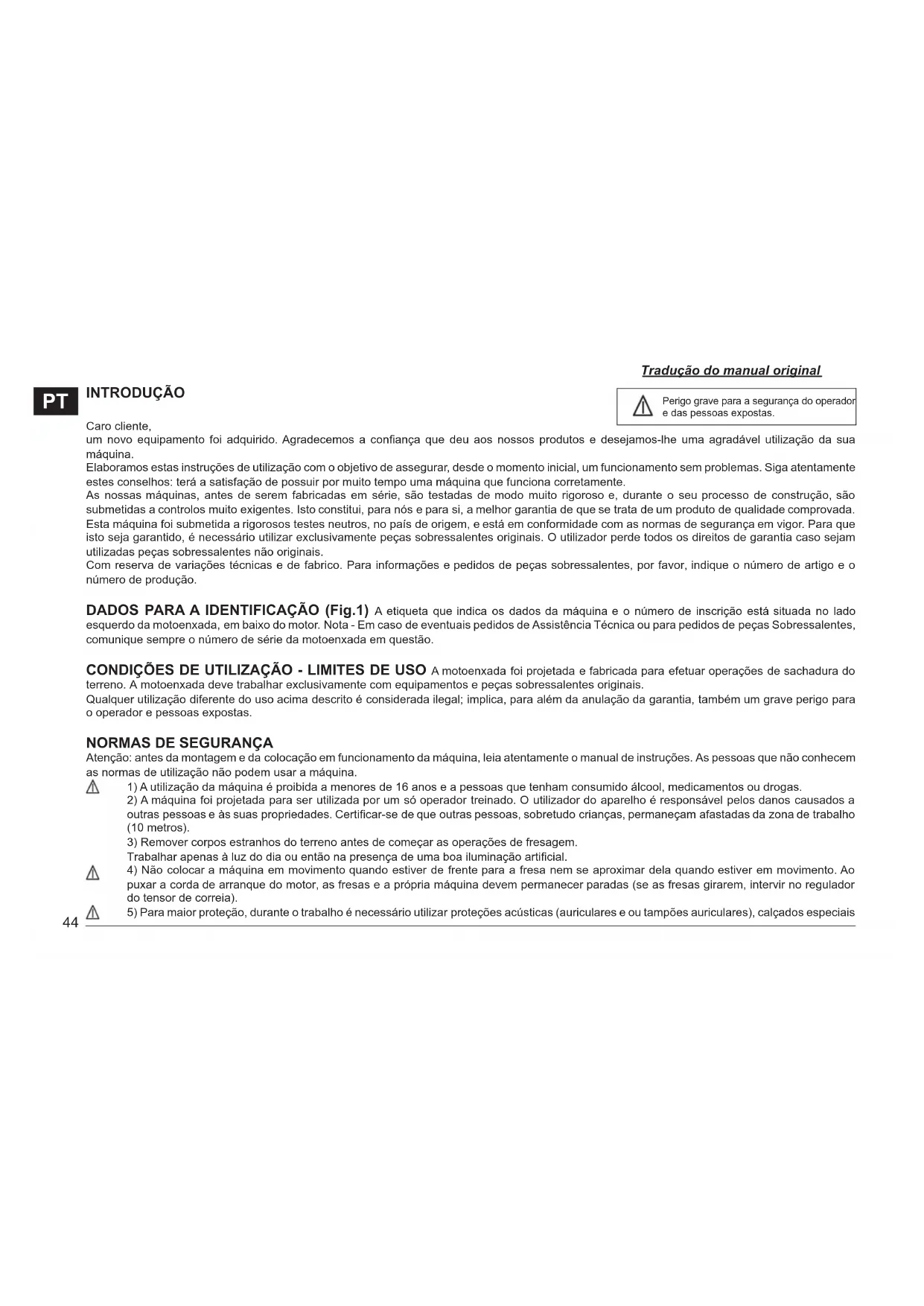 DEFECTEN Vooraleer interventies uit te voeren, moet u de kap van de onstekingskaars halen! Defect Oplossing De motor start niet Brandstof is op, bijtanken. Controleer of de gashendel op START staat. Controleer of de kap van de onstekingskaars goed is aangebracht. Controleer de staat van de ontstekingskaars en vervang eventueel. Controleer of de brandstofkraan open staat (alleen voor modellen met motor waar deze kraan is voorzien). Het vermogen van de motor neemt af Luchtlter is vuil, reinig de luchtlter. Controleer of er geen steentjes of aardklompen en vegetatie de rotatie van de frezen afremmen, verwijder die desgevallend. De frezen draaien niet Regel de stelschroeven van de transmissiekabel. Controleer of de frezen op de as bevestigd zijn. Wanneer u er niet in slaagt om het defect op te lossen, dient u zich te wenden tot een erkend assistentiecentrum. Lees de handleiding vooraleer de machine te gebruiken - Opgepast: rotatie frees Etiket koppeling Rijrichting vooruit en achteruit Etiket indicatie achteruit rijden 1 Fabrikant 2 Model 3 Bouwjaar 4 Serienummer artikel - Progressief 5 Gewicht 6 Vermogen in kW Etiket versnelling Etiket rotatie ploegstaart44 INTRODUÇÃO Caro cliente, um novo equipamento foi adquirido. Agradecemos a conança que deu aos nossos produtos e desejamos-lhe uma agradável utilização da sua máquina. Elaboramos estas instruções de utilização com o objetivo de assegurar, desde o momento inicial, um funcionamento sem problemas. Siga atentamente estes conselhos: terá a satisfação de possuir por muito tempo uma máquina que funciona corretamente. As nossas máquinas, antes de serem fabricadas em série, são testadas de modo muito rigoroso e, durante o seu processo de construção, são submetidas a controlos muito exigentes. Isto constitui, para nós e para si, a melhor garantia de que se trata de um produto de qualidade comprovada. Esta máquina foi submetida a rigorosos testes neutros, no país de origem, e está em conformidade com as normas de segurança em vigor. Para que isto seja garantido, é necessário utilizar exclusivamente peças sobressalentes originais. O utilizador perde todos os direitos de garantia caso sejam utilizadas peças sobressalentes não originais. Com reserva de variações técnicas e de fabrico. Para informações e pedidos de peças sobressalentes, por favor, indique o número de artigo e o número de produção. DADOS PARA A IDENTIFICAÇÃO (Fig.1) A etiqueta que indica os dados da máquina e o número de inscrição está situada no lado esquerdo da motoenxada, em baixo do motor. Nota - Em caso de eventuais pedidos de Assistência Técnica ou para pedidos de peças Sobressalentes, comunique sempre o número de série da motoenxada em questão. CONDIÇÕES DE UTILIZAÇÃO - LIMITES DE USO A motoenxada foi projetada e fabricada para efetuar operações de sachadura do terreno. A motoenxada deve trabalhar exclusivamente com equipamentos e peças sobressalentes originais. Qualquer utilização diferente do uso acima descrito é considerada ilegal; implica, para além da anulação da garantia, também um grave perigo para o operador e pessoas expostas.