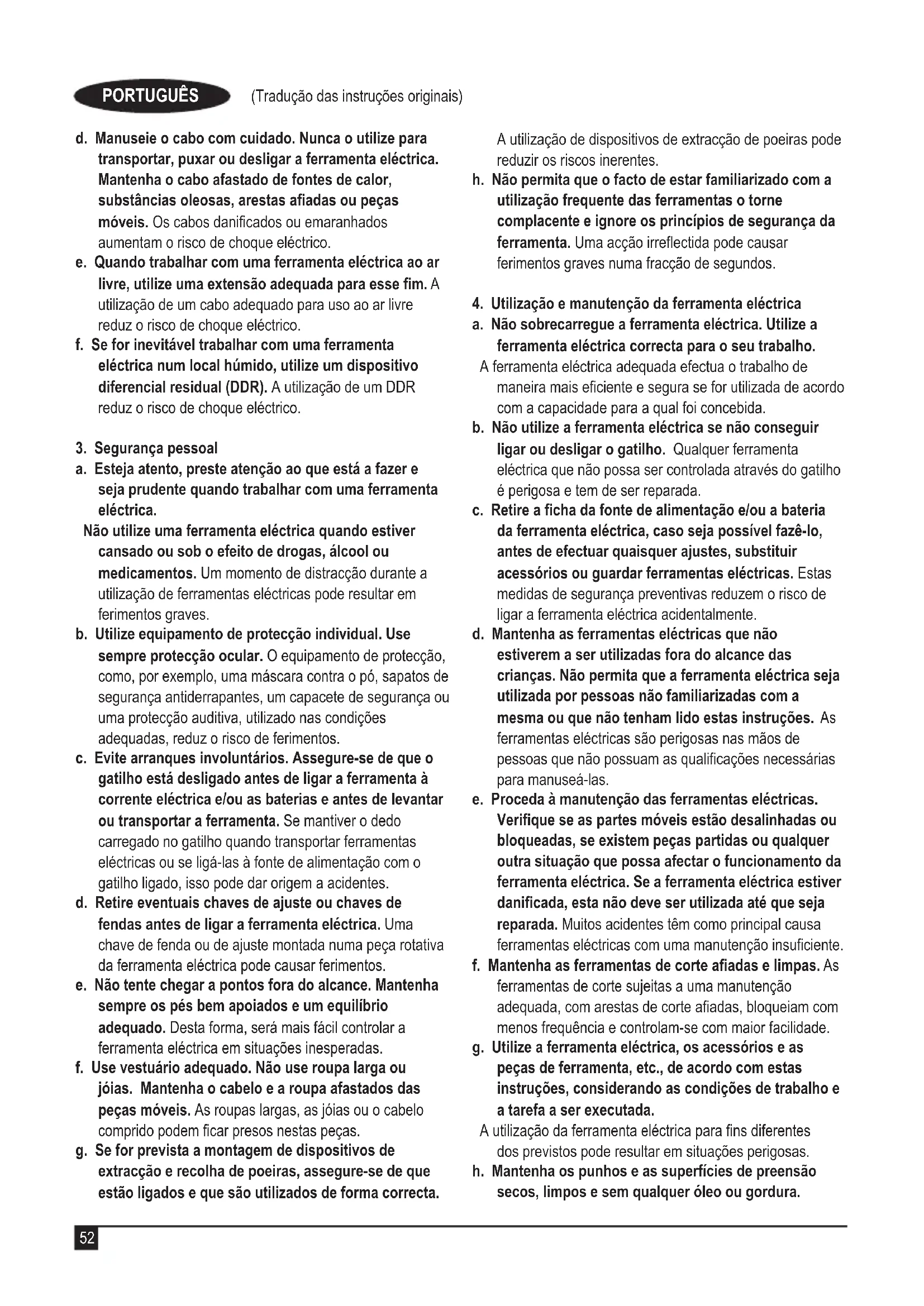 a. Não sobrecarregue a ferramenta eléctrica. Utilize a ferramenta eléctrica correcta para o seu trabalho. A ferramenta eléctrica adequada efectua o trabalho de maneira mais eciente e segura se for utilizada de acordo com a capacidade para a qual foi concebida. b. Não utilize a ferramenta eléctrica se não conseguir ligar ou desligar o gatilho. Qualquer ferramenta eléctrica que não possa ser controlada através do gatilho é perigosa e tem de ser reparada. c. Retire a cha da fonte de alimentação e/ou a bateria da ferramenta eléctrica, caso seja possível fazê-lo, antes de efectuar quaisquer ajustes, substituir acessórios ou guardar ferramentas eléctricas. Estas medidas de segurança preventivas reduzem o risco de ligar a ferramenta eléctrica acidentalmente. d. Mantenha as ferramentas eléctricas que não estiverem a ser utilizadas fora do alcance das crianças. Não permita que a ferramenta eléctrica seja utilizada por pessoas não familiarizadas com a mesma ou que não tenham lido estas instruções. As ferramentas eléctricas são perigosas nas mãos de pessoas que não possuam as qualicações necessárias para manuseá-las. e. Proceda à manutenção das ferramentas eléctricas. Verique se as partes móveis estão desalinhadas ou bloqueadas, se existem peças partidas ou qualquer outra situação que possa afectar o funcionamento da ferramenta eléctrica. Se a ferramenta eléctrica estiver danicada, esta não deve ser utilizada até que seja reparada. Muitos acidentes têm como principal causa ferramentas eléctricas com uma manutenção insuciente. f. Mantenha as ferramentas de corte aadas e limpas. As ferramentas de corte sujeitas a uma manutenção adequada, com arestas de corte aadas, bloqueiam com menos frequência e controlam-se com maior facilidade. g. Utilize a ferramenta eléctrica, os acessórios e as peças de ferramenta, etc., de acordo com estas instruções, considerando as condições de trabalho e a tarefa a ser executada. A utilização da ferramenta eléctrica para ns diferentes dos previstos pode resultar em situações perigosas. h. Mantenha os punhos e as superfícies de preensão secos, limpos e sem qualquer óleo ou gordura.53 (Tradução das instruções originais) PORTUGUÊS Se o punho estiver escorregadio e as superfícies de preensão tiverem gordura, isso não permite um manuseamento e controlo seguros da ferramenta em situações inesperadas.