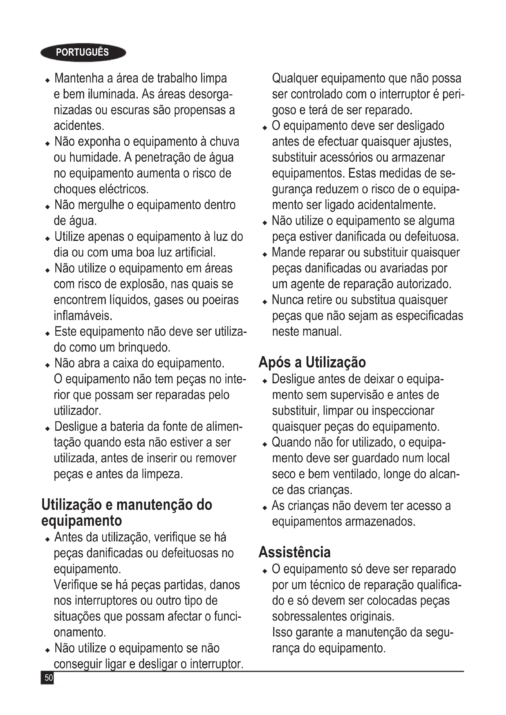 (Traducción de las instrucciones originales) ESPAÑOL (Tradução das instruções originais) PORTUGUÊSu Mantenha a área de trabalho limpa e bem iluminada. As áreas desorga- nizadas ou escuras são propensas a acidentes. u Não exponha o equipamento à chuva ou humidade. A penetração de água no equipamento aumenta o risco de choques eléctricos. u Não mergulhe o equipamento dentro de água. u Utilize apenas o equipamento à luz do dia ou com uma boa luz articial. u Não utilize o equipamento em áreas com risco de explosão, nas quais se encontrem líquidos, gases ou poeiras inamáveis. u Este equipamento não deve ser utiliza- do como um brinquedo. u Não abra a caixa do equipamento. O equipamento não tem peças no inte- rior que possam ser reparadas pelo utilizador. u Desligue a bateria da fonte de alimen- tação quando esta não estiver a ser utilizada, antes de inserir ou remover peças e antes da limpeza. Utilização e manutenção do equipamento u Antes da utilização, verique se há peças danicadas ou defeituosas no equipamento. Verique se há peças partidas, danos nos interruptores ou outro tipo de situações que possam afectar o funci- onamento. u Não utilize o equipamento se não conseguir ligar e desligar o interruptor. Qualquer equipamento que não possa ser controlado com o interruptor é peri- goso e terá de ser reparado. u O equipamento deve ser desligado antes de efectuar quaisquer ajustes, substituir acessórios ou armazenar equipamentos. Estas medidas de se- gurança reduzem o risco de o equipa- mento ser ligado acidentalmente. u Não utilize o equipamento se alguma peça estiver danicada ou defeituosa. u Mande reparar ou substituir quaisquer peças danicadas ou avariadas por um agente de reparação autorizado. u Nunca retire ou substitua quaisquer peças que não sejam as especicadas neste manual. Após a Utilização u Desligue antes de deixar o equipa- mento sem supervisão e antes de substituir, limpar ou inspeccionar quaisquer peças do equipamento. u Quando não for utilizado, o equipa- mento deve ser guardado num local seco e bem ventilado, longe do alcan- ce das crianças. u As crianças não devem ter acesso a equipamentos armazenados. Assistência u O equipamento só deve ser reparado por um técnico de reparação qualica- do e só devem ser colocadas peças sobressalentes originais. Isso garante a manutenção da segu- rança do equipamento.