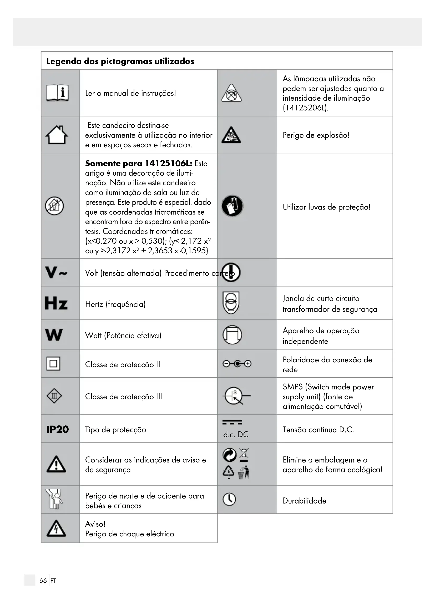 Este candeeiro destina-se exclusivamente à utilização no interior e em espaços secos e fechados. Perigo de explosão! Somente para 14125106L: Este artigo é uma decoração de ilumi- nação. Não utilize este candeeiro como iluminação da sala ou luz de presença. Este produto é especial, dado que as coordenadas tricromáticas se encontram fora do espectro entre parên- tesis. Coordenadas tricromáticas: (x<0,270 ou x > 0,530); (y<-2,172 x² ou y >-2,3172 x² + 2,3653 x -0,1595). Utilizar luvas de proteção! Volt (tensão alternada) Procedimento correto Hertz (frequência) Janela de curto circuito transformador de segurança Watt (Potência efetiva) Aparelho de operação independente Classe de protecção II Polaridade da conexão de rede Classe de protecção III SMPS (Switch mode power supply unit) (fonte de alimentação comutável) IP20 Tipo de protecção d.c. DC Tensão contínua D.C. Considerar as indicações de aviso e de segurança!