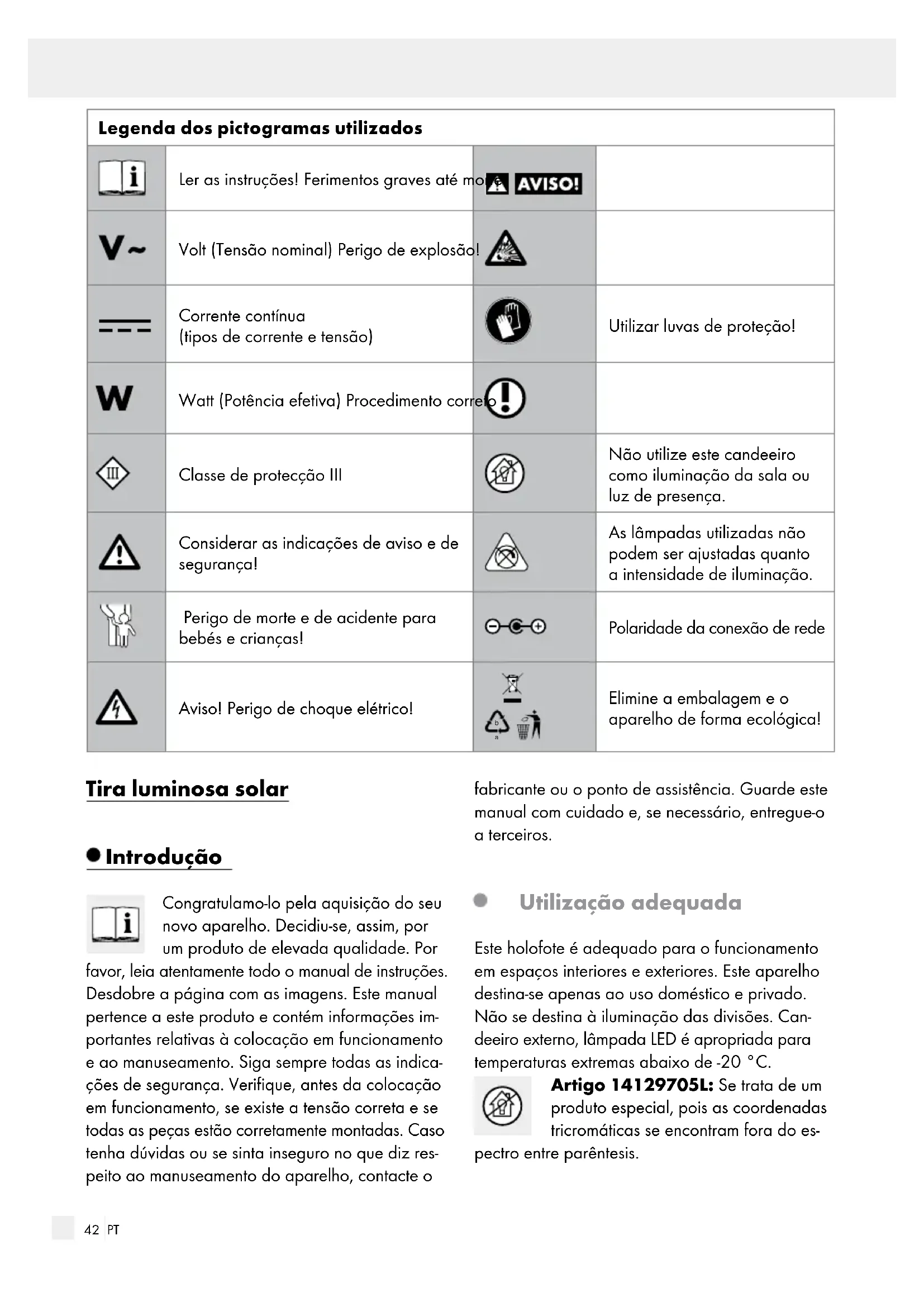 Elimine a embalagem e o aparelho de forma ecológica! Tira luminosa solar Introdução Congratulamo-lo pela aquisição do seu novo aparelho. Decidiu-se, assim, por um produto de elevada qualidade. Por favor, leia atentamente todo o manual de instruções. Desdobre a página com as imagens. Este manual pertence a este produto e contém informações im- portantes relativas à colocação em funcionamento e ao manuseamento. Siga sempre todas as indica- ções de segurança. Verifique, antes da colocação em funcionamento, se existe a tensão correta e se todas as peças estão corretamente montadas. Caso tenha dúvidas ou se sinta inseguro no que diz res- peito ao manuseamento do aparelho, contacte o fabricante ou o ponto de assistência. Guarde este manual com cuidado e, se necessário, entregue-o a terceiros. Utilização adequada Este holofote é adequado para o funcionamento em espaços interiores e exteriores. Este aparelho destina-se apenas ao uso doméstico e privado. Não se destina à iluminação das divisões. Can- deeiro externo, lâmpada LED é apropriada para temperaturas extremas abaixo de -20 °C. Artigo 14129705L: Se trata de um produto especial, pois as coordenadas tricromáticas se encontram fora do es- pectro entre parêntesis.43 PT Introdução / SegurançaIntrodução Coordenadas tricromáticas: (x <0,270 ou x >0,530); (y <-2,172 x² ou y >-2,3172 x² + 2,3653 x -0,1595). Material fornecido Após desembalar o aparelho, verifique sempre o material fornecido quanto à integridade, bem como o estado do aparelho. 1 Tira luminosa solar, Modelo 14129705L e 14129805L com sensor de escurecimento 1 Painel solar 4 Anéis de silicone 1 Tubo de suporte 1 Estaca 1 Fitas adesivas 1 Manual de instruções Descrição das peças