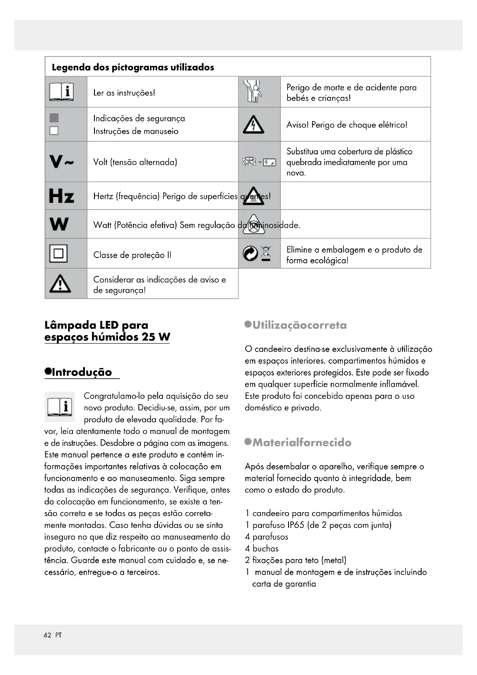 Para casos fuera de garantía: Devuelva el artículo sin reparar abonando los gastos de transporte incurridos. Indíqueme los gastos. Repare el artículo cargándome el coste.41 PT Garantía / Atención al cliente Legenda dos pictogramas utilizados .................................................................. Página 42 Introdução .................................................................................................................................. Página 42 Utilização correta ........................................................................................................................... Página 42 Material fornecido .......................................................................................................................... Página 42 Descrição das peças ...................................................................................................................... Página 43 Dados técnicos ................................................................................................................................ Página 43 Segurança................................................................................................................................... Página 43 Indicações de segurança ............................................................................................................... Página 43 Preparação ................................................................................................................................ Página 44 Ferramentas e material necessário ................................................................................................ Página 44 Antes da instalação ............................................................................................................ Página 44 Colocação em funcionamento ................................................................................... Página 44 Montar o candeeiro........................................................................................................................ Página 44 Ligar / desligar o candeeiro ........................................................................................................... Página 45 Manutenção e limpeza .................................................................................................... Página 45 Eliminação .................................................................................................................................. Página 45 Declaração de conformidade .................................................................................... Página 45 Garantia / Assistência técnica .................................................................................... Página 45 Garantia .......................................................................................................................................... Página 45 Endereço da assistência ................................................................................................................. Página 46 Certificado de garantia .................................................................................................................. Página 46 Índice42 PT Introdução / Segurança Introdução Lâmpada LED para espaços húmidos 25 W Introdução Congratulamo-lo pela aquisição do seu novo produto. Decidiu-se, assim, por um produto de elevada qualidade. Por fa- vor, leia atentamente todo o manual de montagem e de instruções. Desdobre a página com as imagens. Este manual pertence a este produto e contém in- formações importantes relativas à colocação em funcionamento e ao manuseamento. Siga sempre todas as indicações de segurança. Verifique, antes da colocação em funcionamento, se existe a ten- são correta e se todas as peças estão correta- mente montadas. Caso tenha dúvidas ou se sinta inseguro no que diz respeito ao manuseamento do produto, contacte o fabricante ou o ponto de assis- tência. Guarde este manual com cuidado e, se ne- cessário, entregue-o a terceiros. Utilização correta O candeeiro destina-se exclusivamente à utilização em espaços interiores. compartimentos húmidos e espaços exteriores protegidos. Este pode ser fixado em qualquer superfície normalmente inflamável. Este produto foi concebido apenas para o uso doméstico e privado. Material fornecido Após desembalar o aparelho, verifique sempre o material fornecido quanto à integridade, bem como o estado do produto. 1 candeeiro para compartimentos húmidos 1 parafuso IP65 (de 2 peças com junta) 4 parafusos 4 buchas 2 fixações para teto (metal) 1 manual de montagem e de instruções incluindo carta de garantia Legenda dos pictogramas utilizados Ler as instruções! Perigo de morte e de acidente para bebés e crianças! Indicações de segurança Instruções de manuseio Aviso! Perigo de choque elétrico! Volt (tensão alternada) Substitua uma cobertura de plástico quebrada imediatamente por uma nova. Hertz (frequência) Perigo de superfícies quentes! Watt (Potência efetiva) Sem regulação da luminosidade. Classe de proteção II Elimine a embalagem e o produto de forma ecológica! Considerar as indicações de aviso e de segurança!43 PT Introdução / Segurança Introdução Descrição das peças