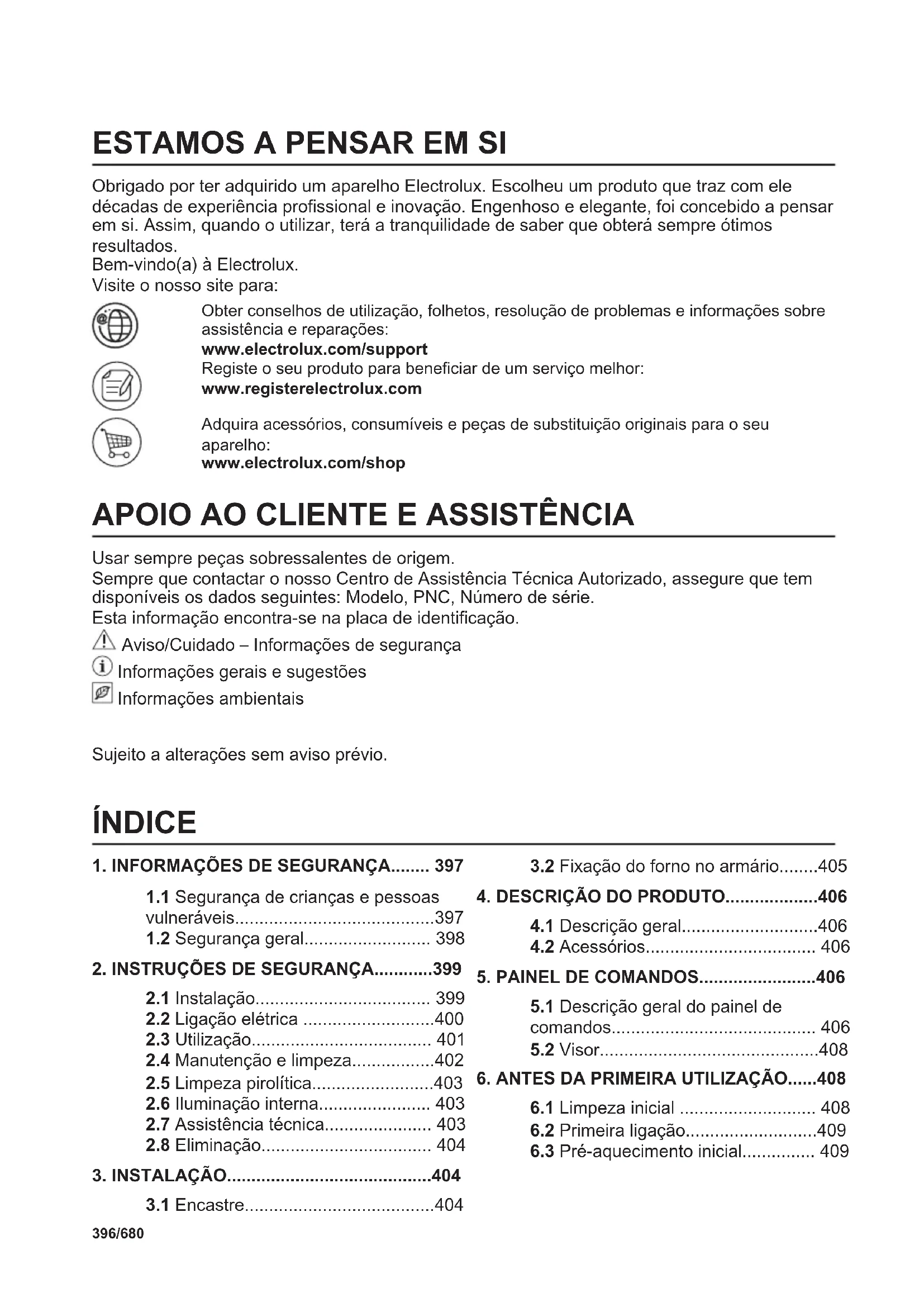 Usar sempre peças sobressalentes de origem. Sempre que contactar o nosso Centro de Assistência Técnica Autorizado, assegure que tem disponíveis os dados seguintes: Modelo, PNC, Número de série. Esta informação encontra-se na placa de identificação. Aviso/Cuidado – Informações de segurança Informações gerais e sugestões Informações ambientais Sujeito a alterações sem aviso prévio. ÍNDICE