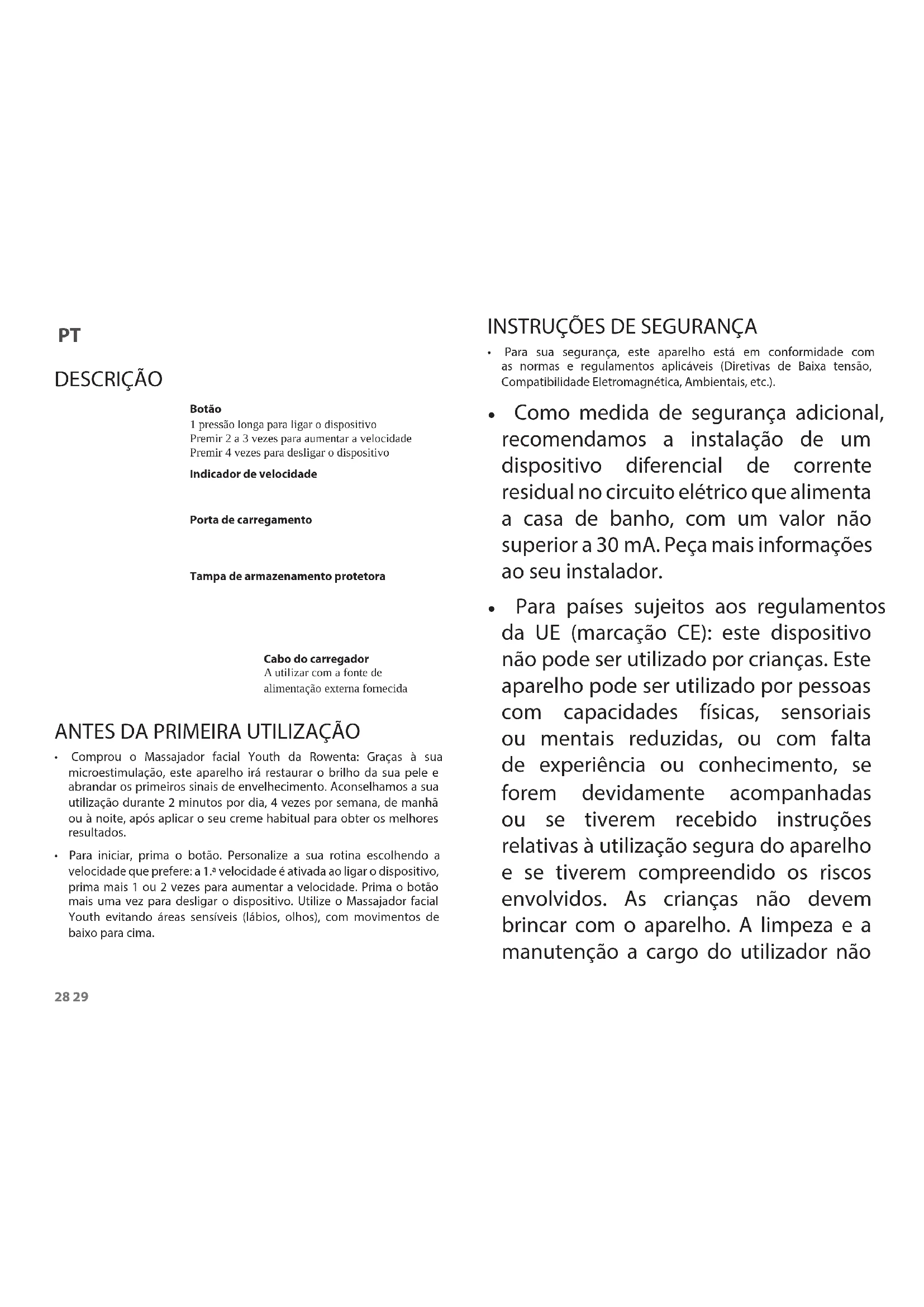 - Este aparelho destina-se a cuidados da pele, não é um dispositivo médico. Se estiver a tomar medicação ou tiver alguma doença, contacte o seu médico antes de utilizar o aparelho. Certique-se de que utiliza o dispositivo apenas na pele do rosto e não nos olhos ou no corpo. Utilize sempre o dispositivo em movimento na sua pele.
