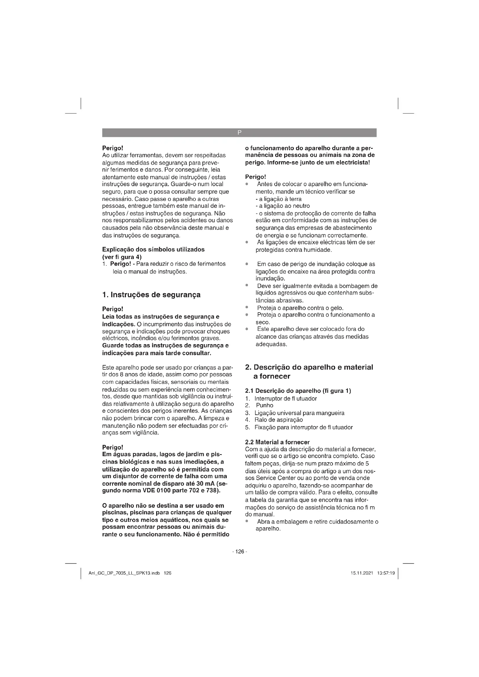 Perigo! Leia todas as instruções de segurança e indicações. O incumprimento das instruções de segurança e indicações pode provocar choques eléctricos, incêndios e/ou ferimentos graves. Guarde todas as instruções de segurança e indicações para mais tarde consultar. Este aparelho pode ser usado por crianças a par- tir dos 8 anos de idade, assim como por pessoas com capacidades físicas, sensoriais ou mentais reduzidas ou sem experiência nem conhecimen- tos, desde que mantidas sob vigilância ou instruí- das relativamente à utilização segura do aparelho e conscientes dos perigos inerentes. As crianças não podem brincar com o aparelho. A limpeza e manutenção não podem ser efectuadas por cri- anças sem vigilância. Perigo! Em águas paradas, lagos de jardim e pis- cinas biológicas e nas suas imediações, a utilização do aparelho só é permitida com um disjuntor de corrente de falha com uma corrente nominal de disparo até 30 mA (se- gundo norma VDE 0100 parte 702 e 738). O aparelho não se destina a ser usado em piscinas, piscinas para crianças de qualquer tipo e outros meios aquáticos, nos quais se possam encontrar pessoas ou animais du- rante o seu funcionamento. Não é permitido o funcionamento do aparelho durante a per- manência de pessoas ou animais na zona de perigo. Informe-se junto de um electricista! Perigo!