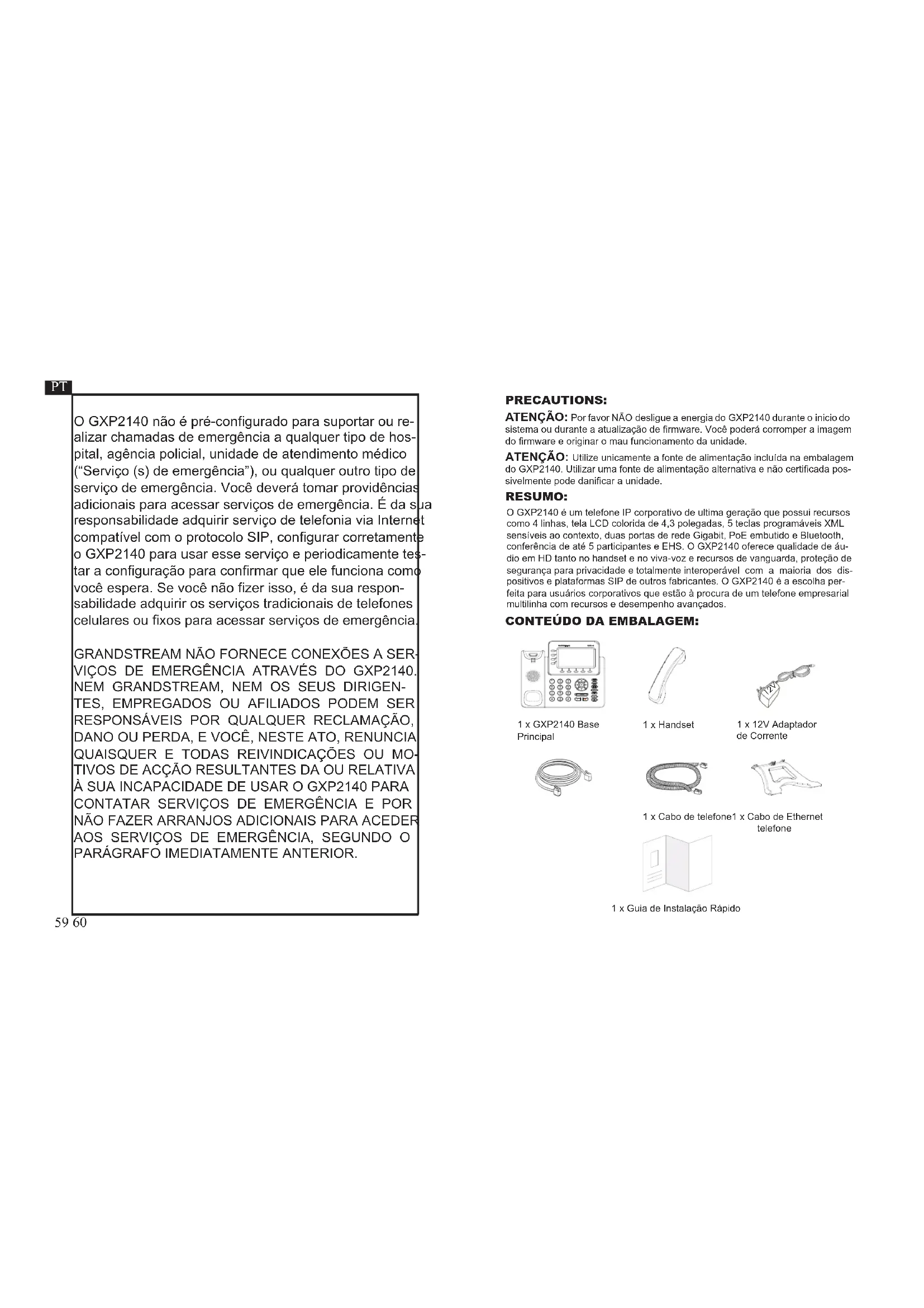 O GXP2140 não é pré-congurado para suportar ou re- alizar chamadas de emergência a qualquer tipo de hos- pital, agência policial, unidade de atendimento médico (“Serviço (s) de emergência”), ou qualquer outro tipo de serviço de emergência. Você deverá tomar providências adicionais para acessar serviços de emergência. É da sua responsabilidade adquirir serviço de telefonia via Internet compatível com o protocolo SIP, congurar corretamente o GXP2140 para usar esse serviço e periodicamente tes- tar a conguração para conrmar que ele funciona como você espera. Se você não zer isso, é da sua respon- sabilidade adquirir os serviços tradicionais de telefones celulares ou xos para acessar serviços de emergência. GRANDSTREAM NÃO FORNECE CONEXÕES A SER- VIÇOS DE EMERGÊNCIA ATRAVÉS DO GXP2140.