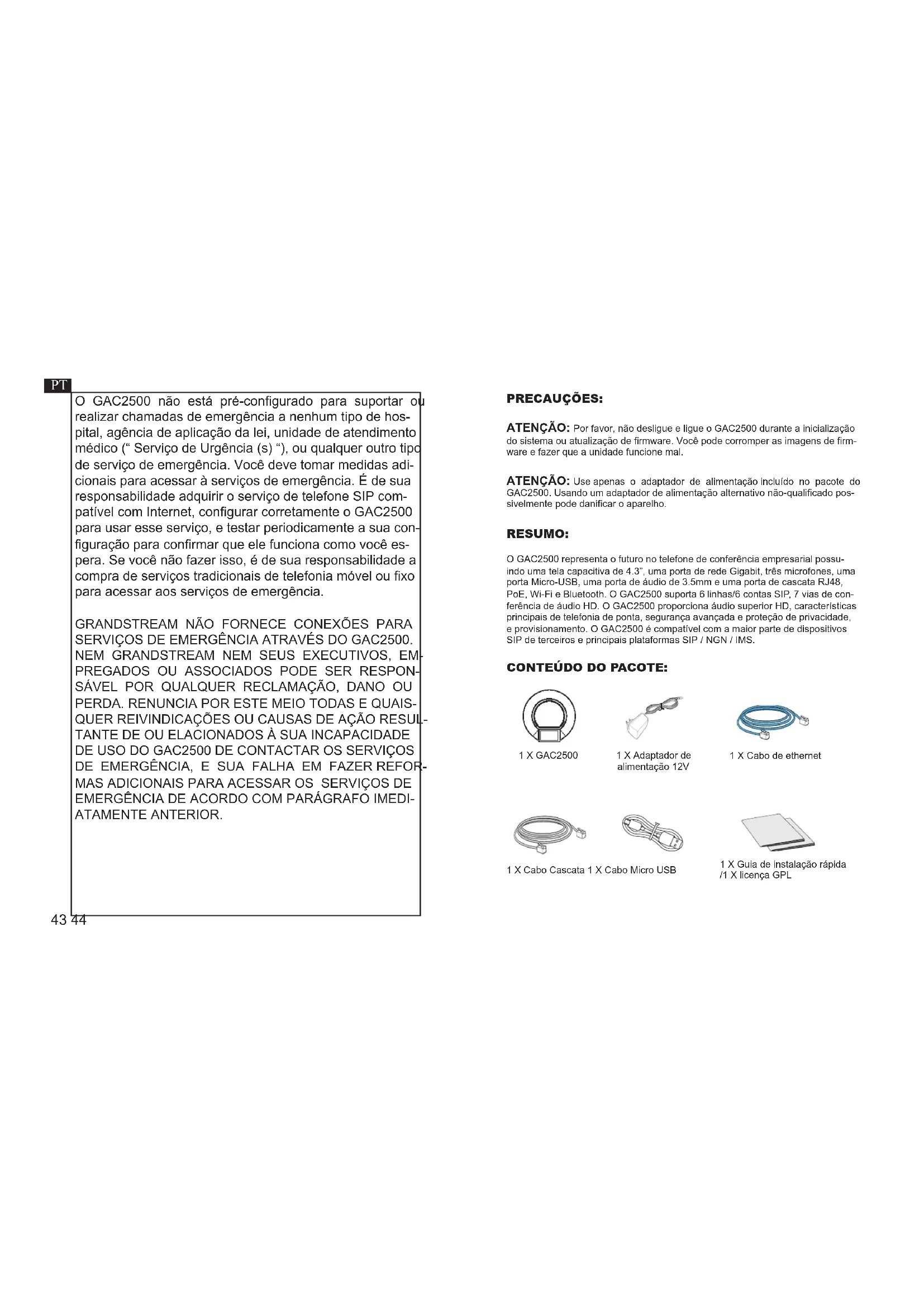 КОНФИГУРАЦИЯ УСТРОЙСТВА: Настройка GAC2500 с помощью веб бозревателя: Настройка GAC2500 с помощью сенсорного экрана: Примечание. Подробное руководство пользователя можно загрузить здесь. http://www.grandstream.com/support43 44 O GAC2500 não está pré-congurado para suportar ou realizar chamadas de emergência a nenhum tipo de hos- pital, agência de aplicação da lei, unidade de atendimento médico (“ Serviço de Urgência (s) “), ou qualquer outro tipo de serviço de emergência. Você deve tomar medidas adi- cionais para acessar à serviços de emergência. É de sua responsabilidade adquirir o serviço de telefone SIP com- patível com Internet, congurar corretamente o GAC2500 para usar esse serviço, e testar periodicamente a sua con- guração para conrmar que ele funciona como você es- pera. Se você não fazer isso, é de sua responsabilidade a compra de serviços tradicionais de telefonia móvel ou xo para acessar aos serviços de emergência. GRANDSTREAM NÃO FORNECE CONEXÕES PARA SERVIÇOS DE EMERGÊNCIA ATRAVÉS DO GAC2500.