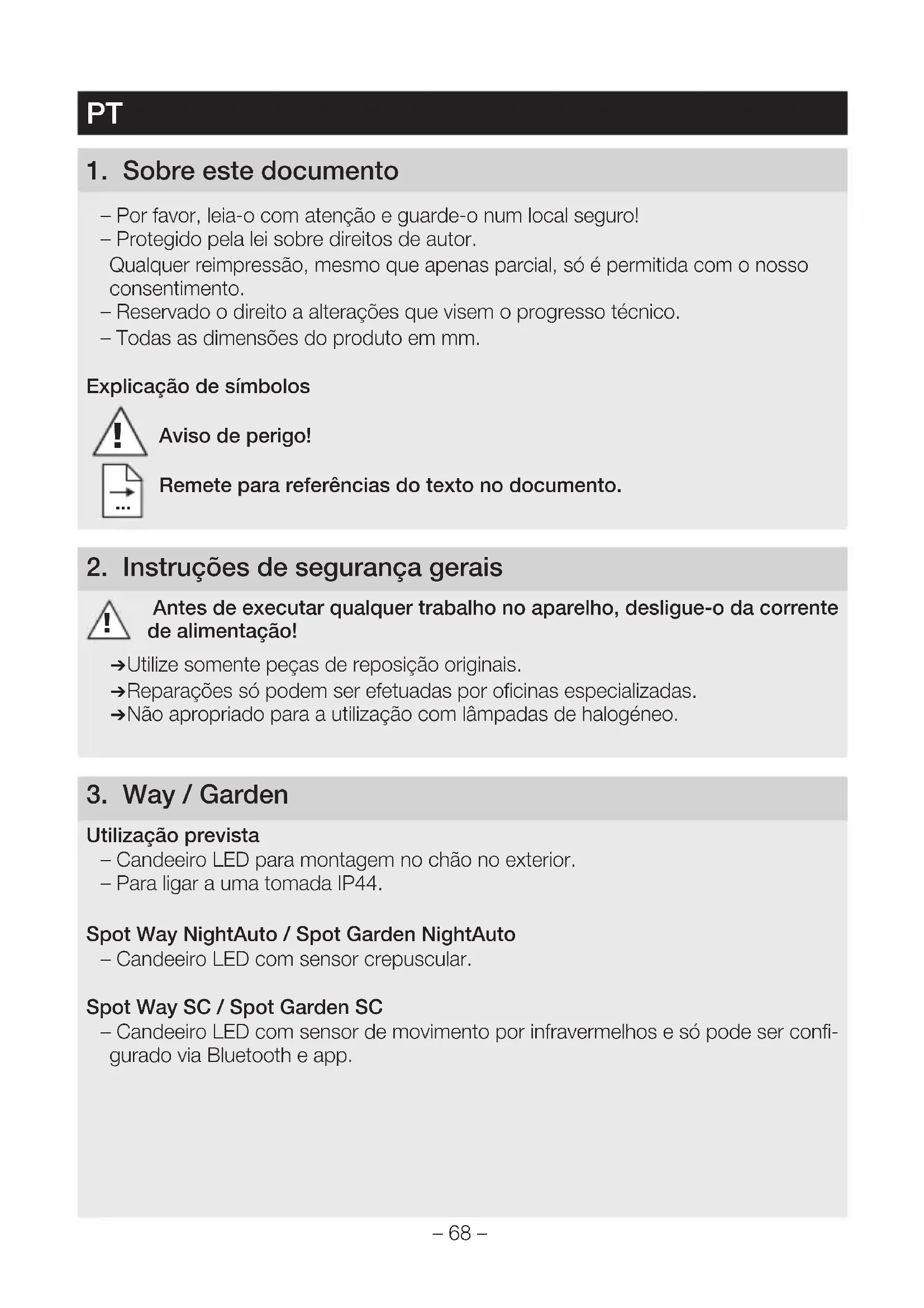 Utilização prevista – Candeeiro LED para montagem no chão no exterior. – Para ligar a uma tomada IP44. Spot Way NightAuto/Spot Garden NightAuto – Candeeiro LED com sensor crepuscular. Spot Way SC/Spot Garden SC – Candeeiro LED com sensor de movimento por infravermelhos e só pode ser confi- gurado via Bluetooth e app.– 69 – Utilização para fins não previstos – A intensidade de iluminação da armadura LED não é regulável. Intensidade não regulável Itens fornecidos Spot Way (Fig. 3.1) – Candeeiro incluindo coluna, placa de base e cabo de alimentação com ficha elétrica – Três parafusos – Três buchas Itens fornecidos Spot Garden (Fig. 3.2) – Candeeiro incluindo cabo de alimentação com ficha elétrica – Espigão – Dois parafusos Dimensões do produto Spot Way (Fig. 3.3) Dimensões do produto Spot Garden (Fig. 3.4) Resumo dos produtos (Fig. 3.5 – 3.10) A Corpo do candeeiro B Sensor de movimento (apenas Spot Way / Spot Garden SC) C Sensor crepuscular (apenas Spot Way/Garden NightAuto) D Regulação crepuscular (apenas Spot Way/Garden NightAuto) E Coluna com placa de base (apenas Spot Way) F Espigão (apenas Spot Garden) G Cabo de alimentação com ficha elétrica Área de deteção Spot Way / Spot Garden SC (Fig. 3.11 – 3.16) Distribuição da intensidade de iluminação (Fig. 3.17)