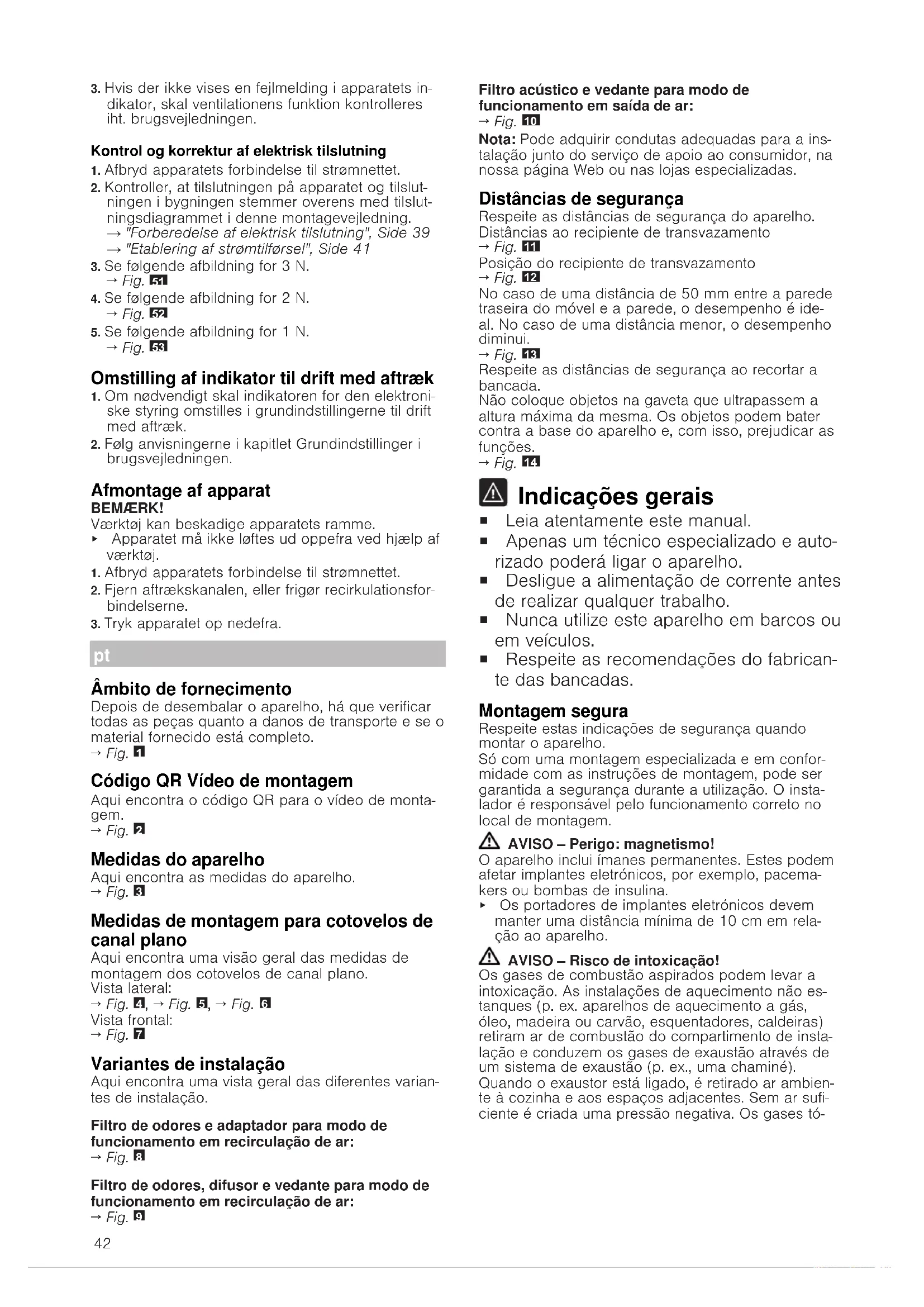 Indicações gerais ¡ Leia atentamente este manual. ¡ Apenas um técnico especializado e auto- rizado poderá ligar o aparelho. ¡ Desligue a alimentação de corrente antes de realizar qualquer trabalho. ¡ Nunca utilize este aparelho em barcos ou em veículos. ¡ Respeite as recomendações do fabrican- te das bancadas. Montagem segura Respeite estas indicações de segurança quando montar o aparelho. Só com uma montagem especializada e em confor- midade com as instruções de montagem, pode ser garantida a segurança durante a utilização. O insta- lador é responsável pelo funcionamento correto no local de montagem. AVISO‒Perigo: magnetismo! O aparelho inclui ímanes permanentes. Estes podem afetar implantes eletrónicos, por exemplo, pacema- kers ou bombas de insulina. ▶ Os portadores de implantes eletrónicos devem manter uma distância mínima de 10cm em rela- ção ao aparelho. AVISO‒Risco de intoxicação! Os gases de combustão aspirados podem levar a intoxicação. As instalações de aquecimento não es- tanques (p. ex. aparelhos de aquecimento a gás, óleo, madeira ou carvão, esquentadores, caldeiras) retiram ar de combustão do compartimento de insta- lação e conduzem os gases de exaustão através de um sistema de exaustão (p. ex., uma chaminé). Quando o exaustor está ligado, é retirado ar ambien- te à cozinha e aos espaços adjacentes. Sem ar sufi- ciente é criada uma pressão negativa. Os gases tó-43 xicos da chaminé ou da conduta de extração voltam a ser aspirados para os espaços habitacionais. ▶ Certifique-se de que há sempre reposição de ar fresco suficiente quando o aparelho é utilizado no modo de funcionamento em saída de ar em con- junto com instalações de aquecimento não estan- ques. ▶ Um funcionamento isento de perigos apenas é possível, se a pressão negativa no compartimento da instalação de aquecimento não ultrapassar os 4 Pa (0,04 mbar). Isto pode ser conseguido se o ar necessário para a combustão puder ser repos- to através de aberturas que não fechem, p. ex., em portas, janelas, em conjunto com uma caixa de entrada/saída de ar ou outras medidas técni- cas, que permitam uma circulação de ar suficien- te para a combustão. Uma caixa de entrada/saída de ar por si só, não garante a manutenção do va- lor limite. ▶ Consulte sempre a entidade responsável para avaliar a interligação da ventilação de toda a casa e sugerir as medidas adequadas de ventilação. ▶ Se o aparelho funcionar exclusivamente em recir- culação de ar, não existe qualquer limitação na sua utilização. AVISO‒Risco de incêndio! Gorduras acumuladas no filtro de gorduras podem incendiar-se. ▶ Nunca trabalhe com uma chama aberta perto do aparelho (p.ex., flambear). ▶ Só deve instalar o aparelho perto de um fogão para combustíveis sólidos (p. ex., madeira ou car- vão) se existir uma cobertura fechada e não amo- vível. Não pode haver produção de faíscas. AVISO‒Risco de ferimentos! Quaisquer modificações na instalação elétrica ou mecânica são perigosas e podem provocar falhas de funcionamento. ▶ Não efetue modificações na instalação elétrica ou mecânica. As peças que ficam acessíveis durante a montagem podem ter arestas afiadas e originar ferimentos de corte. ▶ Use luvas de proteção. O aparelho é pesado. ▶ São necessárias 2 pessoas para transportar o aparelho. ▶ Utilize apenas meios auxiliares apropriados. AVISO‒Risco de asfixia! As crianças podem colocar o material de embala- gem sobre a cabeça ou enrolar-se no mesmo e su- focar. ▶ Manter o material de embalagem fora do alcance das crianças. ▶ Não permitir que as crianças brinquem com o ma- terial de embalagem. AVISO‒Risco de intoxicação! Os gases de combustão aspirados podem levar a intoxicação. ▶ Não encaminhe o ar evacuado para uma chaminé de exaustão de fumos ou de gases queimados que esteja em funcionamento. ▶ Não encaminhe o ar evacuado para uma caixa de ar que sirva para a ventilação de locais com larei- ras instaladas. ▶ Caso o ar evacuado tenha de ser encaminhado para uma chaminé de exaustão de fumos ou de gases queimados que não esteja em funciona- mento, é necessária uma autorização da entidade supervisora da instalação dos aparelhos de quei- ma. Os gases de combustão aspirados podem levar a intoxicação. ▶ Se for instalado um exaustor com instalação de aquecimento não estanque, é necessário munir a alimentação de corrente do exaustor com um cir- cuito de segurança adequado. Indicações relativas à ligação elétrica Para poder efetuar a ligação elétrica do aparelho em segurança, respeite estas indicações. AVISO‒Risco de choque elétrico! Deve existir a possibilidade de desligar o aparelho da rede elétrica em qualquer altura. O aparelho só pode ser ligado a uma tomada de ligação instalada em conformidade com as normas. ▶ Na instalação elétrica fixa é necessário montar um dispositivo de seccionamento omnipolar em con- formidade com as condições da categoria de so- bretensão III e com as regras de instalação. ▶ Apenas um eletricista pode efetuar a instalação elétrica fixa. Recomendamos a instalação de um disjuntor diferencial (interruptor de corrente dife- rencial residual) no circuito de corrente da alimen- tação do aparelho. ¡ Não dobre nem entale o cabo de ligação e man- tenha-o afastado de arestas afiadas. ¡ Instale o cabo de ligação de forma a que não to- que em partes quentes do aparelho. ¡ Utilize apenas o cabo de ligação fornecido junta- mente com o aparelho ou pela Assistência técni- ca. ¡ Este aparelho corresponde às determinações da UE sobre supressão de interferências. ¡ O aparelho corresponde à classe de proteção 1 e só pode ser usado com uma ligação com condu- tor de proteção. ¡ O fabricante não assume qualquer responsabilida- de por anomalias de funcionamento ou possíveis danos causados por um